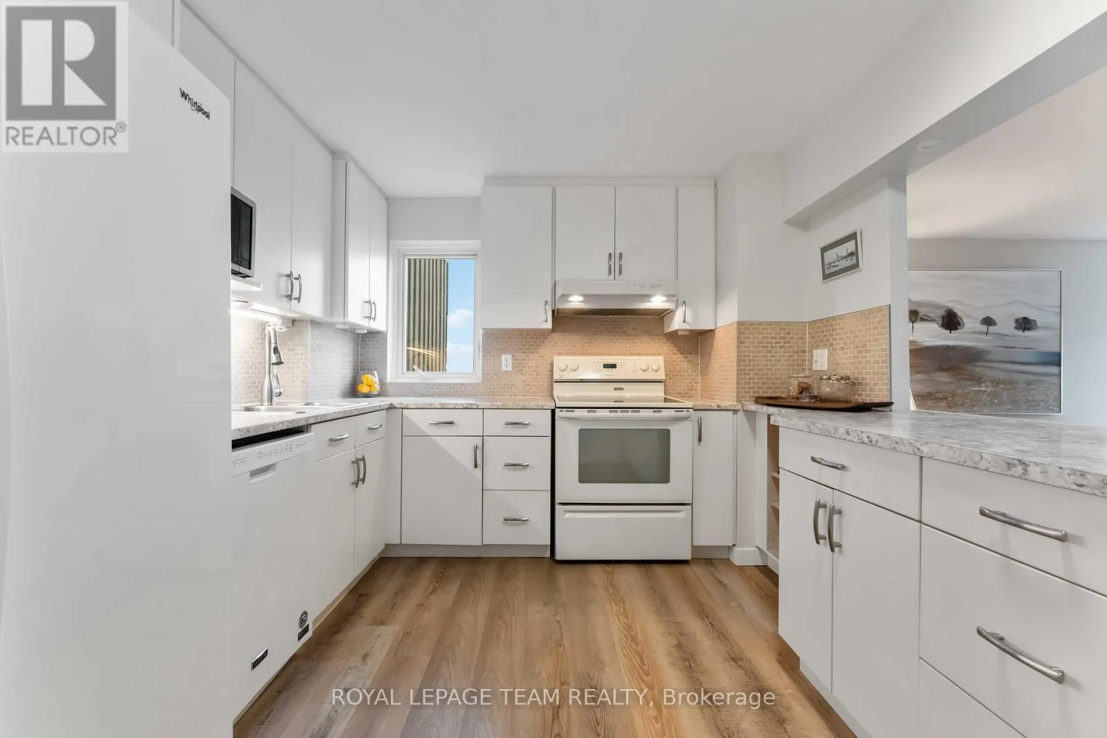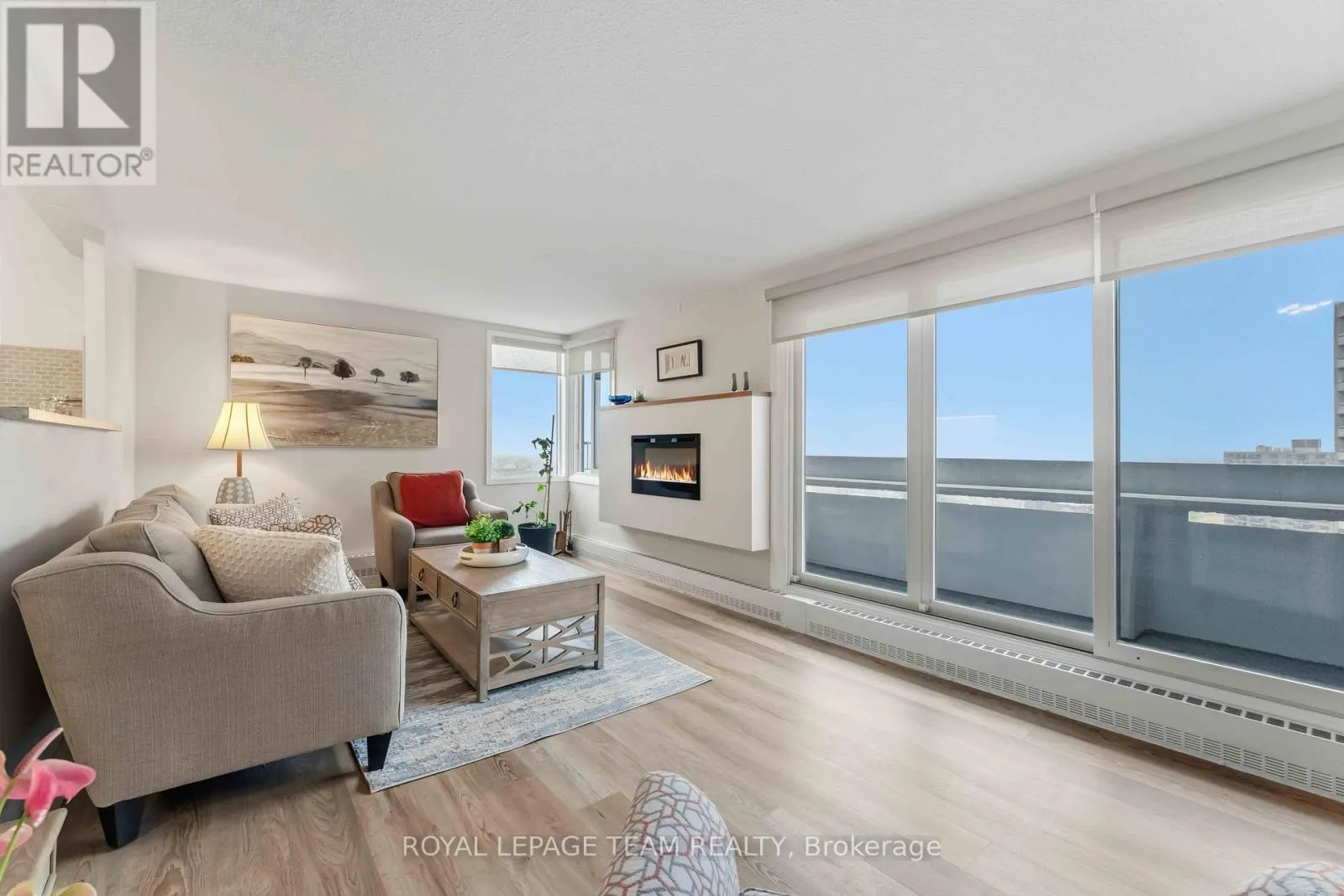 Cross Streets: Richmond and McEwen. ** Directions: From Richmond Rd, North on McEwen to Ambleside. Gorgeous corner unit with 2 balconies with South/West exposure providing great natural light, views and sunsets. This unit has been completely renovated in peaceful tones with a cozy atmosphere and is move-in ready. 2 bedrooms + den offering 960 sf of well planned living space. Spacious living room with ample windows, custom blinds and beautiful fireplace insert. Adjacent den is a great space for guests or office/hobby room. Updated kitchen is open to the living room and provides custom storage space with pot drawers, pull out racks and spice drawer. Generously sized primary bedroom features patio doors leading to the second balcony. Carpet free unit with upgraded luxury vinyl plank flooring throughout and an added modern railing divides the living and dining areas. Convenient 3 x 5.6 in suite storage room plus additional locker. One underground parking space. Amenities galore at your disposal: Indoor pool, sauna, exercise room, party room, workshop, guest suites, car wash bay, tuck shop and bike storage. Condo fees cover it all -hydro, water and even Bell Fibe. Fantastic location with easy access to Ottawa River paths, shopping and transit with the future LRT line. (id:27476)