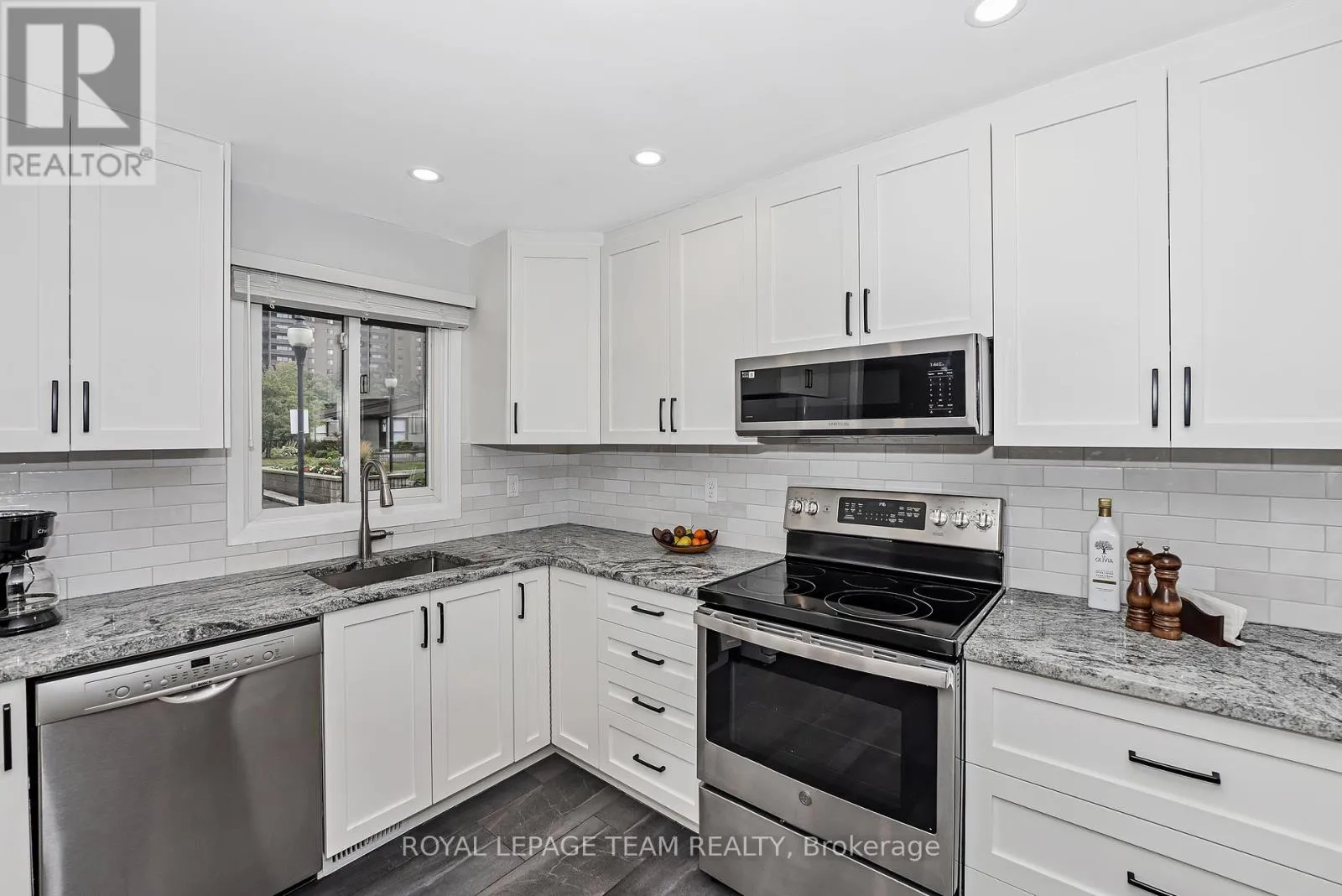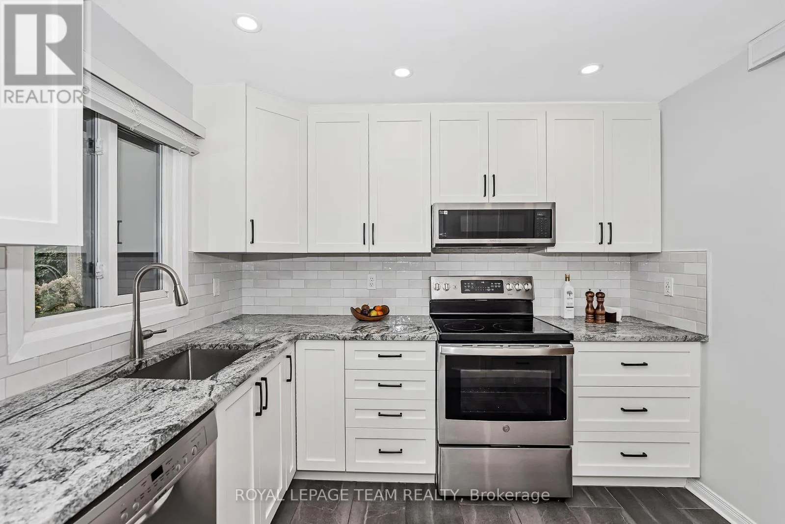 Cross Streets: Ambleside Drive. ** Directions: Turn west off Woodroffe on Richmond, turn right New Orchard and left on Ambleside. Open House - Sunday January 4th (2-4) Rare opportunity to own one of only nine executive townhomes with river views at Ambleside One! Offering over 1,730 sq. ft. of renovated living space, this home is set in a private location with no rear neighbours-your own peaceful paradise in the city. Simply unpack & enjoy a property thoughtfully updated for the most meticulous buyer.The open-concept main level features soaring cathedral ceilings, hardwood floors, a striking gas fireplace, and a walkout to a private balcony overlooking the Ottawa River and parkway, buffered by mature trees. A versatile main-level room functions perfectly as a den, playroom, or additional bedroom, providing flexibility for your lifestyle.The ground-level walkout opens to a fenced yard-ideal for entertaining, gardening, or relaxing outdoors-with easy access to NCC pathways for walking, biking, or skiing. Renovations include removal of popcorn ceilings, pot lights with dimmers, and sound insulation in all bedrooms. The primary suite features double closets and a beautifully updated ensuite with a glass walk-in shower. The lower bathroom offers a custom Laurysen vanity w quartz countertop, while the large bedroom showcases oak hardwood and mirrored closet doors.The refreshed kitchen includes solid maple cabinetry, granite counters, and newer appliances. The condo corporation has completed key updates: high-efficiency furnace, roof (south facing), bathroom fans, newer windows, and a modern gas fireplace insert. Ambleside One is a true all-inclusive, pet-friendly community with Bell Fibe internet/TV, heat, hydro, and water included, plus resort-style amenities: indoor saltwater pool, gym, sauna, library, guest suites, party room, workshop, car wash, and tuck shop. Underground parking (#263) is conveniently located near the door on level two. Easy access to the future LRT, river pathways, and city conveniences-this rare home offers space, privacy, and lifestyle in one exceptional package. (id:27476)