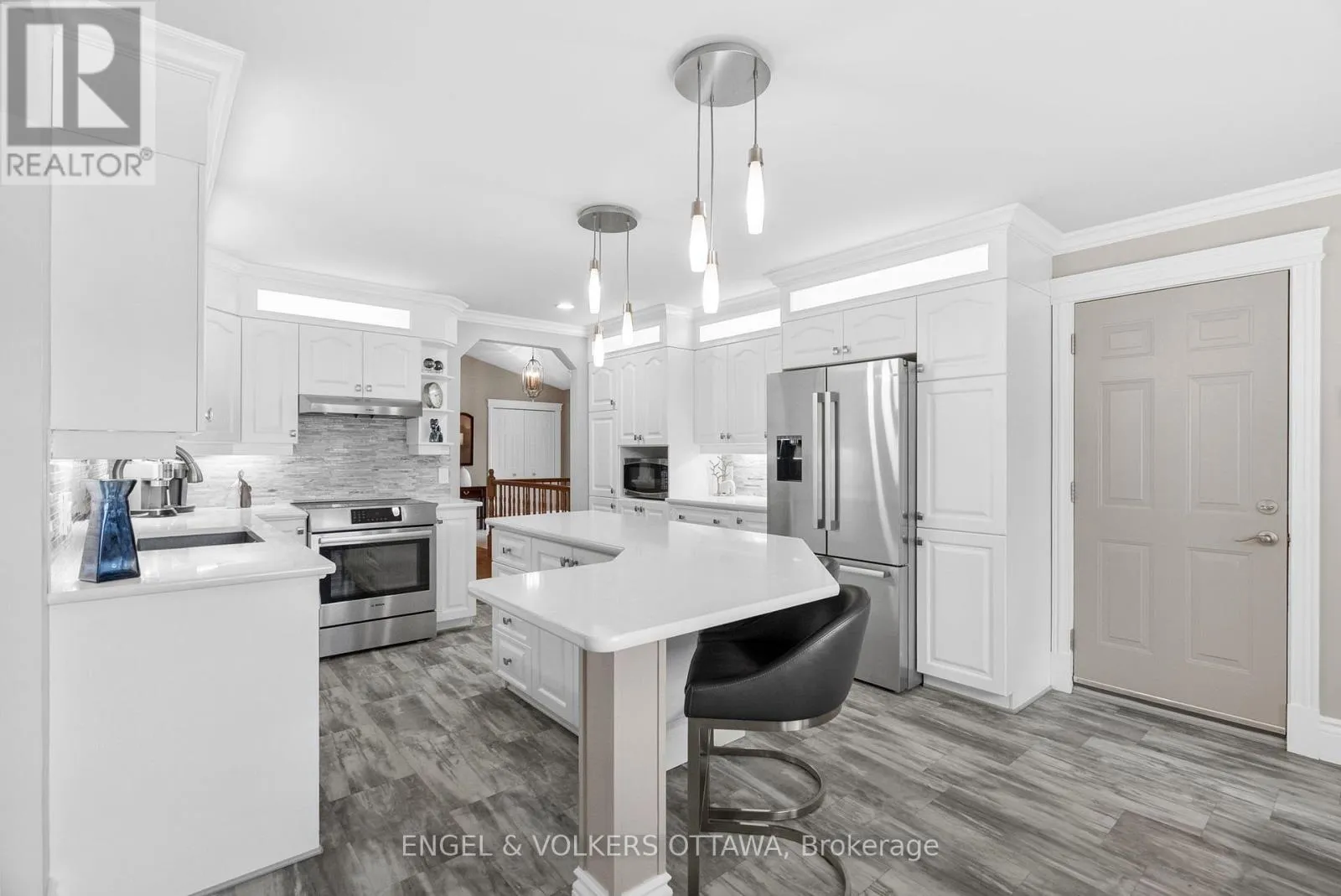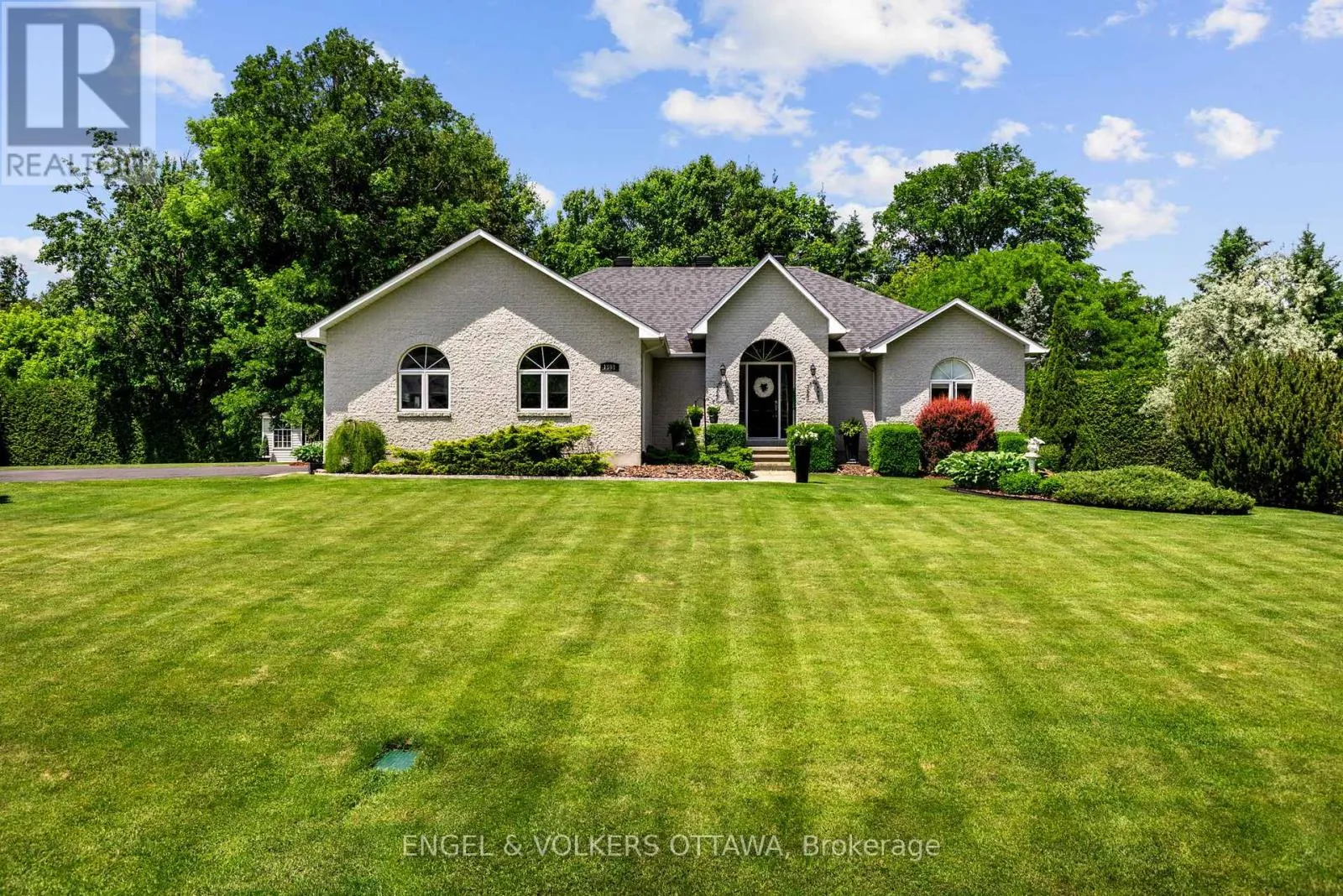 Cross Streets: Stephanie Anne Dr & Donwel Dr. ** Directions: From Old Prescott Rd, turn right onto Donwell Dr, then turn left onto Stephanie Anne Dr. 1591 Stephanie Anne Drive invites you to enjoy luxurious living on a peaceful, treed corner lot surrounded by manicured 20-foot hedges for privacy and set back from the road in one of Greely's most established and coveted communities. The main floor opens with a grand foyer boasting vaulted ceilings, ceramic tile and gleaming hardwood floors. Anchored by a gas fireplace with soaring 13-foot ceilings, the living room exudes warmth and grandeur, while the separate dining room sets the stage for memorable gatherings. The spacious designer kitchen is perfect for hosting and features quartz counters, stainless steel appliances, and a large central island with seating. A bright adjoining eating area with oversized windows extends to a private backyard and two-level hardscape patios, perfect for morning coffee or evening relaxation. The primary suite offers a walk-in closet, additional wardrobes, and a luxurious 5-piece ensuite. A spacious secondary bedroom and beautifully finished full bath with striking shower tile complete the main level. (3 bathrooms include quartz counters). A striking circular staircase leads to the lower level, where the soundproof theatre takes centre stage with two level seating and cinematic scale. Complementing this is an expansive recreation room with a center gas fireplace, an additional bedroom (currently being used as a gym) with wall-to-wall closet, a home office, a sleek full bath, and a laundry room. This custom home crafted with enduring steel construction, sweeping circular 21 vehicle driveway to the oversized two car garage, and underground irrigation system impress across the manicured property, while the large custom storage shed offers unmatched convenience. Successful inspection reports completed July 2025 (home, well and septic) available upon request. Minutes from schools, parks, shops, and nature trails. This home delivers Greely's tranquility with modern luxury and unforgettable entertainment at home with family and friends. (id:27476)