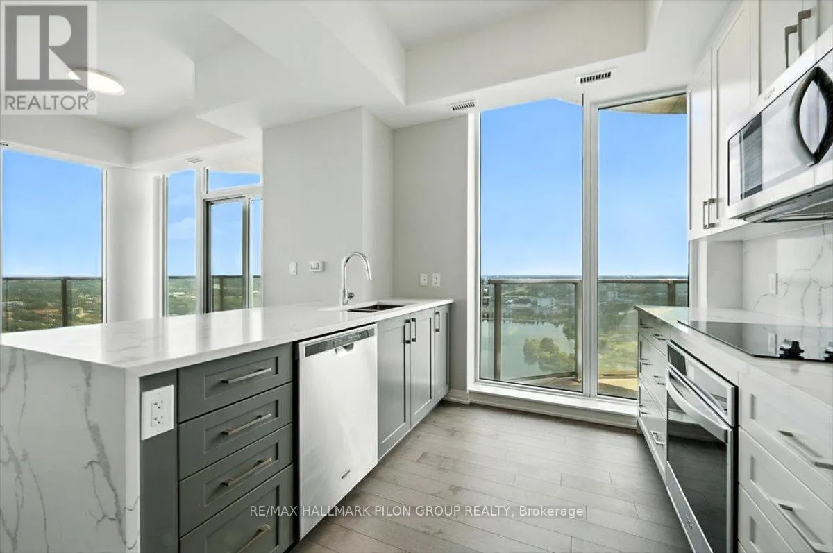 Cross Streets: Preston / Carling. ** Directions: Preston to Carling. Torn between the joys of lakeside living and the vibrance of city life? At The Claridge Icon, Ottawa's tallest landmark, you are invited to indulge in both, without compromise. This 1290 square foot BABY PENTHOUSE is a statement of modern elegance. Framed by sweeping floor-to-ceiling windows and soaring 9ft ceilings, the residence is immersed in natural light, offering an ever-changing panorama, from the rolling Gatineau Hills and fireworks over Parliament Hill to the glittering city skyline and sparkling view of Dow's Lake. The expansive wraparound balcony, with SOUTHERN AND EASTERN EXPOSURES, becomes your private front-row seat to it all. Hardwood floors carry throughout the open and airy plan, anchored by a crisp white kitchen with a striking WATERFALL ISLAND. The primary suite easily ACCOMODATES A KING BED and enjoys calming views of Dow's Lake with a private balcony, a walk-in closet, and a spa-inspired ensuite with totally upgraded finishes. A second bedroom and full bath echo the same attention to quality. Modern convenience is woven into the space with in-suite laundry and the inclusion of a locker and coveted parking spot. Residents of the icon enjoy WORLD CLASS AMENITIES including 24/7 concierge service, private guest suites, a state-of-the-art fitness and yoga studio, an indoor pool, theatre room, bike room, sauna, BBQ area and terrace along with a curated collection of social and entertaining spaces. Just outside your door, discover some of OTTAWA'S FINEST DINING in Little Italy, stroll or bike along the gardens of Commissioner's Park, kayak on Dow's Lake, and enjoy effortless access to transit and entertainment. Here, life at the top isn't just about the view, it's about a vibrant and full lifestyle. Some photos virtually staged. (id:27476)