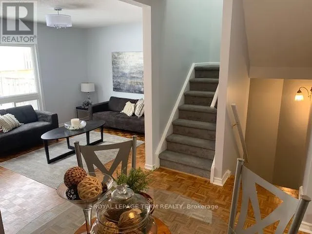 Cross Streets: Vanessa. ** Directions: Driving South on Greenbank from Fallowfield turn right on Malvern, then left on Sherway, right on Vanessa and right on Larkshire - Unit parking #39 or use the visitor parking spots. Lovely end unit townhome without immediate rear neighbourgh. Practical fenced yard. This home is conveniently located near the arena, pool, library, transit, school, parks & shopping. This bright home is painted in neutral colours to accommodate any decors. Functional eat in area in the kitchen with exterior view and separate dining room. Beautiful spacious living room with fireplace including enough space to create an office nook to work from home or additional seating area. There is no carpet on the main and upper level for easy maintenance. Finished lower level family room. Lots of storage and large laundry room. You will enjoy the generous size master bedroom with oversize closet & 2 secondary bedroom on the upper floor. The water is included in the rent. There is one designated parking in addition to visitor's parking. Ready immediately to welcome your family. Note some pictures have a smaller stove in the kitchen it was replaced by a full size stove. (id:27476)