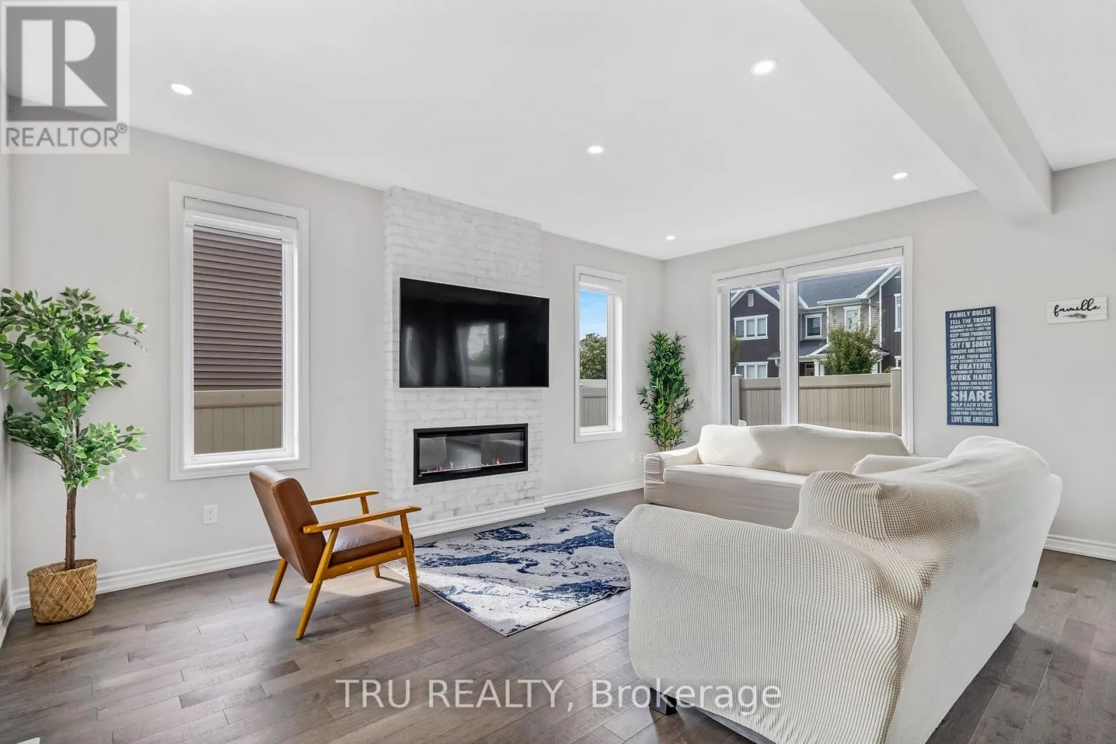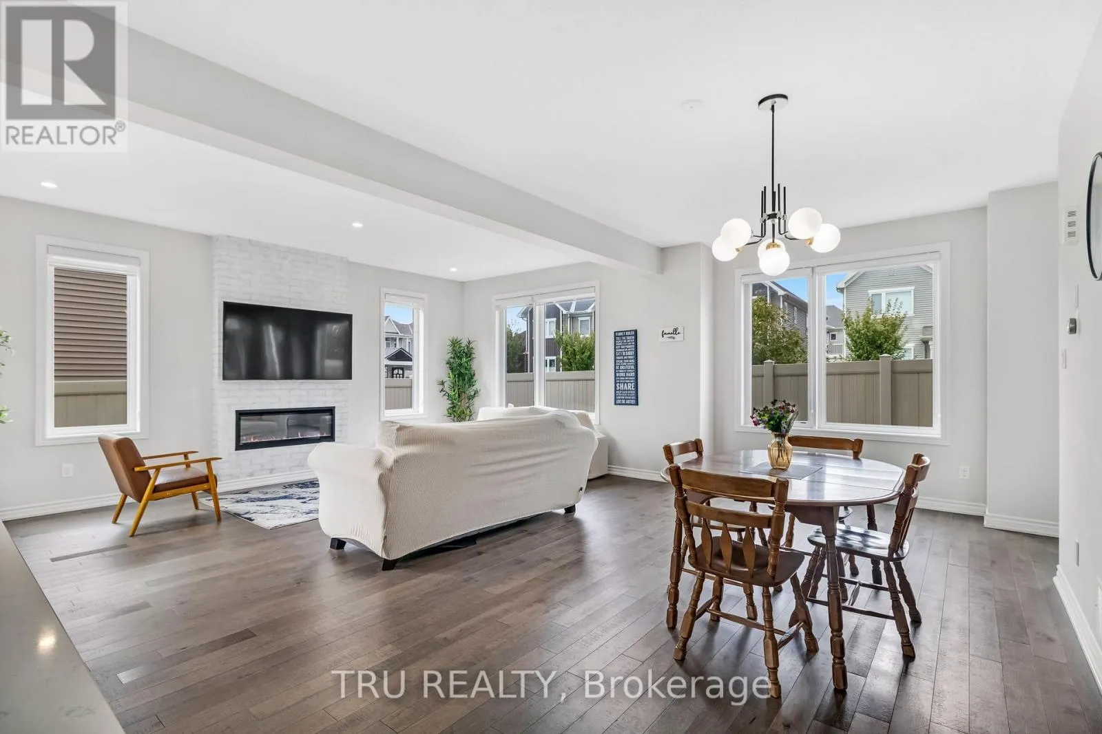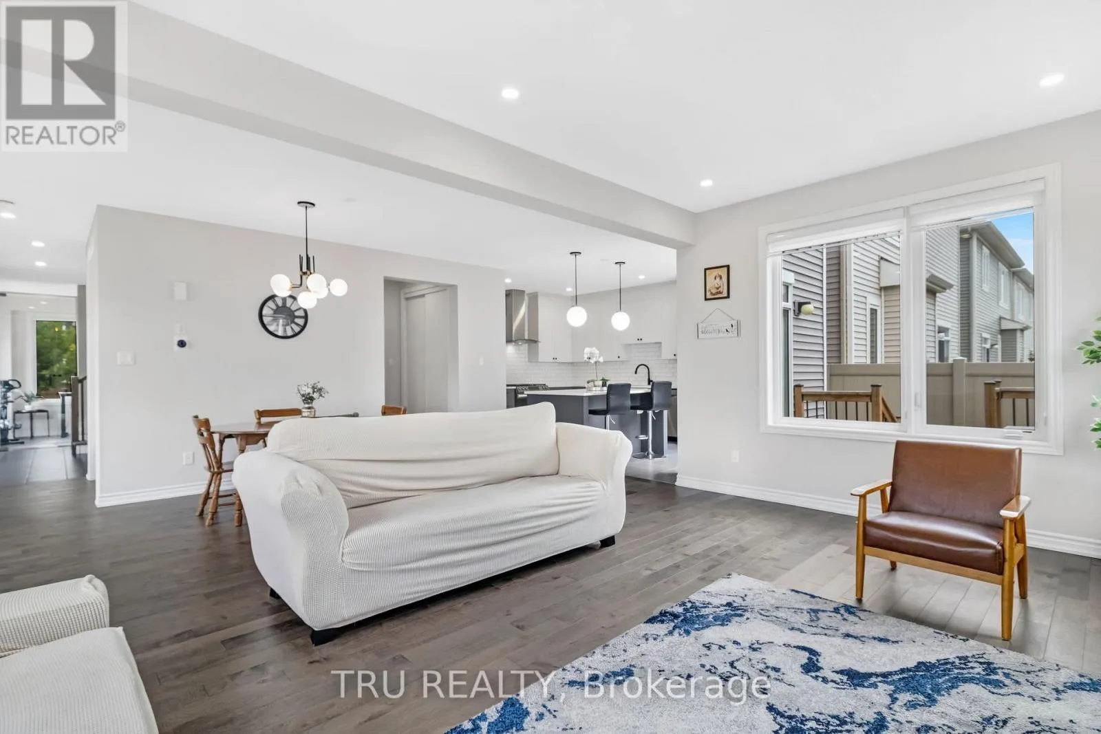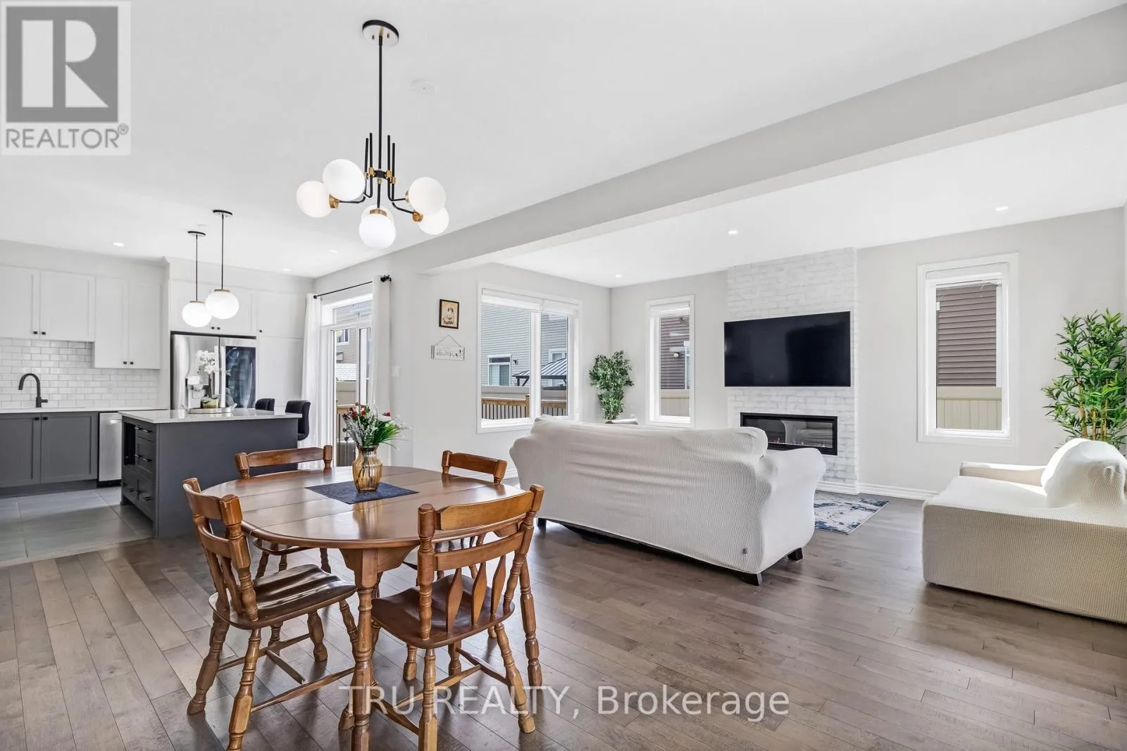 Cross Streets: Strandherd Dr to Chapman right onto Point Prim Cr left onto Coppermine St. ** Directions: From Strandherd Dr, turn right onto Chapman Mills, then right onto Point Prim Crescent and left onto Coppermine Street. Elegant 4 Beds detached home on a premium corner lot in the highly sought-after Conservancy community. Built in 2020, this beautiful residence showcases extensive builder and custom upgrades designed for comfort and style. The foyer with custom seating and accent wall leads to an open-concept living and dining area with upgraded hardwood flooring, pot lights, and upgraded Napoleon electric fireplace for a cozy experience. The kitchen features an upgraded chef's center layout with upgraded designer cabinets, upgraded quartz countertop, upgraded floor tiles, a matt black gooseneck faucet with double undermount sink, and upgraded Cyclone stainless steel chimney hood. The space is completed with High-end stainless steel appliances for both style and function. From here, step out to the custom-built deck and fully fenced backyard, ideal for gatherings. The main level also includes a powder room with updated accent and upgraded home office/den with custom glass door entry, accent wall, large windows and a modern light fixture, offering an elegant space for work or quiet focus. Upstairs, the bright spacious primary retreat offers an upgraded spa ensuite with quartz countertop and dual rectangular undermount sinks. Three additional generously sized bedrooms and a full bathroom complete the upper level. The lower level includes a recreation room with upgraded carpeting and a rough-in for additional bathroom. Additional builder upgrades include: Carpeting on the upper level and basement; blinds in the den, one bedroom and living room; a custom entryway bench; Pot lights and light fixtures in the kitchen and dining area; elongated toilets in all bathrooms. Over and above the builder's upgrades, the current owner has added fencing (2022), eavestroughing (2023), converted the upstairs loft into a 4th bedroom (2025), and installed a 240V outlet in the garage for EV charging. This move-in-ready home offers modern upgrades and abundant natural light in a desirable neighbourhood. (id:27476)