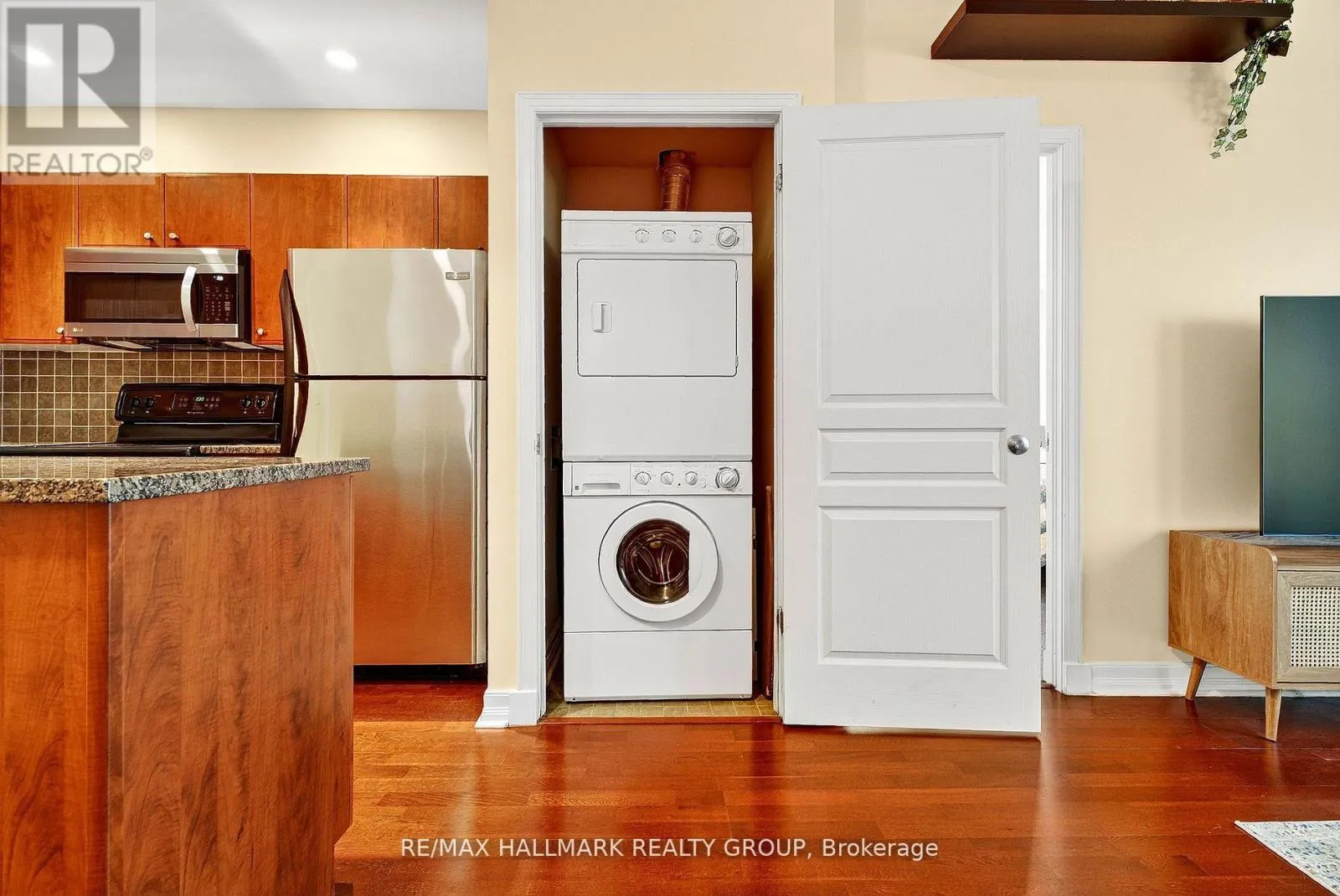 Head northwest on Bank St/Ottawa Regional Rd 31 toward Queen St & Continue to follow Slater St. Follow through to Mackenzie King Bridge & follow onto Waller St. Turn right onto Besserer St. Welcome to 200 Besserer Street, Unit 1206-located in one of the best-maintained condominium buildings in downtown Ottawa. This bright and highly functional 1-bedroom suite offers open-concept living with 10 ft ceilings, hardwood floors, and a smart layout ideal for first-time buyers, students, and investors. The open kitchen features granite countertops, ample cabinetry, a practical island, and modern stainless steel appliances, all flowing naturally into the living and dining area. The spacious bedroom provides excellent comfort, and the 4-piece bathroom includes a granite vanity. In-suite laundry adds everyday convenience and completes this efficient floorplan. This unit also includes one underground parking space and a dedicated storage locker, offering added value and practicality. Residents enjoy premium amenities such as an indoor saltwater pool, sauna, fitness centre, and a large outdoor terrace with BBQs. Heat and water are included in the condo fees. Just steps to the University of Ottawa, LRT, Rideau Centre, ByWard Market, and Parliament Hill, this location offers unmatched downtown convenience. A well-run building, a clean and functional layout, premium amenities, and a prime urban location-Unit 1206 at 200 Besserer is an exceptional opportunity in the heart of Ottawa. (id:27476)