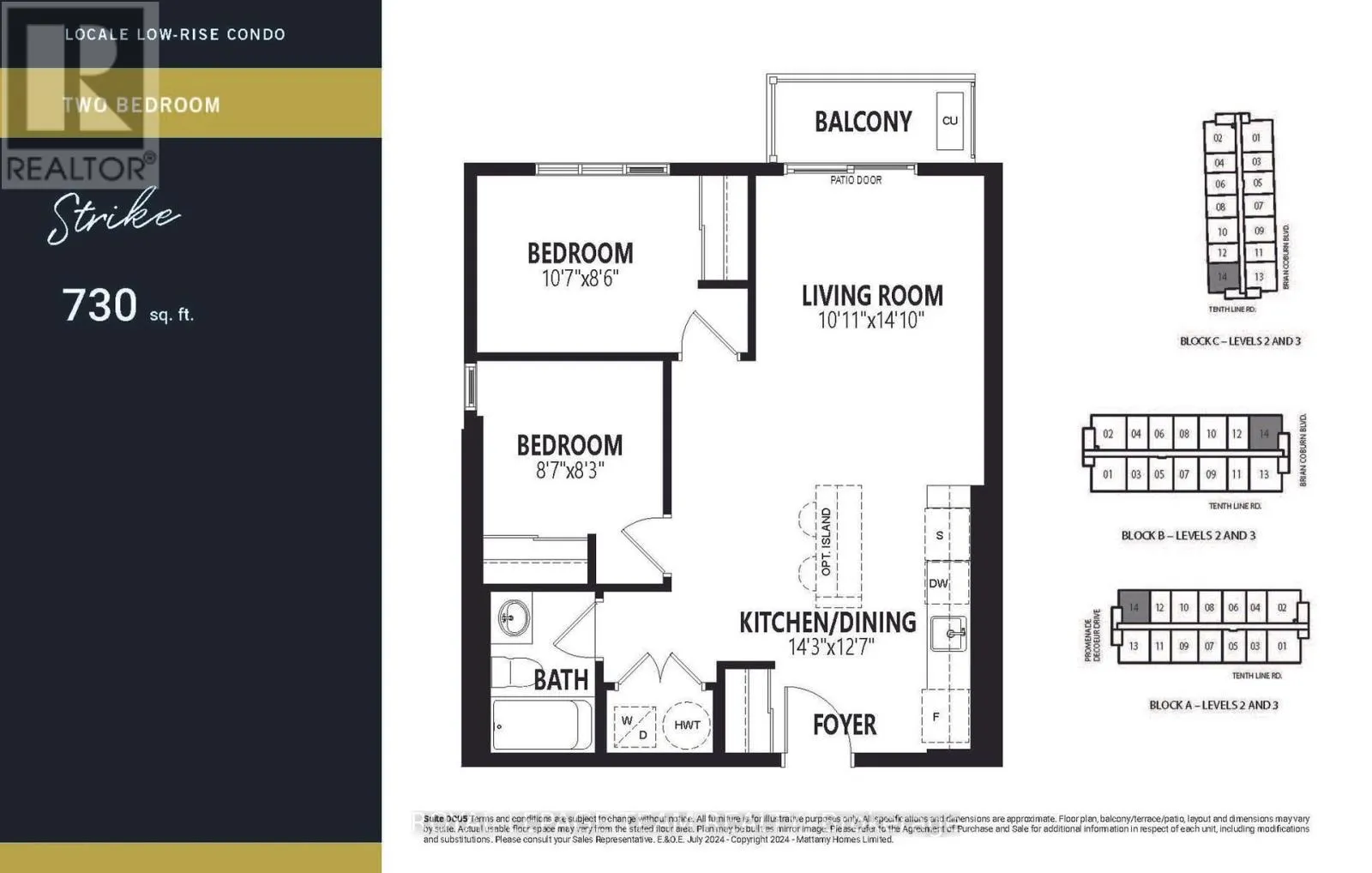 Cross Streets: Brian Coburn Blvd. E & Tenth Line Road. ** Directions: From Innes Rd. turn onto Tenth Line Road, property will be on the right. LIMITED TIME - NO CONDO FEES FOR 2 YEARS! Welcome to the Strike model by Mattamy Homes in the sought-after Avalon community of Orleans. This brand new 730 sqft condo features a welcoming foyer with closet, a stylish chef-inspired kitchen with quartz countertops, backsplash and an optional large island (no sink), all opening to a bright dining and living area with access to a private balcony. Offering 2 bedrooms, 1 full bathroom, and a dedicated laundry room. This home is designed with convenience and modern finishes in mind. Enjoy 9' smooth ceilings, luxury vinyl plank flooring throughout (no carpet), five appliances, and one parking spot. Perfectly located near parks, trails, recreation centres, shopping, dining, and transit, this condo blends style, comfort, and everyday convenience. Images provided are to showcase builder finishes only. (id:27476)