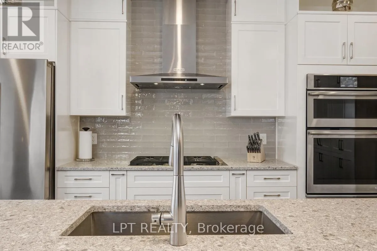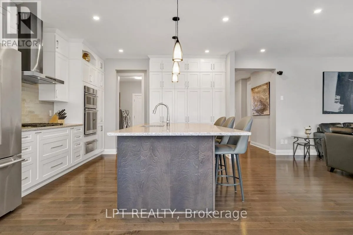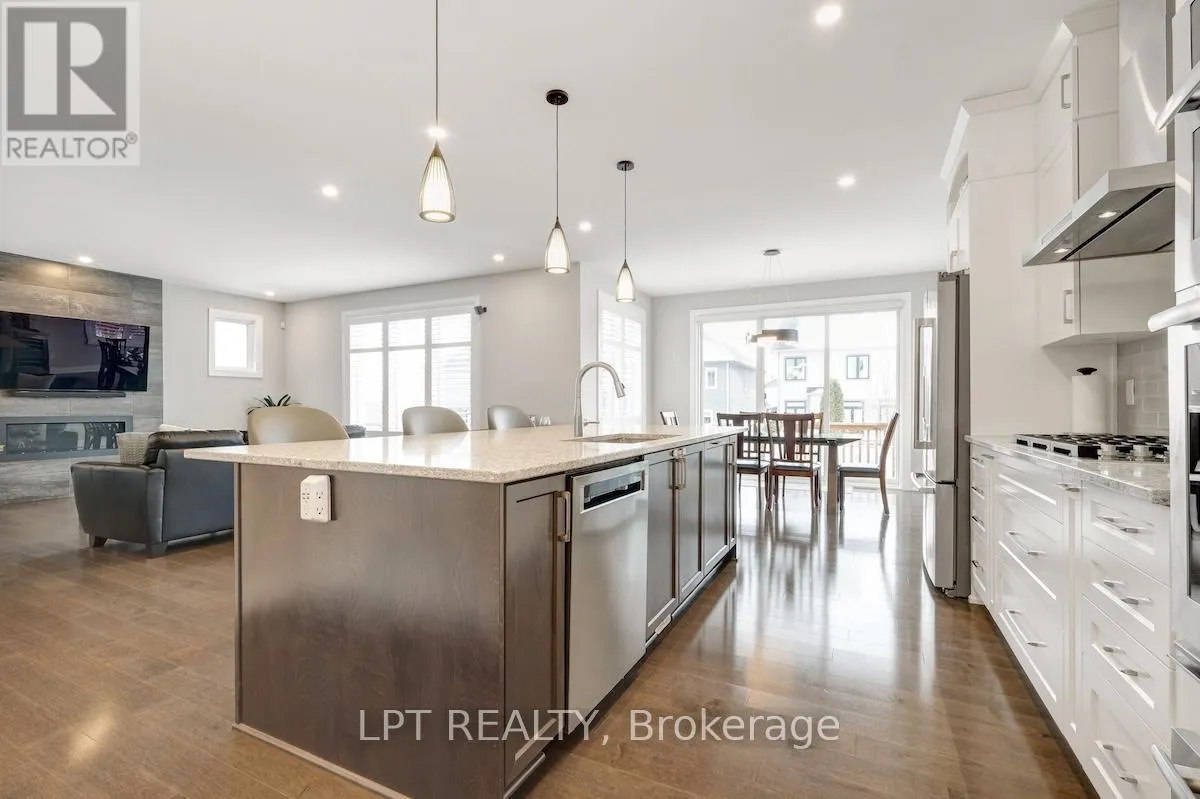 Cross Streets: Manotick Main Street. ** Directions: Manotick Main Street, right on Bridgeport Ave,Left on Trestle St, Left onto Sprindrift Circle. Welcome to this beautifully upgraded bungalow located in the highly sought-after Mahogany Community, set on a generous 60' x 118' lot. Offering approximately 2,000 sq. ft. on the main level, this home combines elegant design, thoughtful improvements, and exceptional outdoor enhancements. The bright, open-concept layout is anchored by a stunning chef-inspired kitchen featuring an oversized island, granite countertops, premium stainless-steel appliances, and an abundance of cabinetry and prep space-perfect for both everyday living and entertaining. The spacious living area is warm and inviting with a cozy gas fireplace, while the former dining room has been professionally converted into a third main-floor bedroom, providing flexible space for families, guests, or a home office. The primary suite is a true retreat, complete with a custom California walk-in closet with upgraded built-ins and a luxurious 5-piece ensuite showcasing a soaker tub, separate glass shower, double vanity, and refined finishes. The expansive unfinished basement offers high ceilings and oversized windows and now features a newly added full walkout, opening up endless potential for future living space. Outside, the property has been professionally landscaped from front to back, including beautifully executed concrete steps along the side and rear of the home-creating seamless access and impressive curb appeal. Additional highlights include rich hardwood and tile flooring throughout the main level, main-floor laundry, brick and stone exterior, fenced yard, and extensive builder upgrades throughout. A rare opportunity to own a meticulously improved bungalow in one of Ottawa's most desirable communities. 24 hour irrevocable on all offers as per form 244. (id:27476)