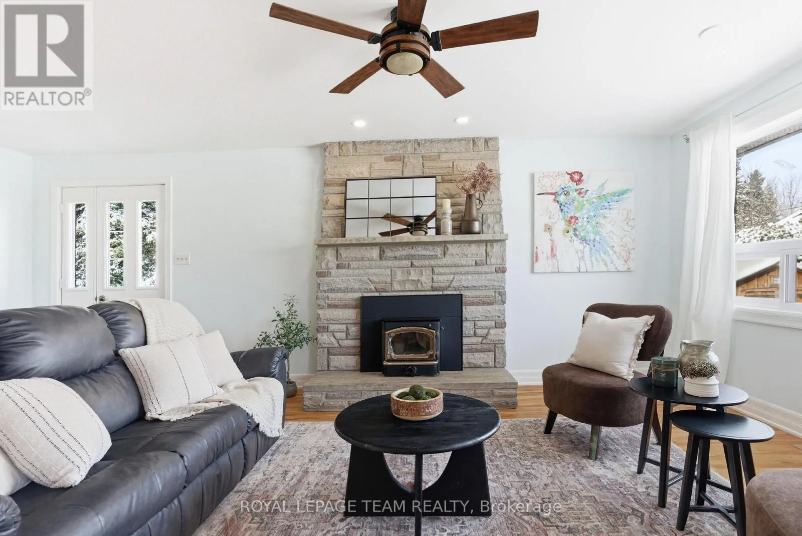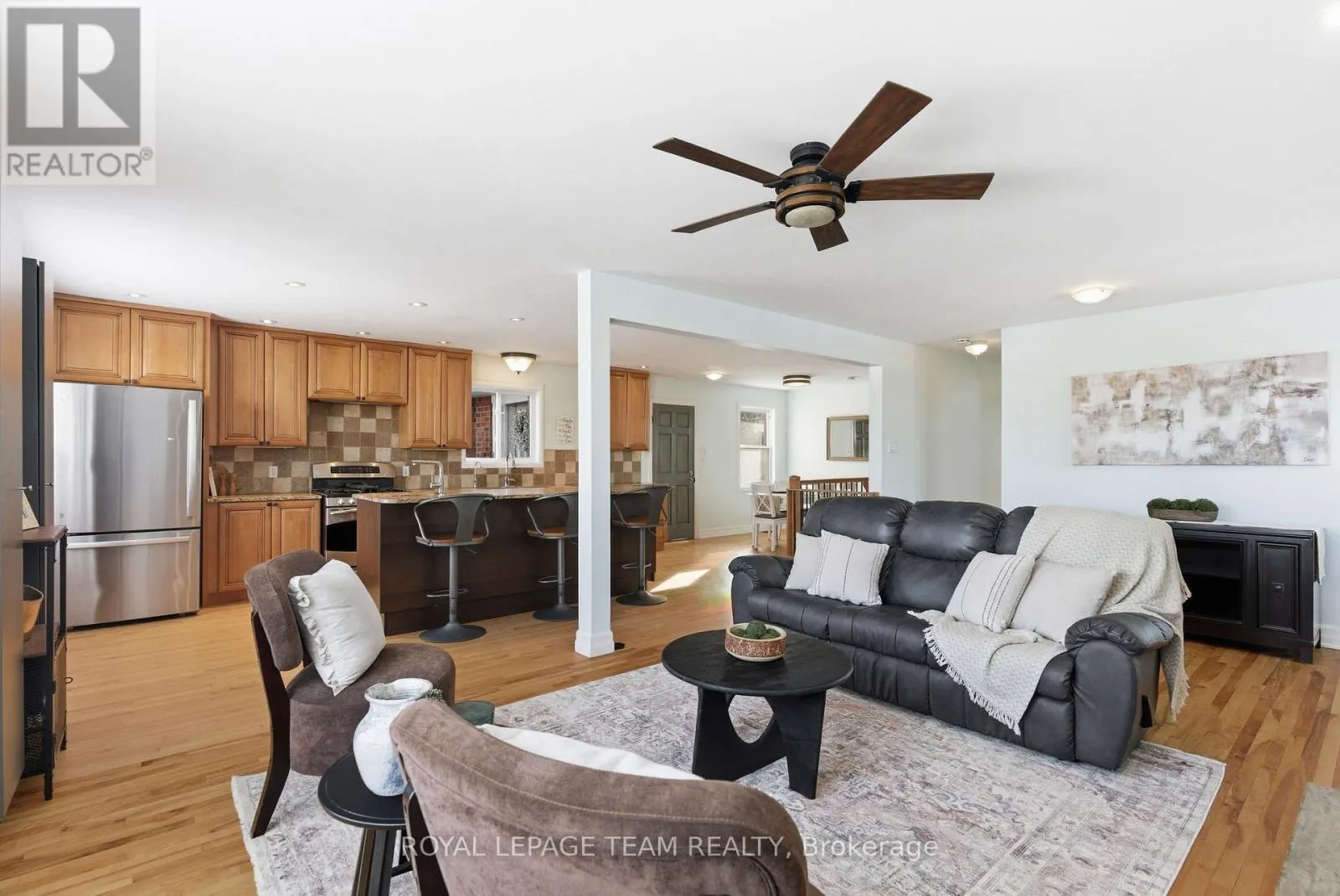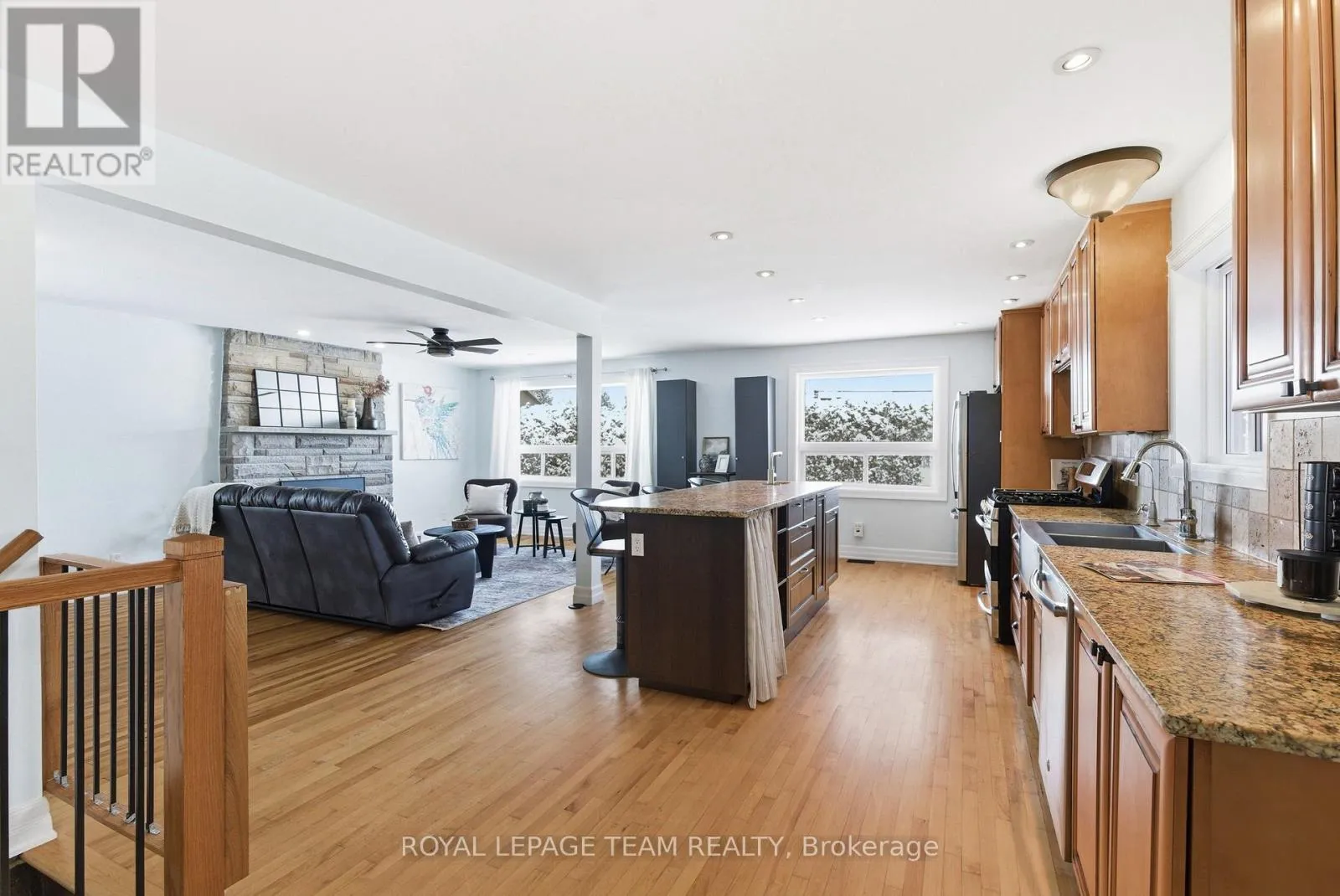From Osgoode Main St; Right onto Elizabeth St Located on a quiet street in the heart of Osgoode Village, this all-brick bungalow offers exceptional space, privacy, and thoughtful upgrades on a fully private and hedged 140' x 160' (0.525-acre) lot. A bright foyer connects to the backyard, garage while welcoming you into the open concept main floor, where the sun-filled living room sits just off of the chef's kitchen. Hardwood floors flow throughout the whole main level, featuring a cozy family room with a fireplace and a dining area ideal for everyday living and entertaining. The updated kitchen is the heart of the home, showcasing granite countertops, a large island, high-end stainless steel appliances w/ gas stove, extended cabinetry, recessed lighting, and ample storage and prep space. The main floor offers a spacious primary bedroom, two additional family bedrooms, a 4-piece main bath. The finished lower level expands the living space with a large recreation room featuring an extra family room and bonus space, a fourth bedroom, a full 3-pce bathroom, laundry area, updated egress windows, and plenty of storage-ideal for guests, teens, or a home office. Step outside to enjoy the massive, private backyard, designed for entertaining with a raised deck, a separately fenced 24' heated salt-water pool (2022), and expansive hedged lawn offering complete privacy. Additional highlights include a paved driveway, 10' x 16' Crawford shed, 2nd shed and an oversized (22'2" x 24'5") two-car garage with backyard access and inside entry. Extensively updated for peace of mind, the home features natural gas heating, new Lennox A/C (2022), hot water tank (2025), electrical with 200-amp service plus 125-amps auxiliary panel, roof (2023), 24' Salt Water Pool with Thermowalls & Heater from Poolerama (2022), Paved driveway & landscaping and fresh paint (2025-2026). This move-in-ready home offers comfort, functionality, walkability to all your local amenities and long-term value in a sought-after village setting. (id:27476)