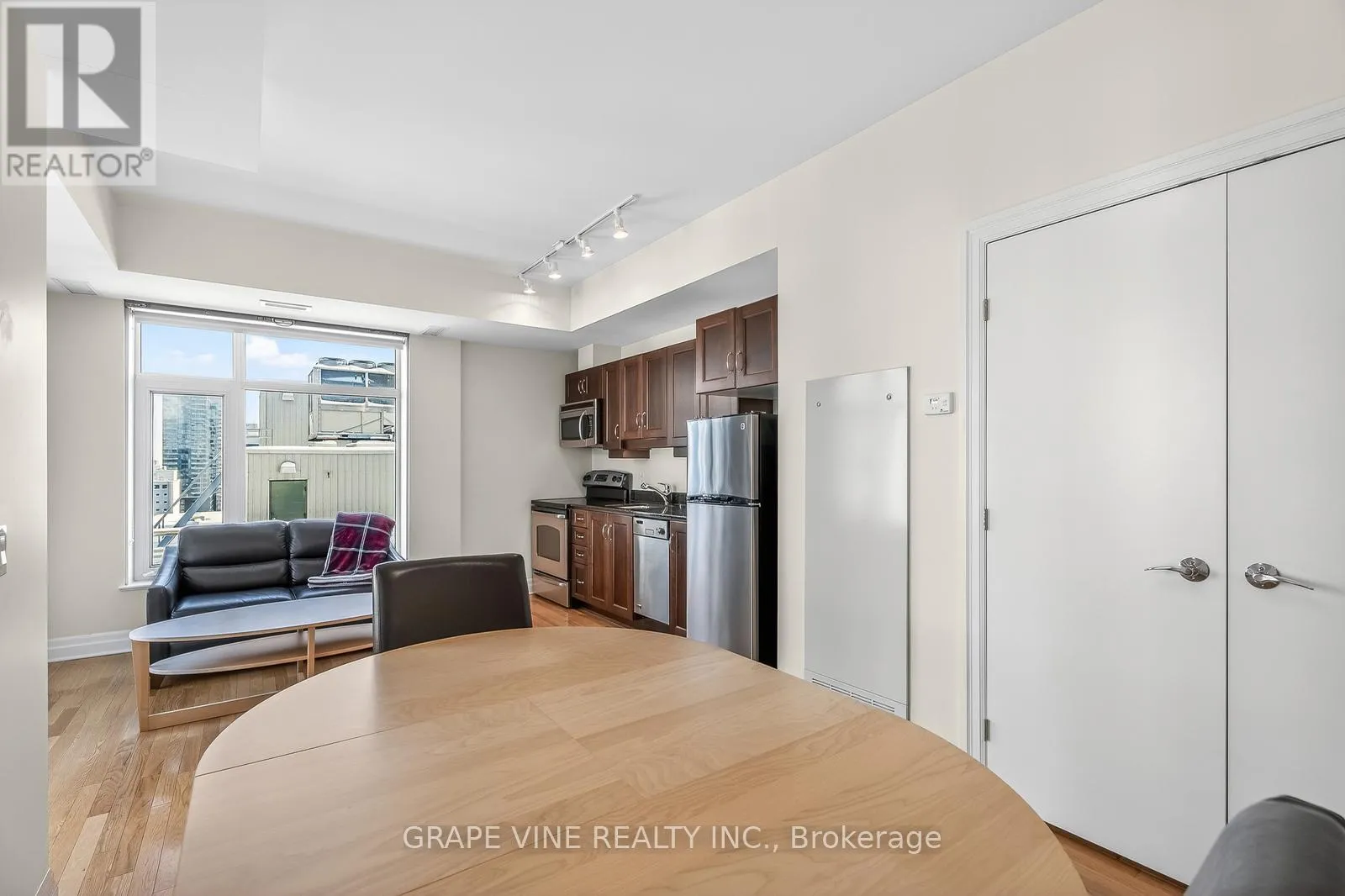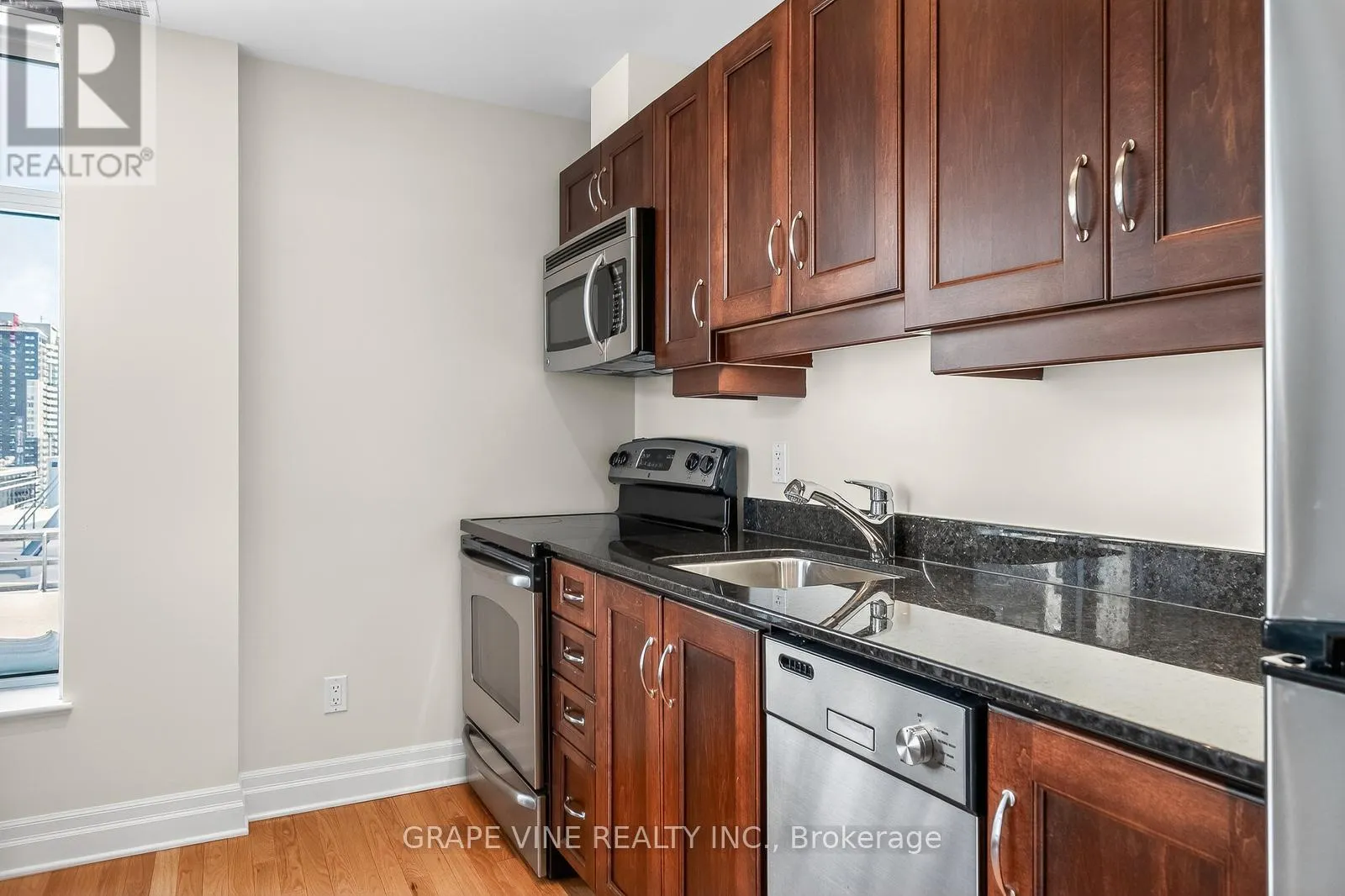 Cross Streets: Nepean and Lisgar. ** Directions: Corner of Kent and Nepean/Lisgar. Welcome home to this 1 bedroom, 1 bathroom, 14th floor unit, with spectacular views of the City. Open concept design with kitchen, eating and living room area. Stunning hardwood flooring and plenty of natural lighting flowing throughout with large windows. The kitchen includes ample cabinetry, granite countertops, quality stainless steel appliances, and track lighting. Convenient in suite laundry, spacious bathroom, also with granite countertops, and bright bedroom with large closet. Relax outside on your private, courtyard facing balcony overlooking the stunning views. Underground parking and storage included with the unit. Amenities include beautiful west facing skyline view rooftop terrace with bbqs, fully equipped gym, social room and visitor parking available. Low condo fees in this well managed, and stunning Hudson Park building, close to transit, shopping, restaurants and downtown offices. Affordable living for first time buyers, downsizers, or investors. (id:27476)