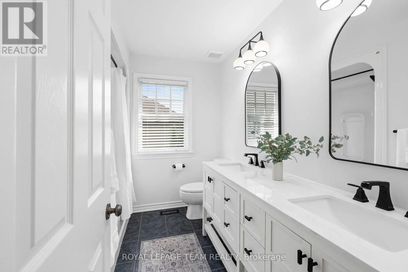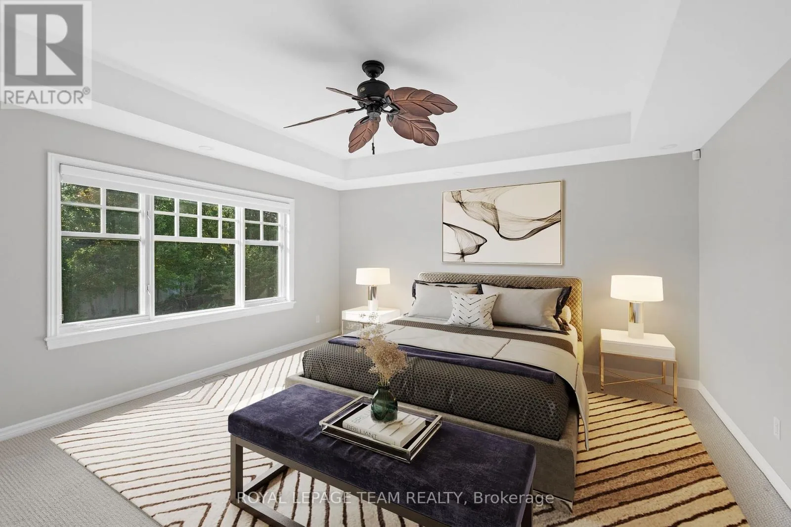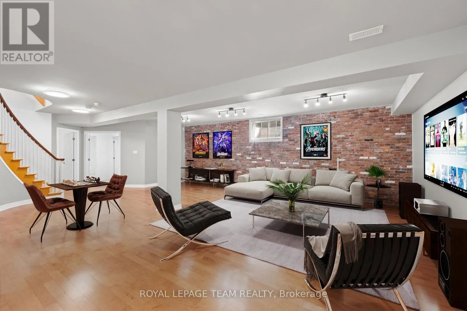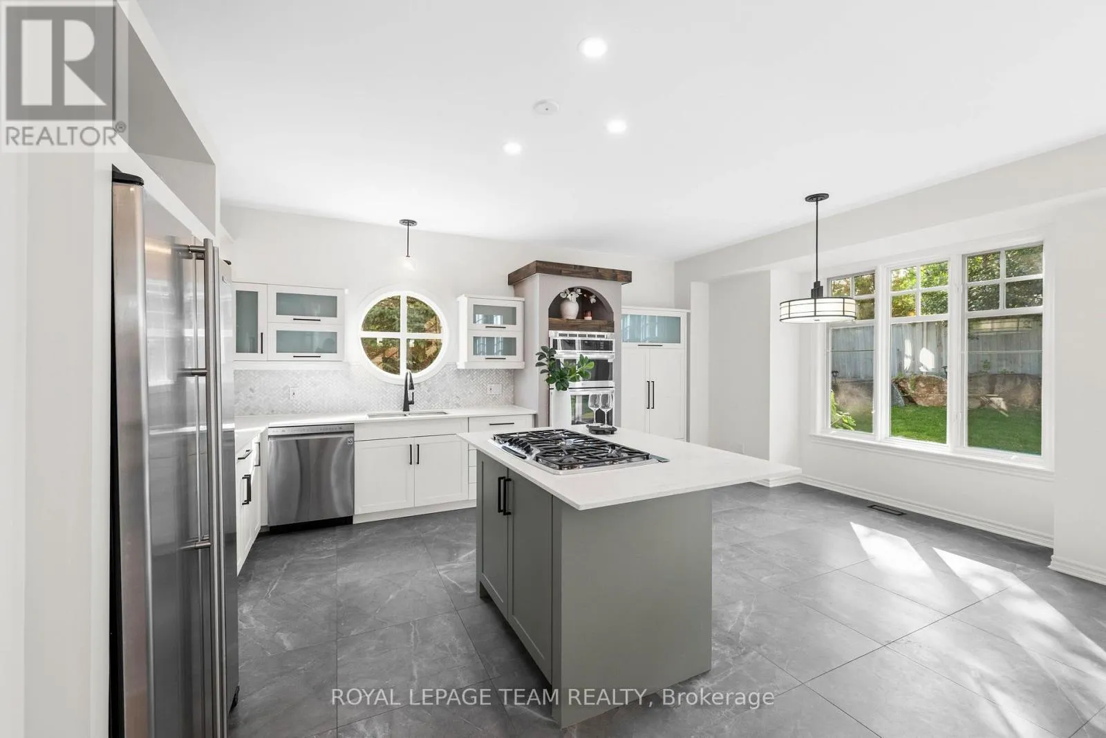 Cross Streets: Weslock Way & Walden Drive. ** Directions: Campeau Dr, Turn right onto Teron Rd, Turn left onto Beaverbrook Rd, Turn right onto Weslock Way, Turn left onto Walden Dr, Turn right onto Ironside Crt. Open House on Sunday Feb 15, 2-4 PM. Welcome to this exquisite Craftsman-style executive residence, offering over 4,800 finished sq ft on three levels, gracefully positioned on a quiet crescent in prestigious Kanata Lakes. Set on a large corner pie-shaped lot w/timeless curb appeal, a charming covered front porch, & a family-friendly setting just minutes from Beaver Pond trails & top-ranked schools, this home blends classic character w/refined modern updates. The main lvl showcases a tiled foyer w/French drs, a renovated pwdr rm, & elegant LR & DR enhanced by refinished HW flooring, stone accents, & crown moulding. At the heart of the home, the dramatic two-storey FR is framed by a Juliet balcony above & striking WETT-certified wood-burning FP w/floor-to-ceiling stone surround. The updated kitchen offers quartz counters, herringbone backsplash, peninsula w/bar seating & sink, island w/double sink, SS appl, & a bright breakfast area w/access to the landscaped rear yard. A sophisticated main-floor den w/custom wood built-ins & shutters provides the perfect executive office or retreat. The second level presents a true 5-bdrm layout, including a luxurious primary suite w/transom ceiling, WIC, & spa-inspired ensuite w/dbl sinks, soaker tub, & slate shower w/rain head. The renovated main bath completes this floor. The finished LL extends the living space w/a rec rm, dbl-dr flex/gym, private bdrm w/3-pc bath, & a spacious laundry rm. he fully fenced yard features an interlock patio, mature fruit trees, & generous play space. Extensive updates include int painting (2025), patio door replaced (2025), kitchen flooring & cabinetry (2024), main floor bath (2024) ensuite & bath vanity & lighting (2024), exterior paint (2024), & landscaping/driveway (2022), furnace (2021), washer/dryer (2021), A/C (2018), roofing updates by previous owner (2018). Security system is owned. Rare offering combining elegance & location. 24 hrs irrev. on all offers. Some photos virtually staged. (id:27476)
