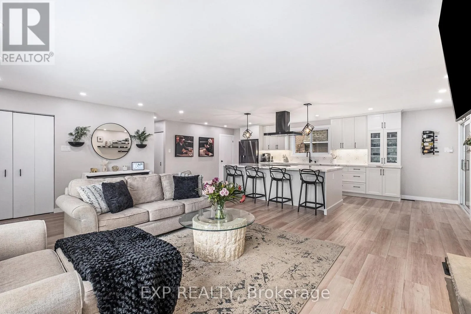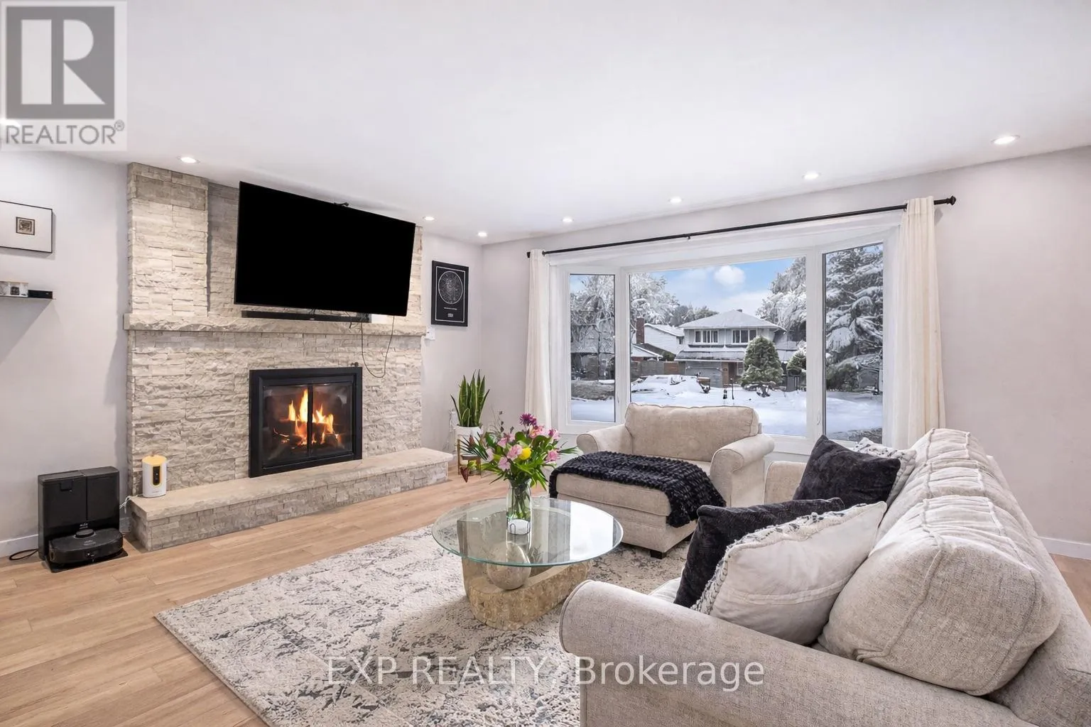 Cross Streets: Fallowfield Rd & Barran St. ** Directions: FALLOWFIELD TO BARRAN, RIGHT ON ST REMY DRIVE. The house is on the corner on your right. This beautifully renovated 3-bedroom, 2-bath bungalow has seen roughly $250,000 in updates, combining luxury, style, and functionality. The living room showcases a natural almond trail stone wood-burning fireplace and waterproof, scratch-resistant vinyl floors. Smart voice-controlled lighting upstairs and downstairs can change colors, creating the perfect ambiance. The Thomasville kitchen (2024) features soft-close drawers and cabinets, Dekton countertops, a 10x4 ft island, matte black fixtures, a large black sink, European tile backsplash, and premium LG appliances with a chefs hood fan. Off the kitchen, a 4 season sunroom with heated floors, wood-burning masonry fireplace, built-in heater, and 2x2 ft European tiles provides year-round comfort. The upstairs bath includes a modern walk-in shower, maple vanity with quartz countertop, Rubi faucets, and an LED mirror, while bedrooms offer LED ceiling fans and a his-and-hers walk-in closet. The basement is fully finished with a built-in bar, brick wall wood-burning fireplace, gym or storage room, and a spa-like bathroom (2020) with new plumbing, Tenzo faucets, quartz vanity, walk-in shower, Large Freestanding Neptune bathtub, European tile, and LED mirror. Major systems include a gas furnace (2020), new ductwork, A/C (2020), and owned hot water tank (2024). Outdoors, the private fenced yard is a retreat with natural stone walkways, seating area, pergola, Canadian luxury spa Jacuzzi with speakers and lights, and a pull-down projector screen perfect for movie nights. Architectural pot lights illuminate the brick exterior, holiday lighting adds charm, and the front interlock (2024) leads to parking for four cars plus garage. Triple-pane windows and new sliding doors provide excellent insulation. Nothing is rented, everything is owned. Located in a family-friendly Nepean neighbourhood close to parks, schools, shopping, and downtown Ottawa, this home blends high-end finishes and thoughtful upgrades, ready for move-in. (id:27476)