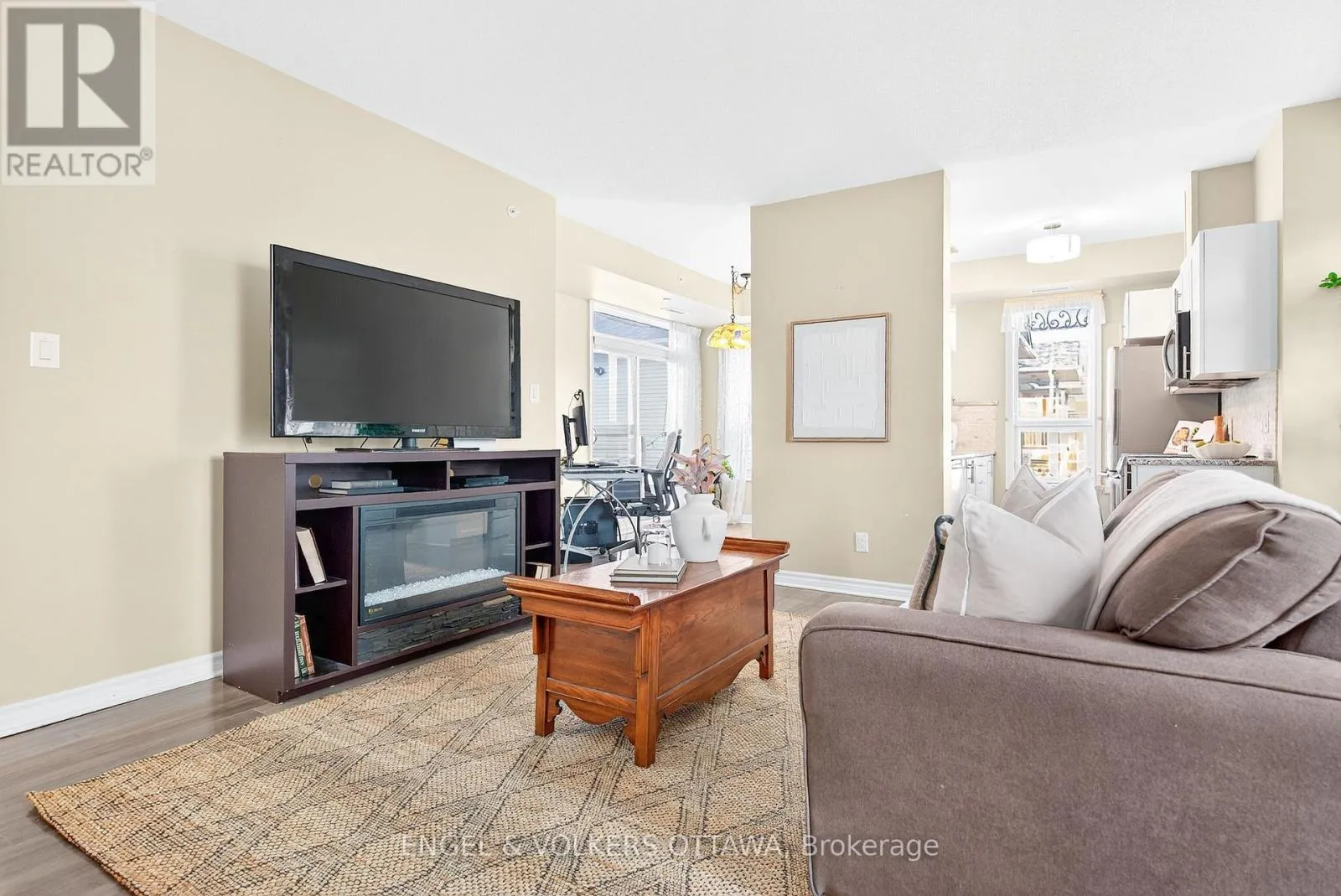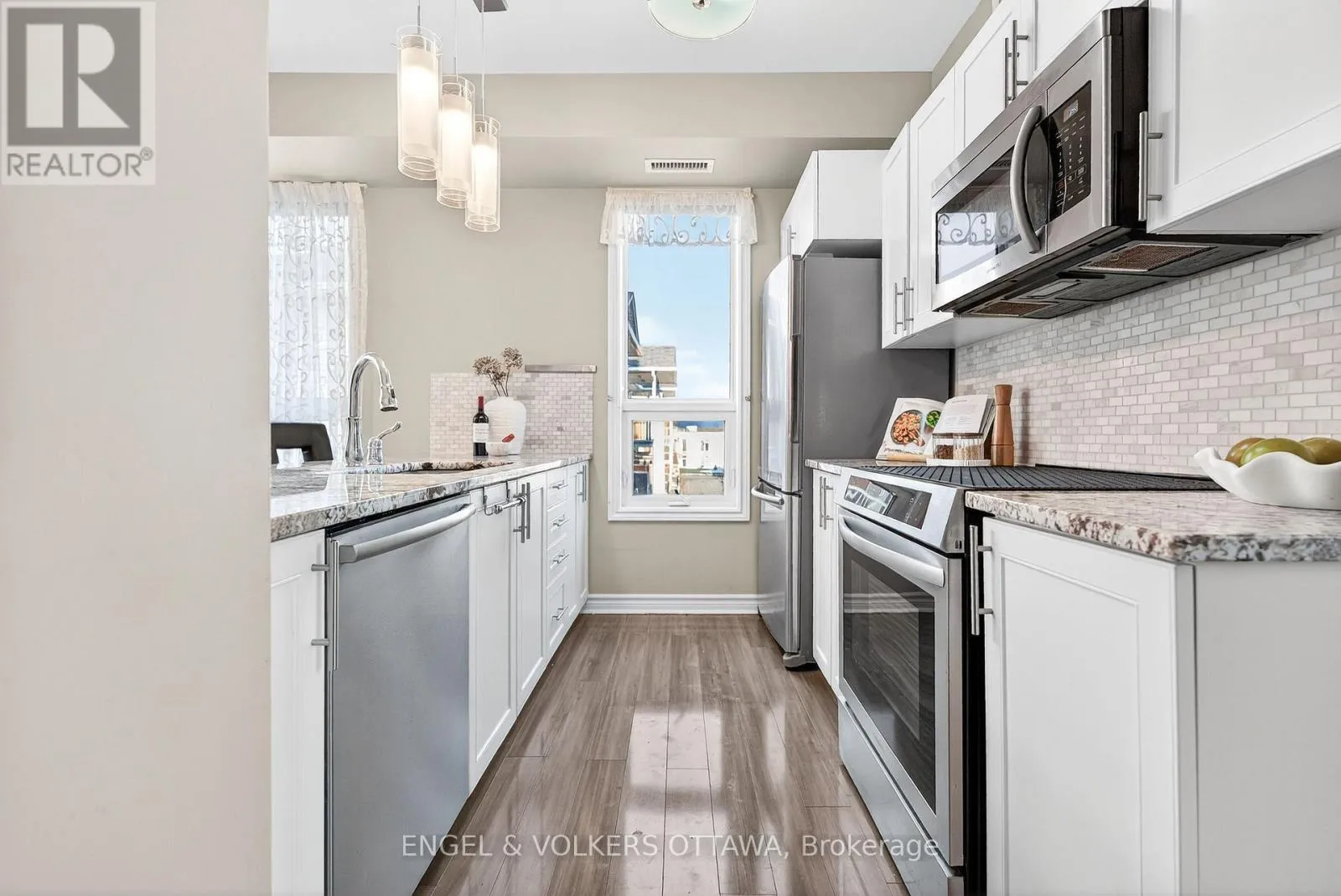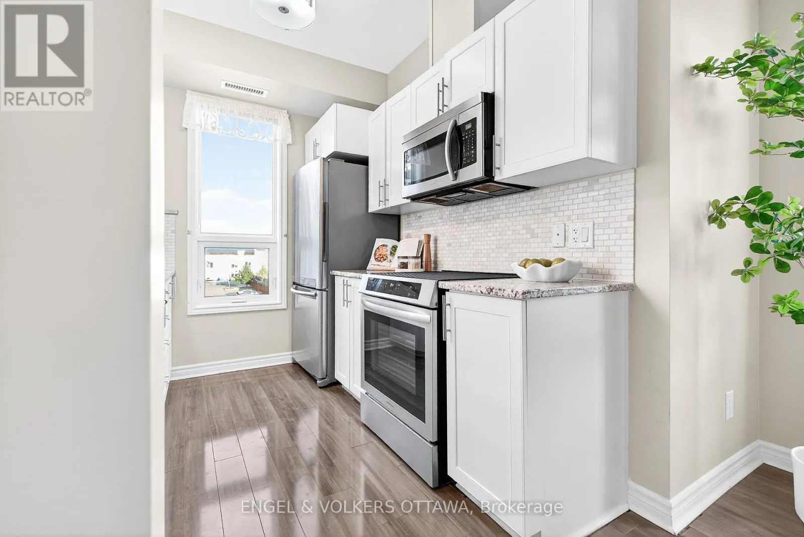 Cross Streets: From Longfields Dr & Chapman Mills Dr. ** Directions: From Longfields Dr turn onto Chapman Mills Dr. Located in the heart of Chapman Mills, this bright and thoughtfully designed Bravo model 2-bed, 2-bath condo spans approximately 1,038 sq. ft. and features a large walkout terrace. The main living area is warm and inviting, with a seamless flow between the dining, kitchen, and living spaces. Oversized windows fill the rooms with natural light, while the updated kitchen features white shaker cabinetry, granite countertops, stainless-steel appliances, and a peninsula with seating that opens into the dining area with direct access to the terrace. With wood-plank flooring and a clear glass railing, this unit's outdoor space is perfect for morning coffee, unwinding with a book, or enjoying views of the surrounding neighbourhood while dining. The primary bedroom, with a tray ceiling detail and plush carpeting, features ample closet space and leads to an ensuite with a walk-in shower. The well-proportioned secondary bedroom features a large picture window and mirrored closet doors, making it ideal as a children's or guest room. A second full bathroom, located near the unit's entrance, features tiled flooring and a tub/shower combo. Just off the main lobby, access to the garage space and a storage locker make unpacking the car a breeze! With everyday amenities just minutes away, including shopping, grocery stores, restaurants, public transit, and cafés, this home is ideal for both downsizers and young professionals in one of Barrhaven's most desirable neighbourhoods! (id:27476)