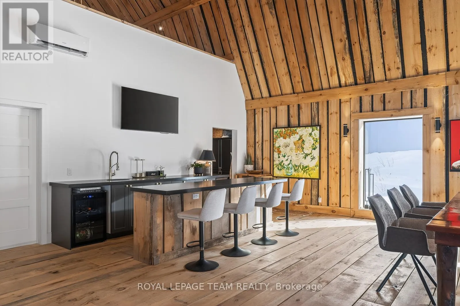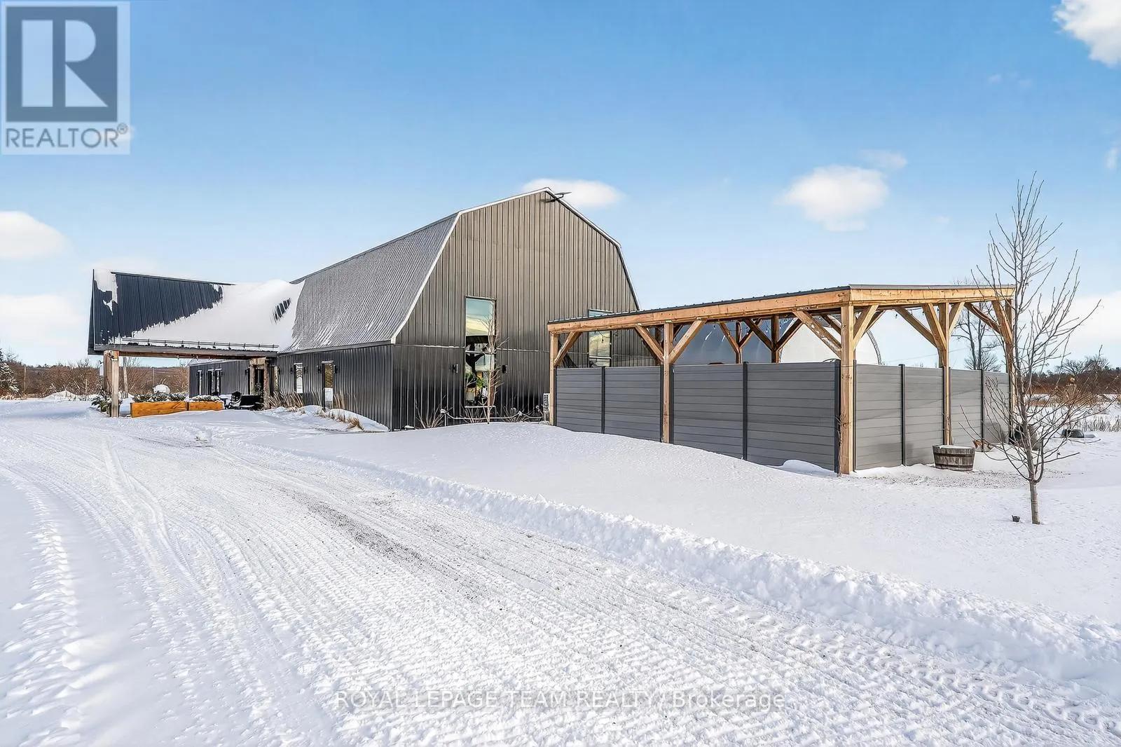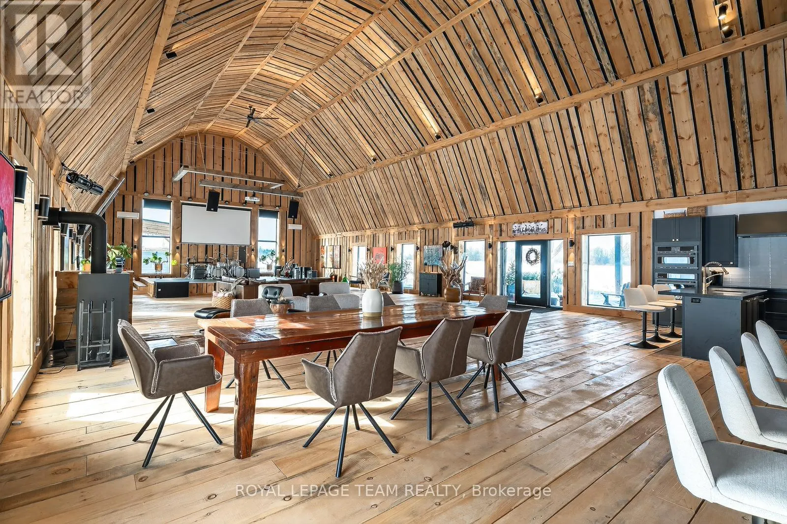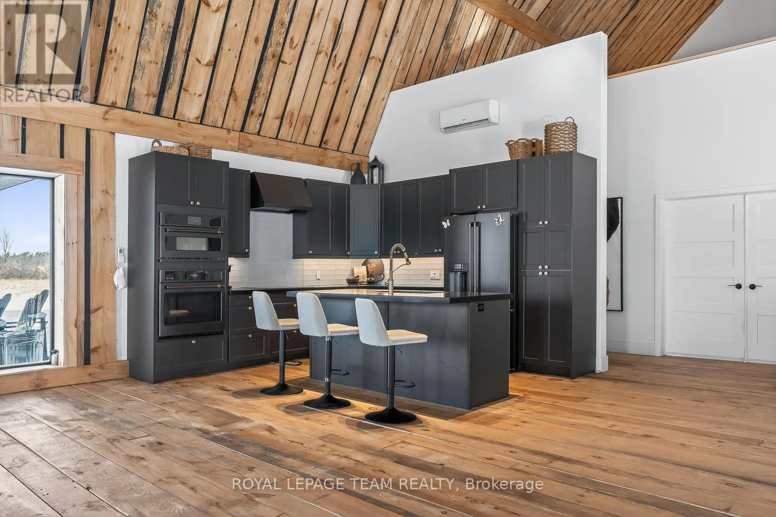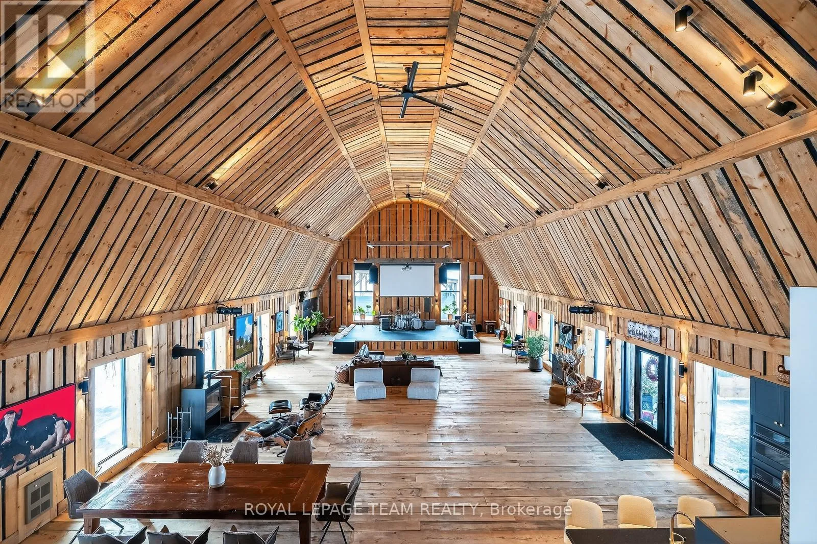 Cross Streets: Richardson Side Road at Huntmar. ** Directions: Terry Fox Drive to Richardson Side Road to Huntmar Drive. Unforgettable! A rare and remarkable barndominium offering monumental scale, moody elegance, and undeniable architectural presence. This extraordinary home reimagines barn chic through contemporary design, featuring a breathtaking Great Room with soaring domed ceiling, rich wood detailing, and dramatic lighting that create a cathedral-like atmosphere. The kitchen is striking and refined, with sleek black cabinetry, gold hardware, and a large island with farmhouse sink. The Great Room also features a chic bar, wood-burning stove, and oversized garage-style doors for flexible indoor-outdoor flow. For luxurious rest: the main-level primary offers privacy and comfort, while a loft, two additional bedrooms, and beautifully finished full bath complete the upper level. A truly once-in-a-lifetime residential rental opportunity. (id:27476)