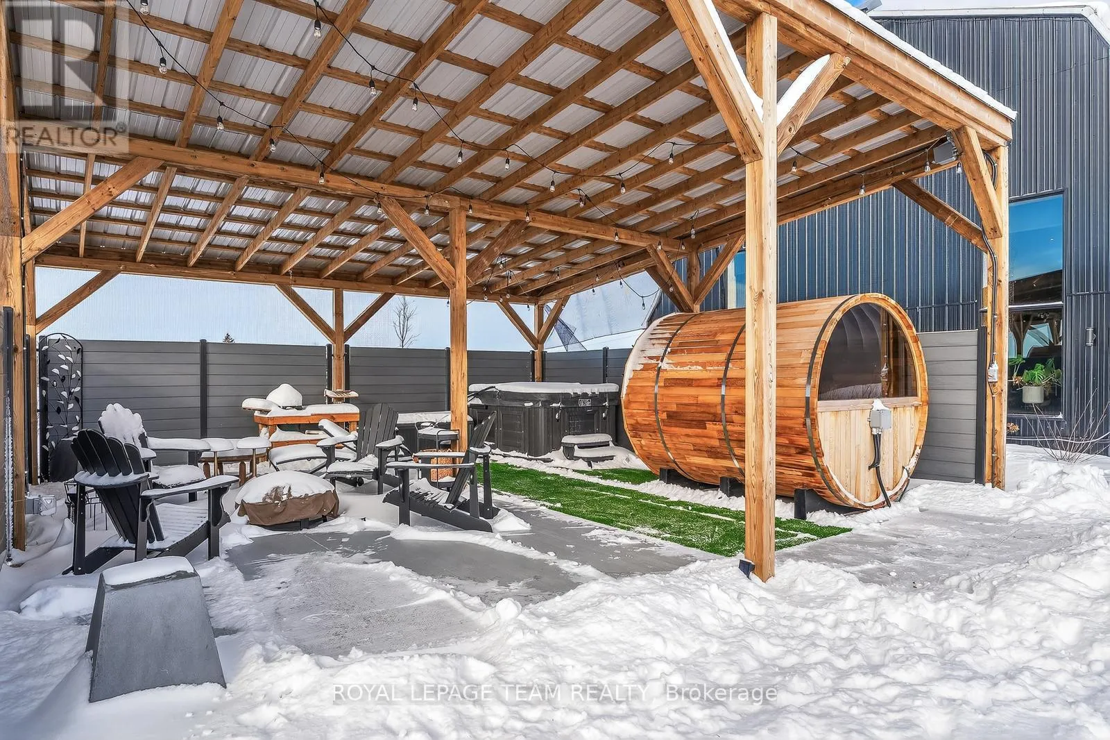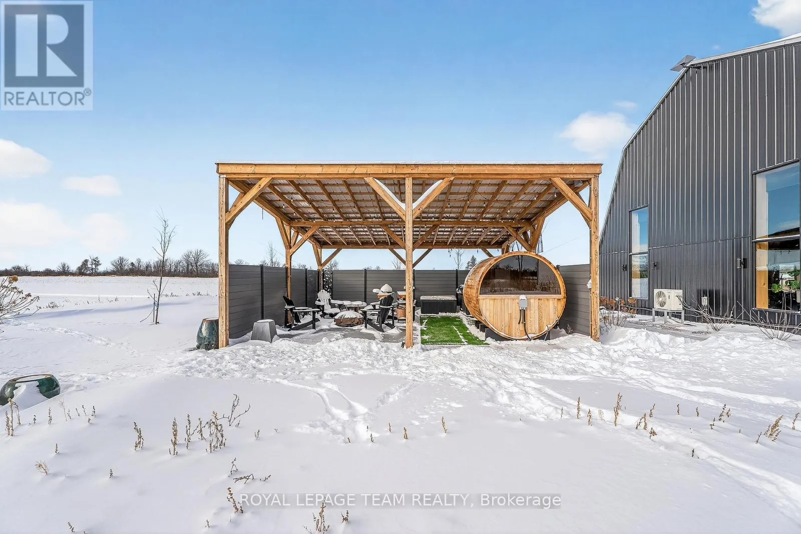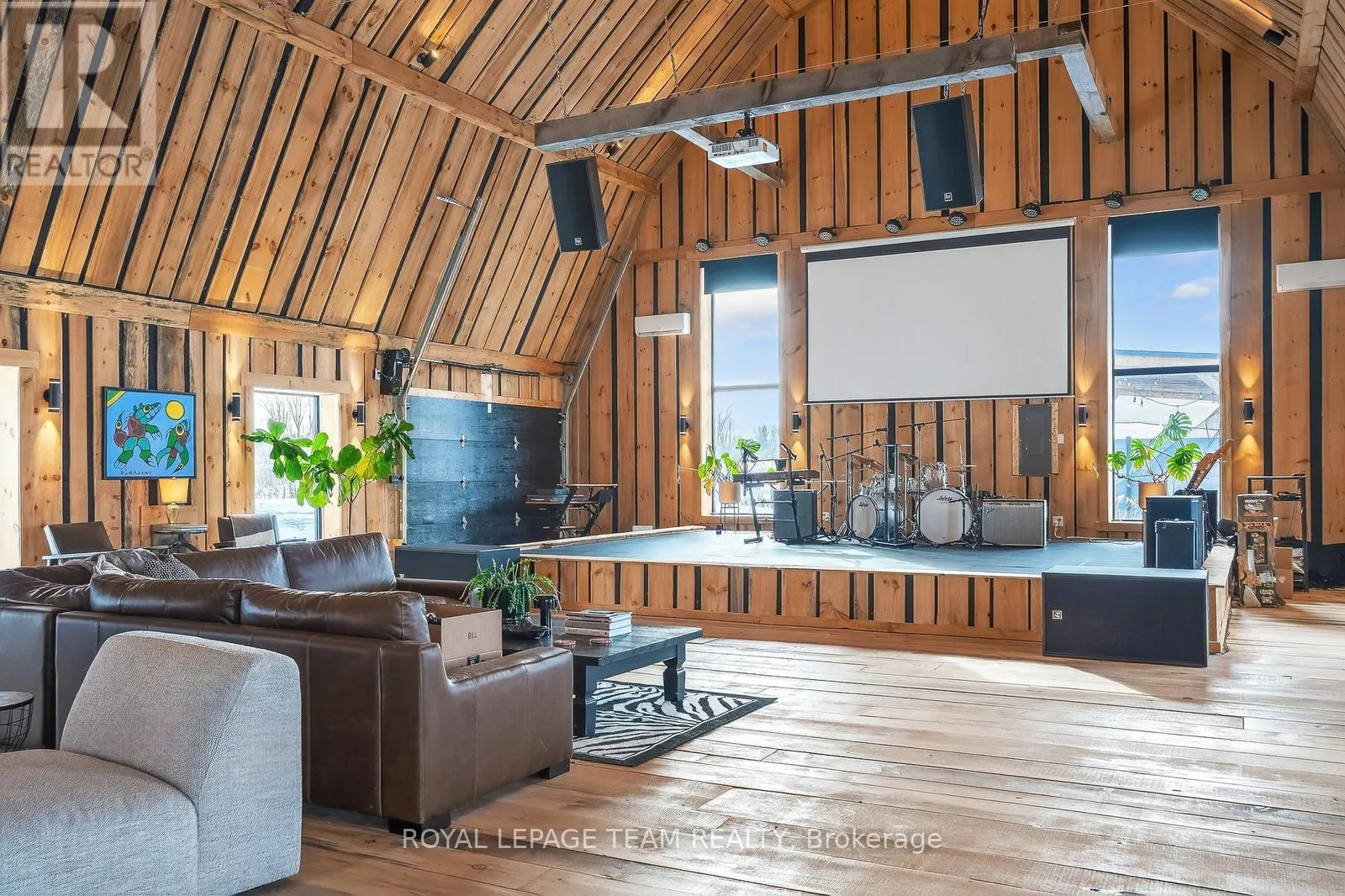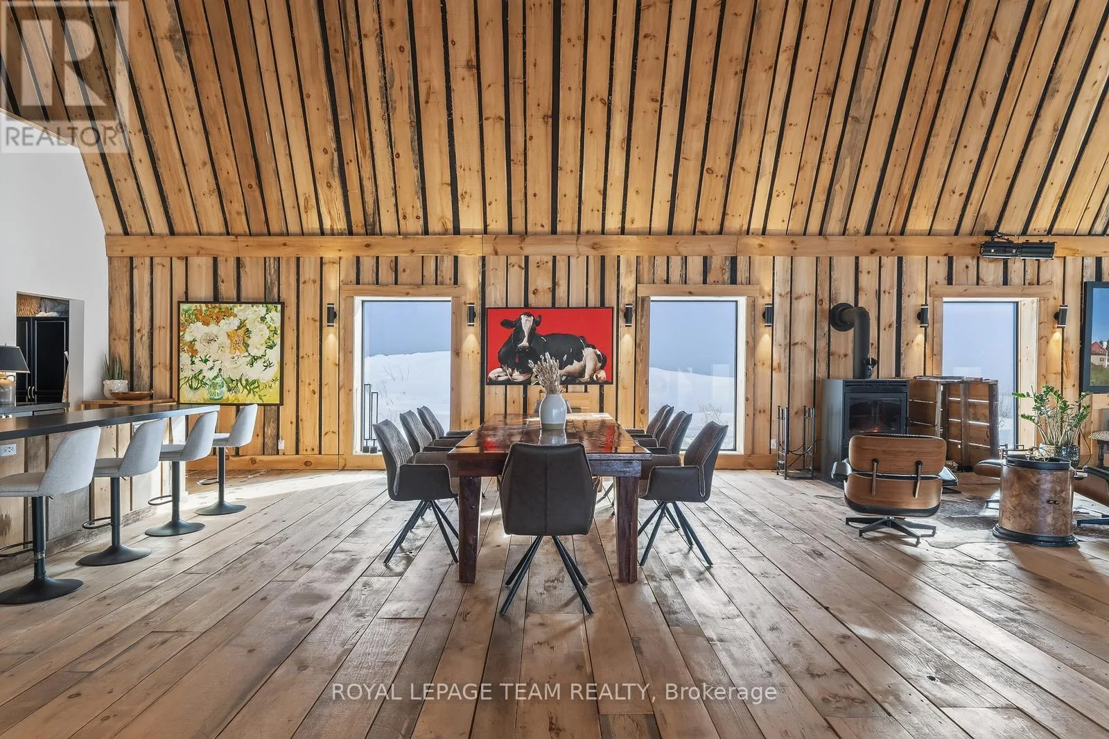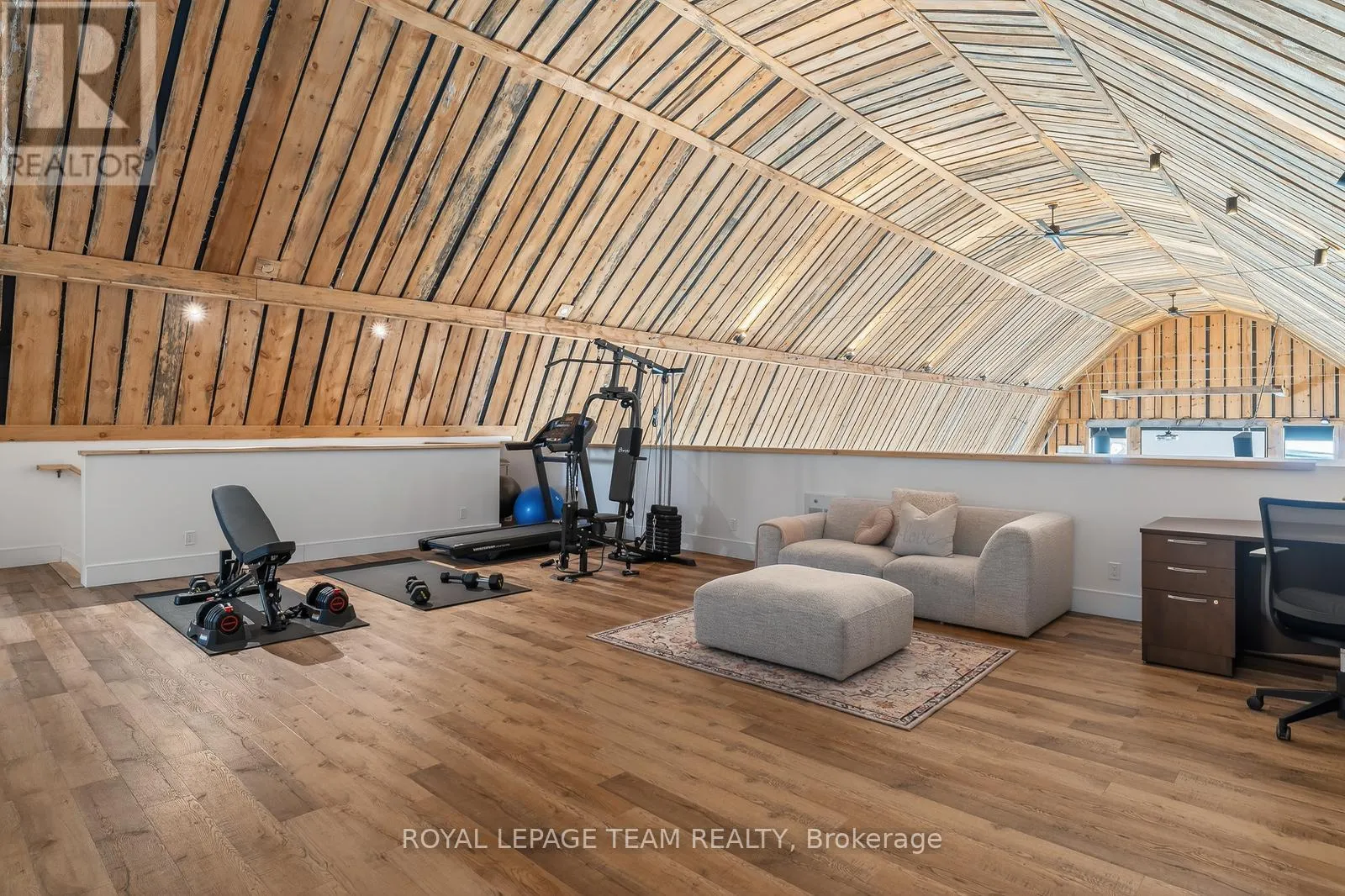 Cross Streets: Richardson Side Road at Huntmar. ** Directions: Terry Fox Drive to Richardson Side Road to Huntmar Drive. Unforgettable! A rare and remarkable barndominium offering monumental scale, moody elegance, and undeniable architectural presence. This extraordinary home reimagines barn chic through contemporary design, featuring a breathtaking Great Room with soaring domed ceiling, rich wood detailing, and dramatic lighting that create a cathedral-like atmosphere. The kitchen is striking and refined, with sleek black cabinetry, gold hardware, and a large island with farmhouse sink. The Great Room also features a chic bar, wood-burning stove, and oversized garage-style doors for flexible indoor-outdoor flow. For luxurious rest: the main-level primary offers privacy and comfort, while a loft, two additional bedrooms, and beautifully finished full bath complete the upper level. A truly once-in-a-lifetime residential rental opportunity. (id:27476)
