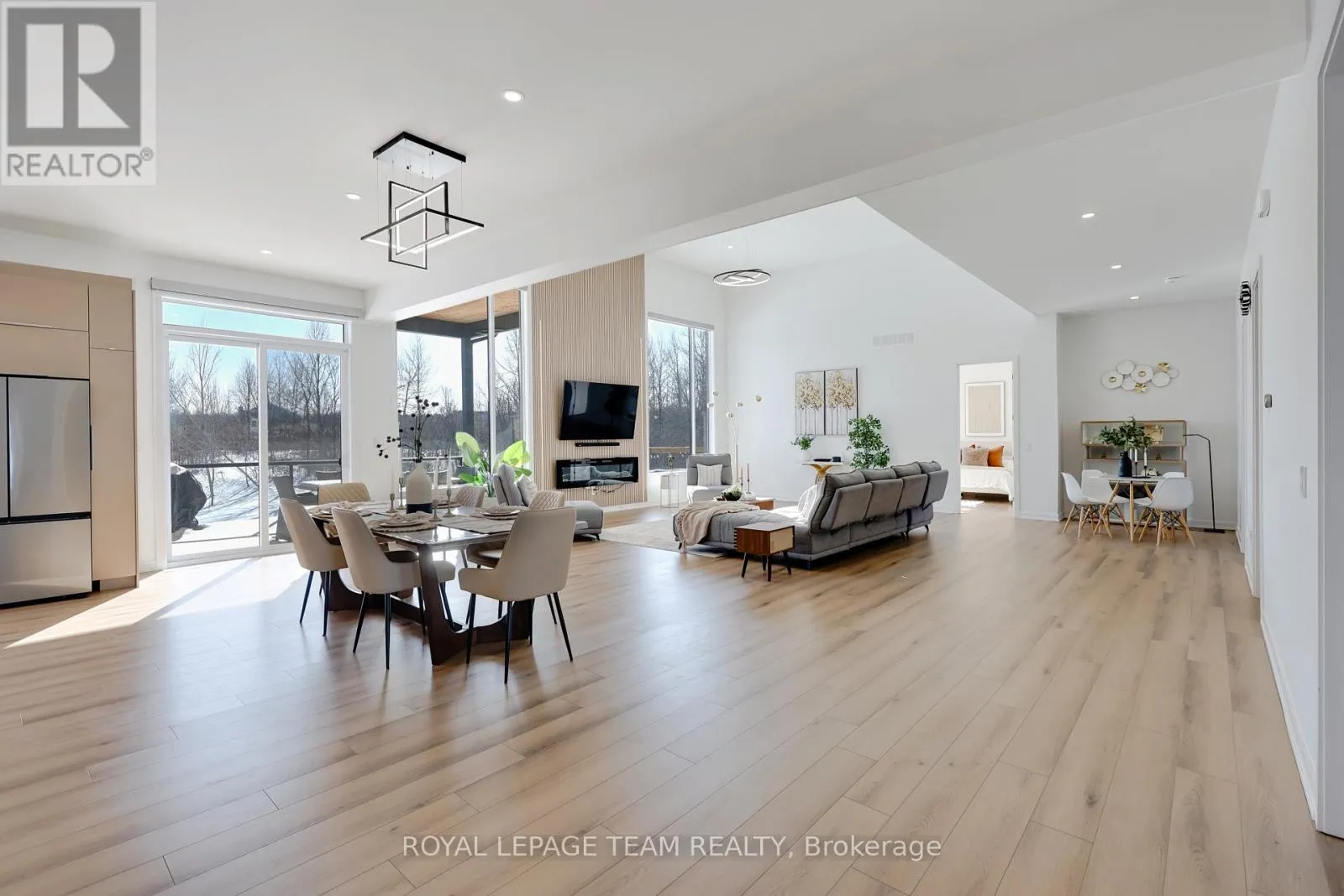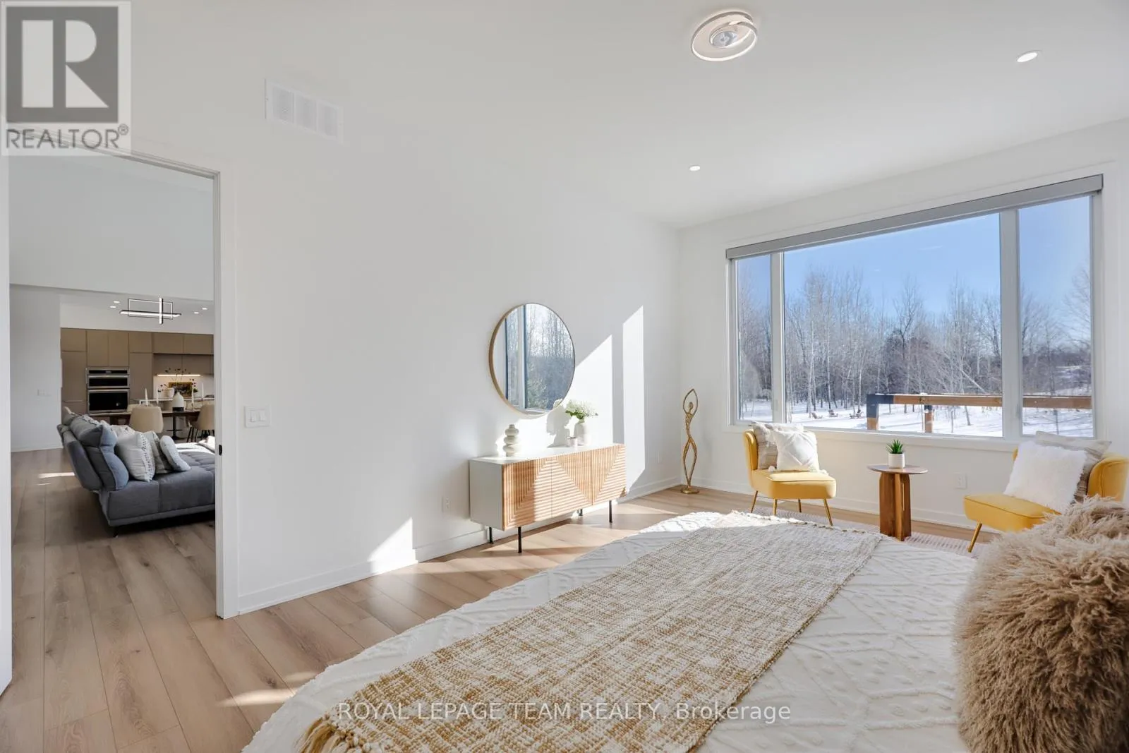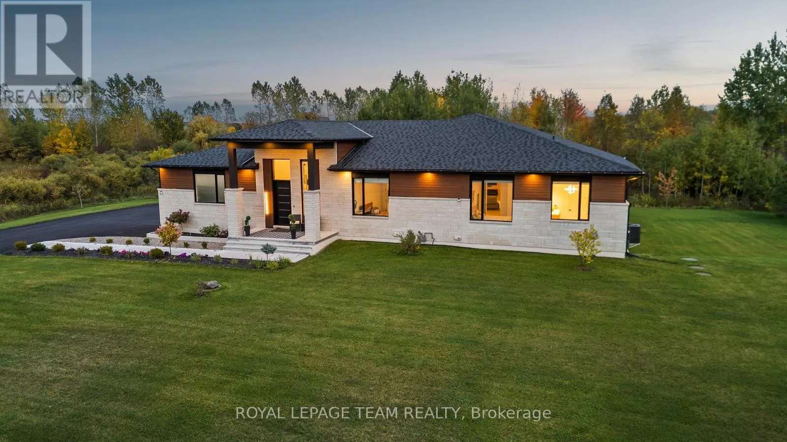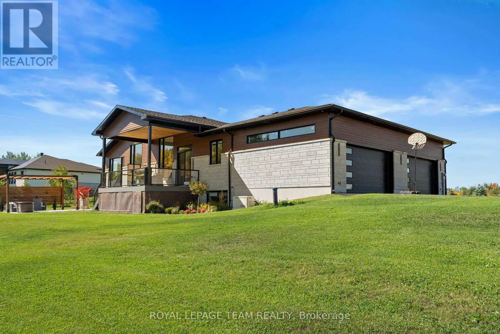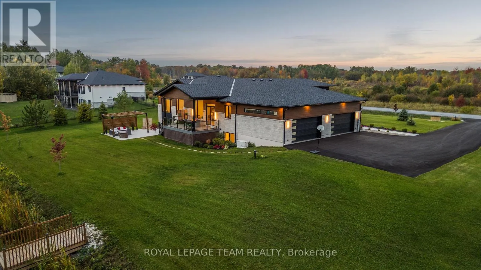 Cross Streets: Marchurst Rd and Synergy Way. ** Directions: Head Southwest on March Road, turn right onto Marchurst Rd, then turn left onto Synergy Way, turn left to stay on Synergy Way, the home will be on the left. This custom-built luxury bungalow offers over 5600 sq ft of total finished living space, set on a rare estate-sized lot of over 2 acres in an upscale, low-density community. Built in 2023, the home combines modern design with exceptional space and privacy, while remaining conveniently located near major amenities and Ottawa's high-tech employment hub. The thoughtfully designed layout includes 5 bedrooms and 4 bathrooms, with 3 bedrooms on the main level and 2 bedrooms in the lower level, ideal for multi-generational living, flexible family needs, or home office use. Ceiling heights reach up to 15 ft in the foyer and living room, with 10 ft ceilings across the main level, complemented by large black-framed double-pane windows that flood the home with natural light and enhance its architectural presence. The open-concept living area flows seamlessly into a modern kitchen featuring a waterfall quartz island, full-height quartz backsplash, custom soft-close cabinetry, and a premium appliance package. The primary suite offers a private retreat with a spa-inspired ensuite, including a freestanding soaking tub, glass-enclosed rain shower with body jets, and a custom walk-in closet. The lower level extends the living space with a spacious recreation area, electric fireplace (included), dedicated home gym, additional bedrooms, and a full bathroom finished to the same high standard as the main floor. Outdoors, the property features professionally landscaped grounds, interlock patios and walkways, a covered terrace, custom pergola, mature trees, multi-zone irrigation, and architectural exterior lighting. Additional highlights include a 4-car attached garage with epoxy flooring, extensive parking, smart home technology, comprehensive LED lighting, full security system, and electric fireplaces on both levels. This move-in-ready bungalow presents a rare opportunity to enjoy space, privacy, and modern luxury in one of the area's most desirable communities. (id:27476)
