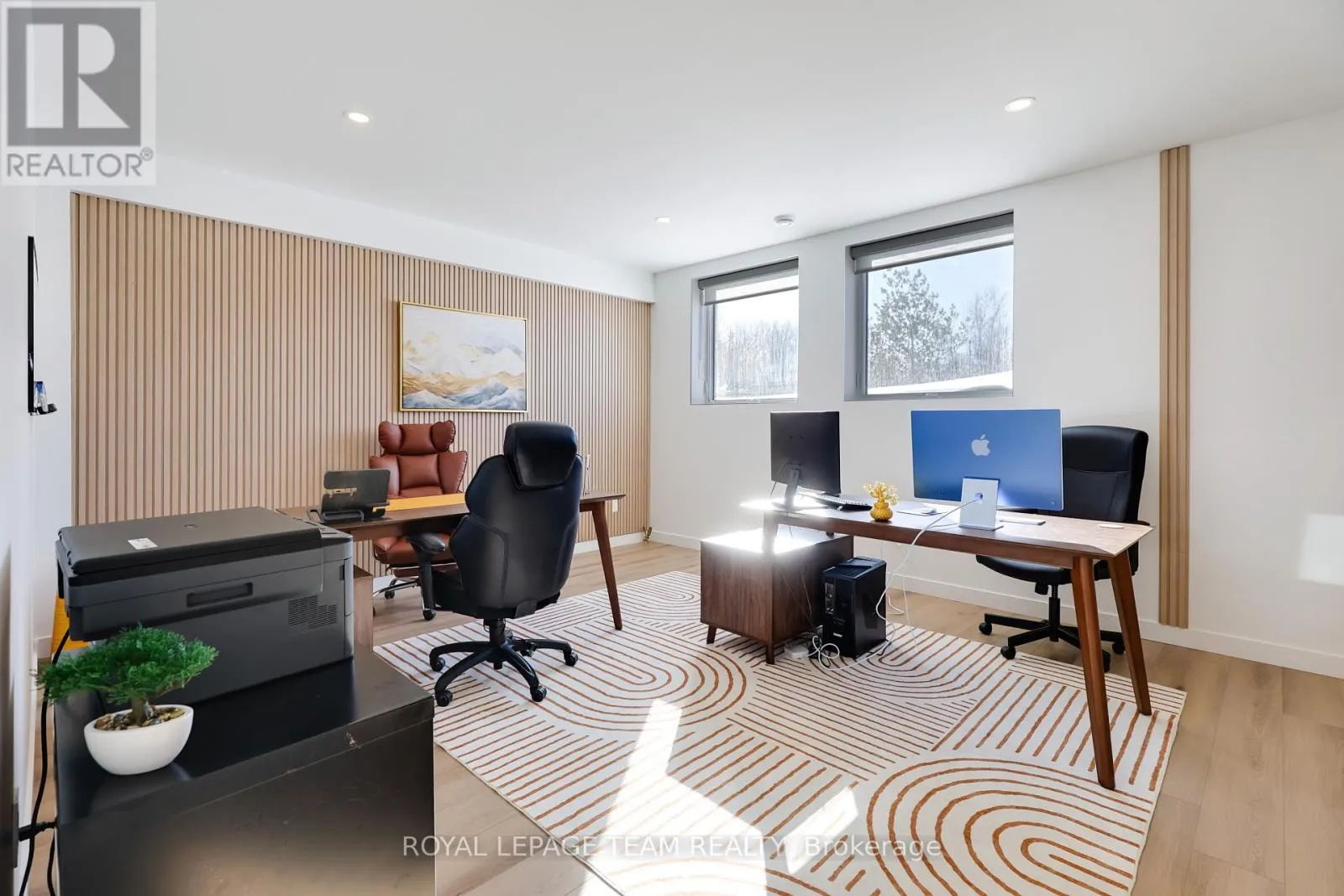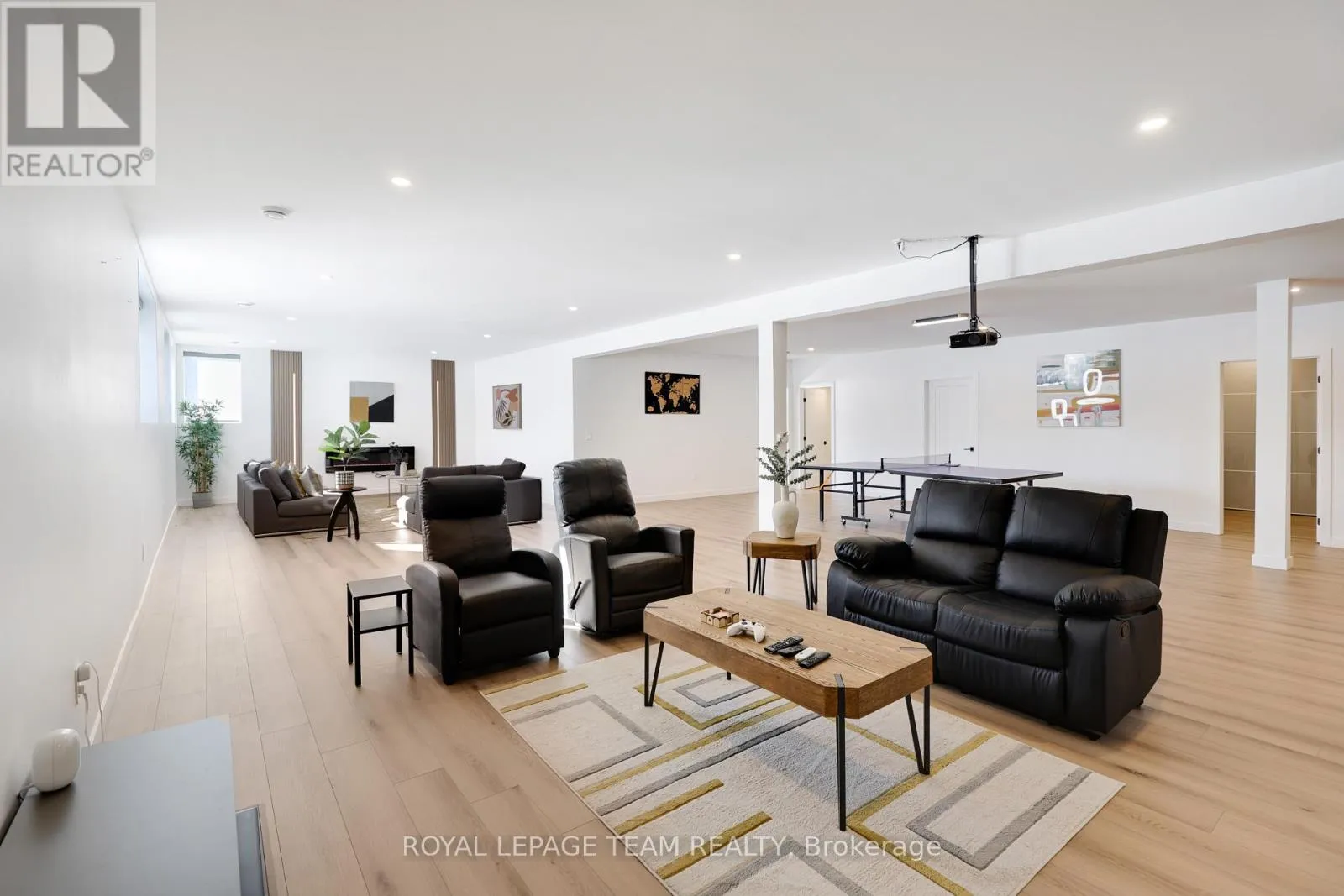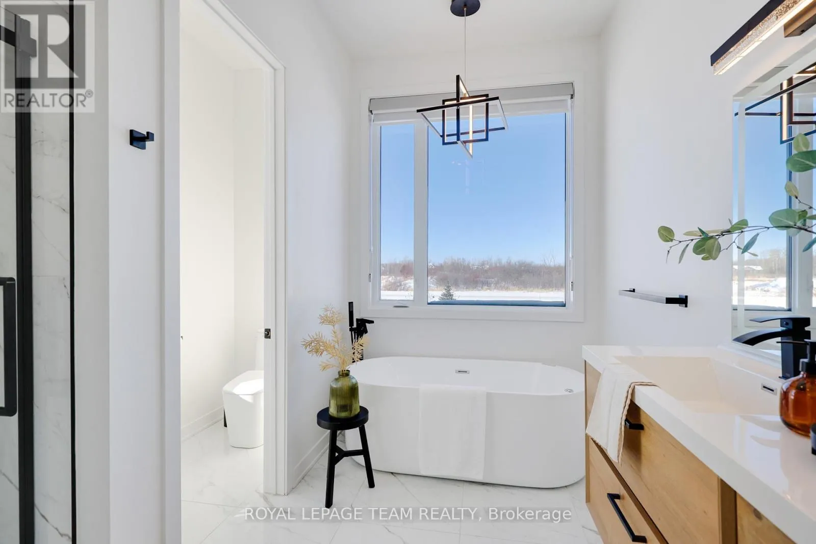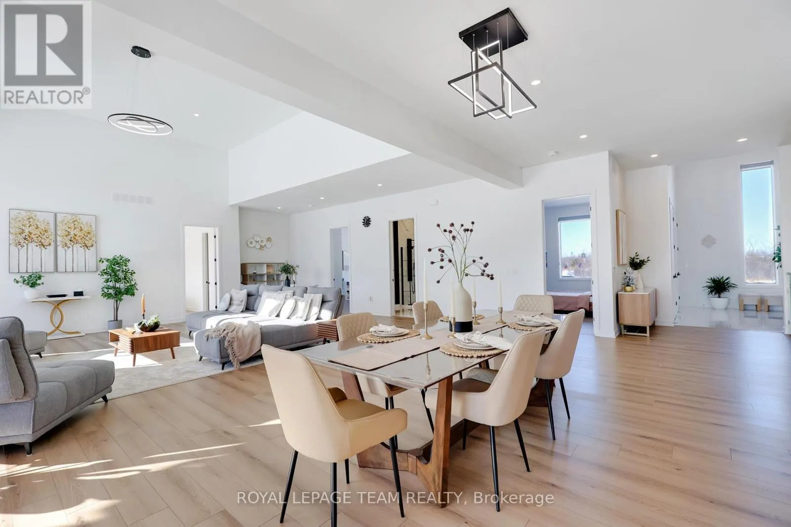 Cross Streets: Marchurst Rd and Synergy Way. ** Directions: Head Southwest on March Road, turn right onto Marchurst Rd, then turn left onto Synergy Way, turn left to stay on Synergy Way, the home will be on the left. This custom-built luxury bungalow offers over 5600 sq ft of total finished living space, set on a rare estate-sized lot of over 2 acres in an upscale, low-density community. Built in 2023, the home combines modern design with exceptional space and privacy, while remaining conveniently located near major amenities and Ottawa's high-tech employment hub. The thoughtfully designed layout includes 5 bedrooms and 4 bathrooms, with 3 bedrooms on the main level and 2 bedrooms in the lower level, ideal for multi-generational living, flexible family needs, or home office use. Ceiling heights reach up to 15 ft in the foyer and living room, with 10 ft ceilings across the main level, complemented by large black-framed double-pane windows that flood the home with natural light and enhance its architectural presence. The open-concept living area flows seamlessly into a modern kitchen featuring a waterfall quartz island, full-height quartz backsplash, custom soft-close cabinetry, and a premium appliance package. The primary suite offers a private retreat with a spa-inspired ensuite, including a freestanding soaking tub, glass-enclosed rain shower with body jets, and a custom walk-in closet. The lower level extends the living space with a spacious recreation area, electric fireplace (included), dedicated home gym, additional bedrooms, and a full bathroom finished to the same high standard as the main floor. Outdoors, the property features professionally landscaped grounds, interlock patios and walkways, a covered terrace, custom pergola, mature trees, multi-zone irrigation, and architectural exterior lighting. Additional highlights include a 4-car attached garage with epoxy flooring, extensive parking, smart home technology, comprehensive LED lighting, full security system, and electric fireplaces on both levels. This move-in-ready bungalow presents a rare opportunity to enjoy space, privacy, and modern luxury in one of the area's most desirable communities. (id:27476)