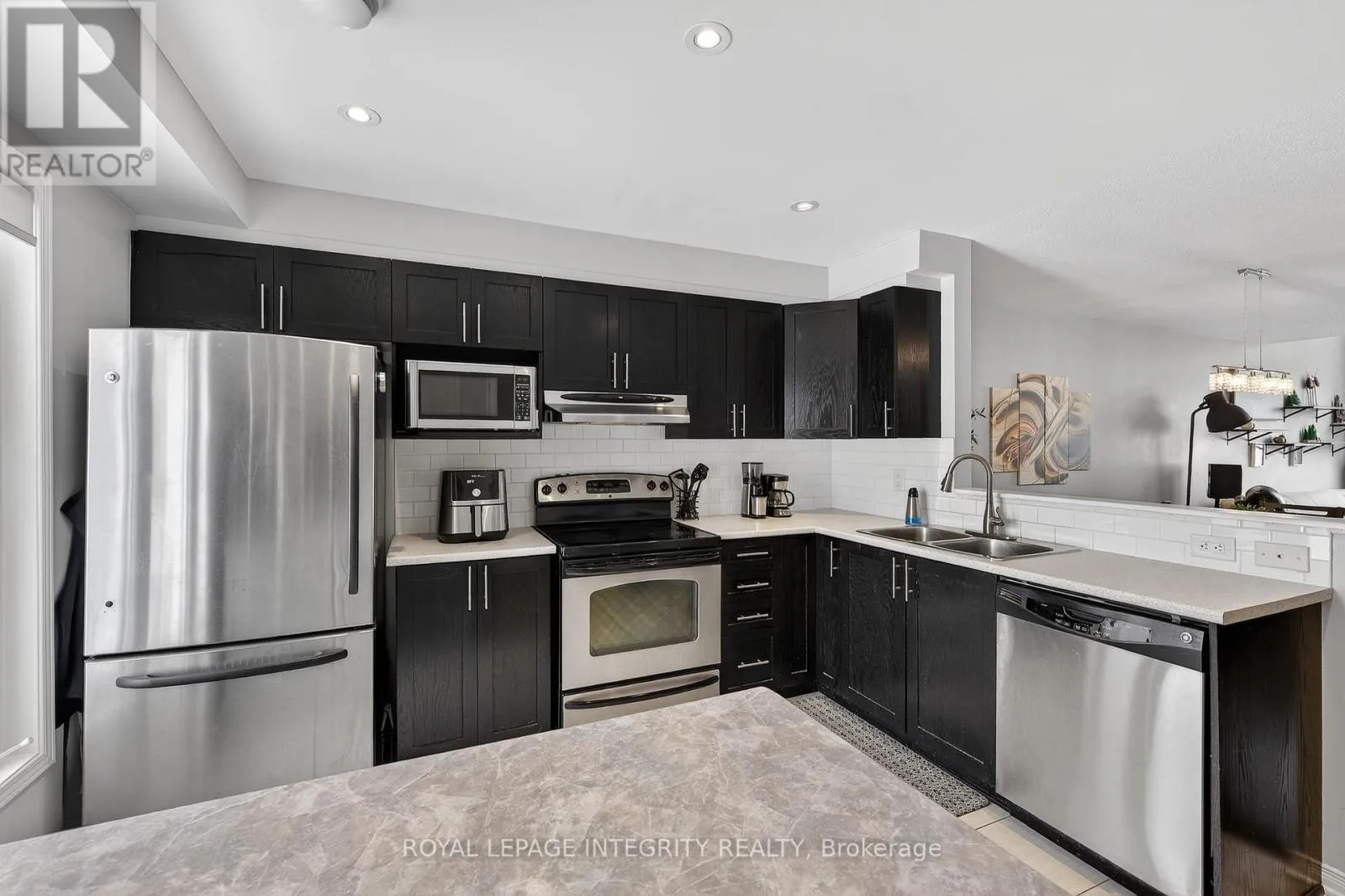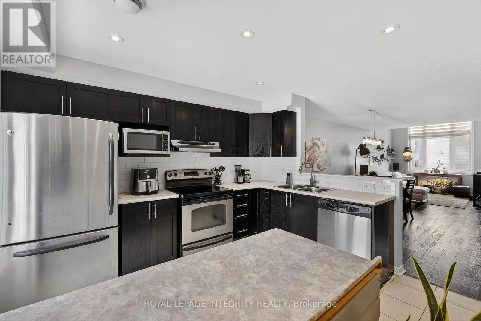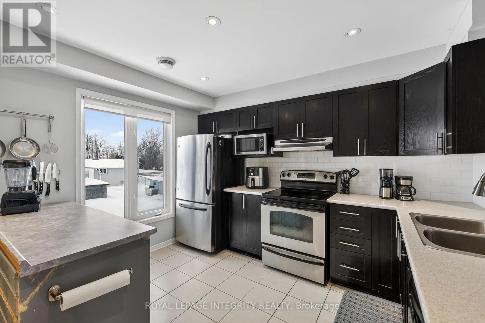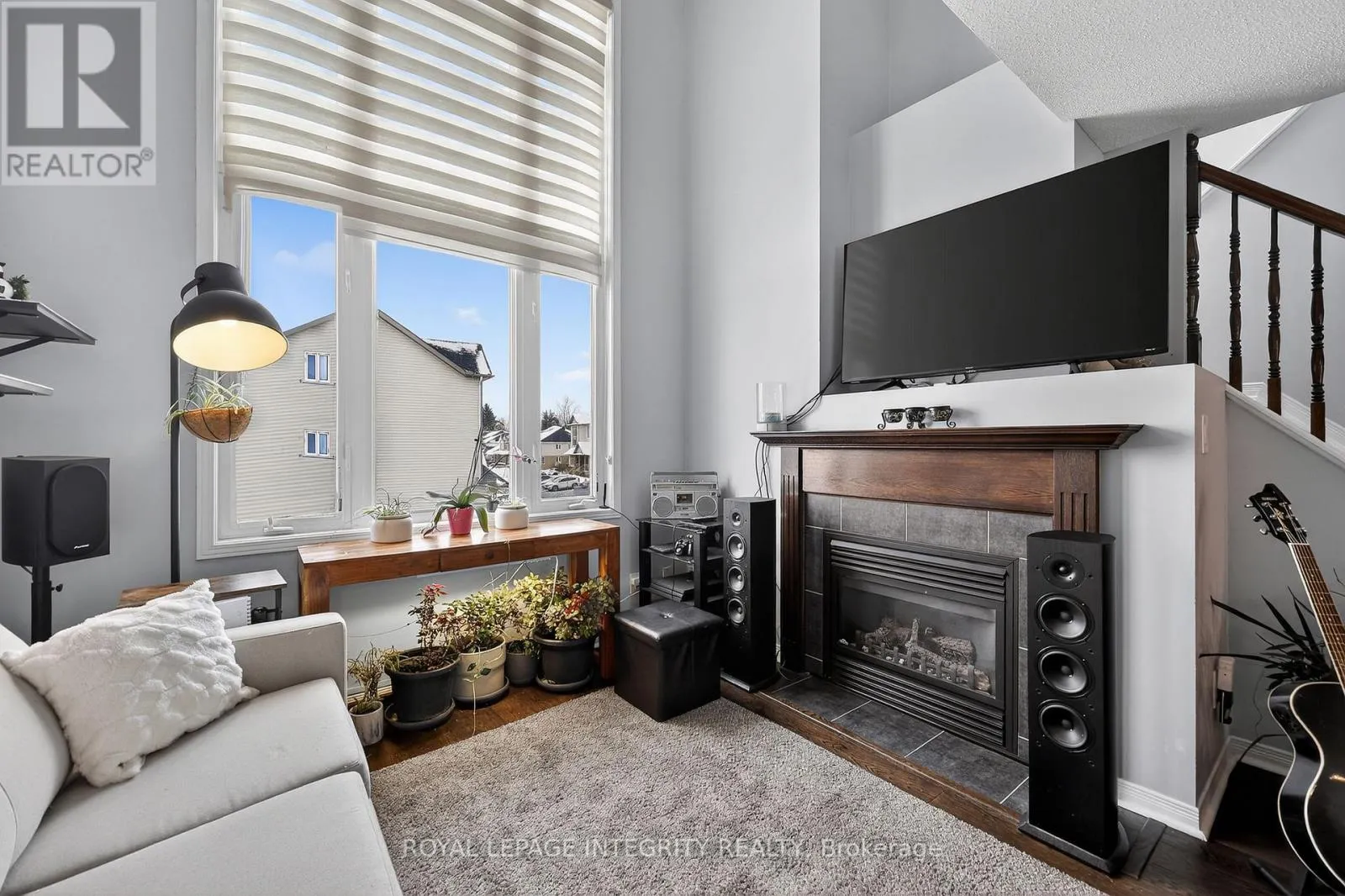 Cross Streets: Renaud and Glenlevit. ** Directions: Navan Road to Left on Renaud to Right on Glenlevit to Left on Galston. Bright and well-maintained upper-unit terrace home offering an ideal layout for professionals, first-time buyers, or investors. The inviting chalet-style living room features a gas fireplace and second-floor loft overlooking the space below. The open-concept main floor includes a modern kitchen with stainless steel appliances, shaker-style cabinetry, subway tile backsplash, double sinks, and pot lighting, with access to a private balcony.The spacious living and dining area is filled with natural light from a large picture window. Upstairs, the generous primary bedroom offers a cheater ensuite and private balcony. A well-sized second bedroom and a versatile loft-perfect for a home office or lounge area-complete the upper level.Conveniently located with easy access to Orléans, shopping, transit, and downtown Ottawa via Navan Road. (id:27476)