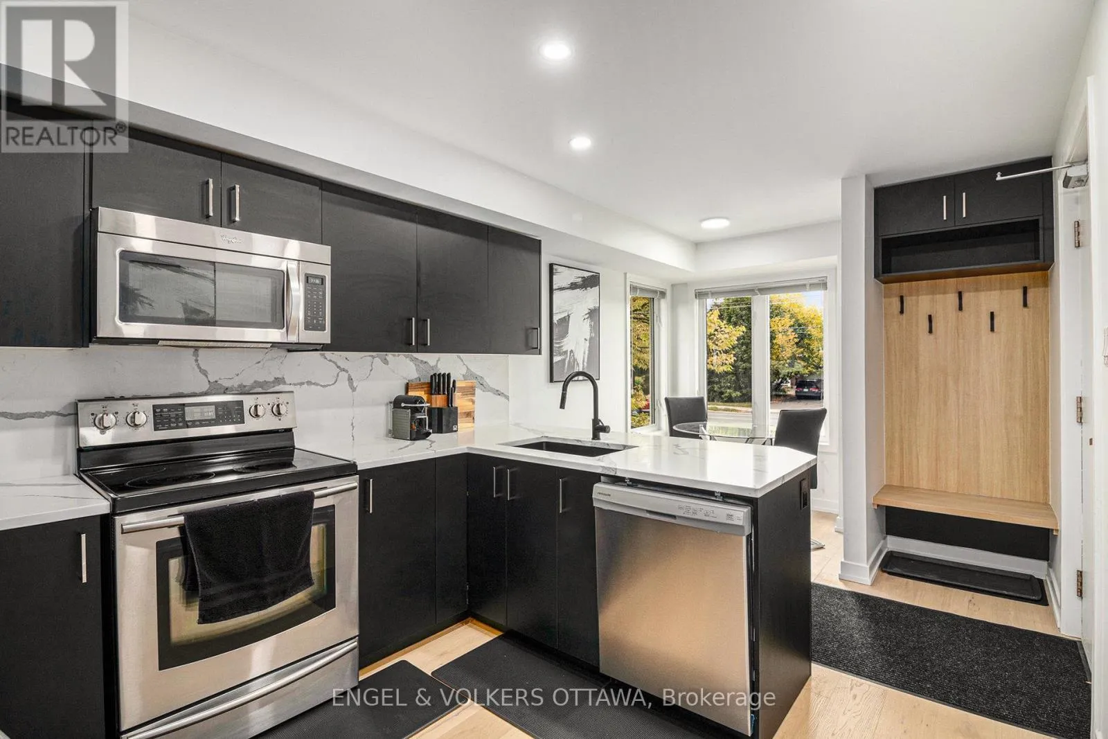 Innes and Dorima NEW PRICE! Bright end-unit stacked condo (2 levels) with 2 bedrooms + 1.5 baths and extra natural light. Renovated kitchen with quartz countertop + matching quartz backsplash, refreshed cabinetry/hardware, and modern sink. Fresh paint, engineered hardwood on the main level, and pot lights throughout. Dedicated parking + in-unit storage. Minutes to shopping, transit, restaurants, and parks along Innes Rd. Move-in ready and ideal for first-time buyers, downsizers, or investors. (id:27476)