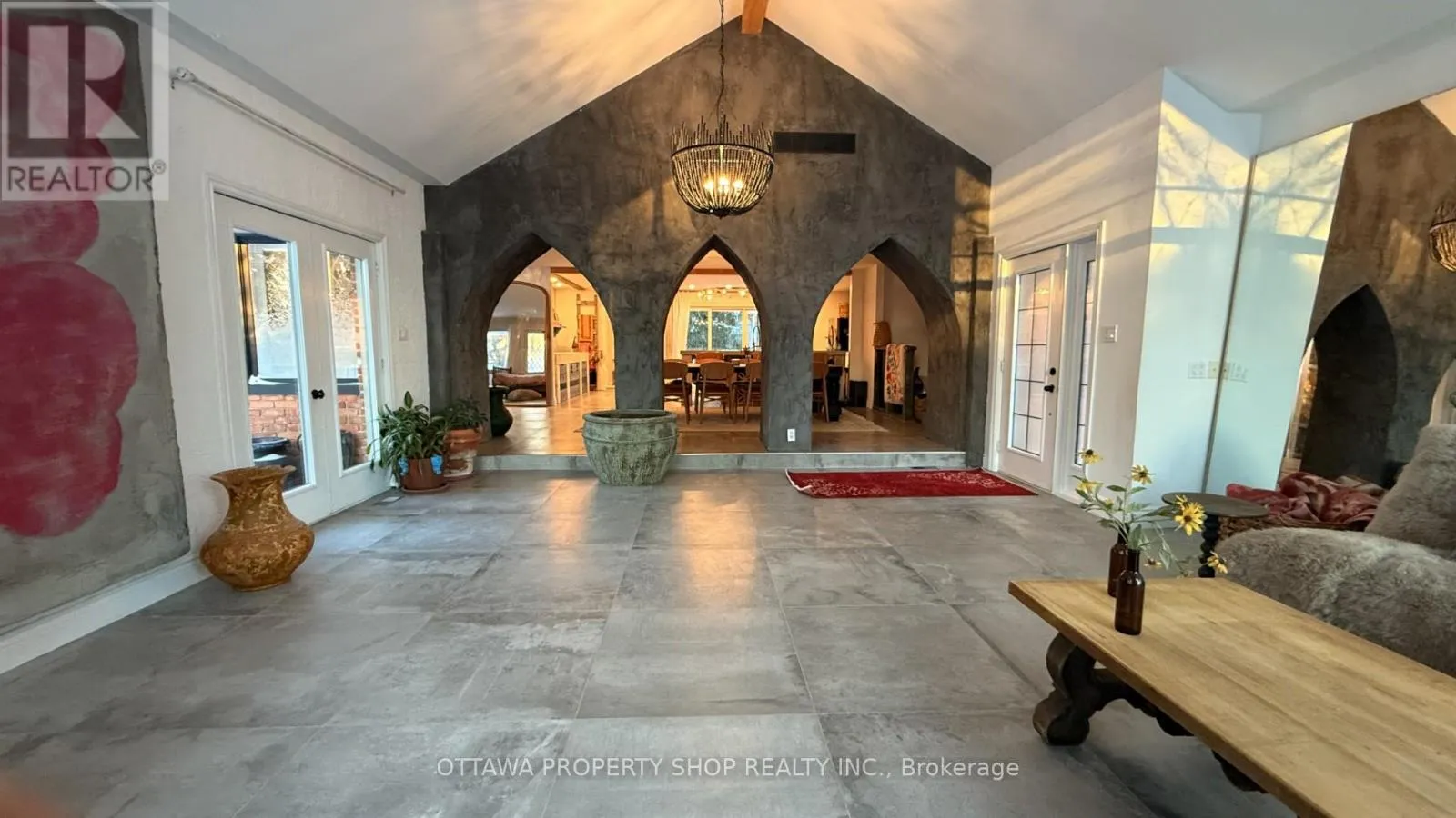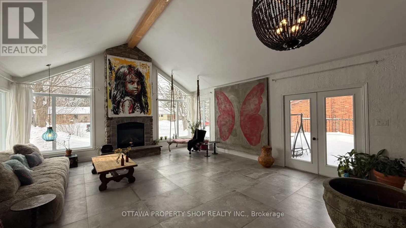 Cross Streets: Penfield and Rutherford. ** Directions: from Teron, right on Penfield, right on Rutherford. An extraordinarily rare residence in the heart of prestigious Beaverbrook, Kanata, this one-of-a-kind bungalow offers a level of craftsmanship and global elegance seldom seen in Ottawa. Originally a three-bedroom bungalow, it has been artfully re-imagined into a spacious two-bedroom plus one layout, emphasizing flow, scale, and refined living. The showpiece of the home is the spectacular Spanish-inspired main-floor family room addition (approx. 510 sq. ft., built 2010), featuring soaring 14-foot ceilings, dramatic oversized windows, and a striking gas fireplace, creating a grand yet inviting space ideal for both entertaining and everyday luxury. Equally impressive is the massive formal dining room, complete with a wood-burning fireplace and sliding doors leading to the private backyard, offering seamless indoor-outdoor living and an exceptional setting for gatherings. The chef's kitchen is expansive and elegant, showcasing handmade stone countertops, imported French cabinetry, and timeless design that blends beauty with functionality. Throughout the home, curated finishes include imported porcelain ceramic floors from France, centuries-old palace doors from India, and handcrafted French lighting, reflecting a rare commitment to detail and authenticity. Major updates such as roof, windows, and furnace provide modern comfort and peace of mind.Set on a fully fenced, private backyard, this home offers tranquility within one of Ottawa's most established neighbourhoods, moments from public transit, shopping, schools, golf courses, parks, and fine dining.A truly distinctive offering-this is not just a home, but a statement of timeless luxury, character, and world-class design. (id:27476)