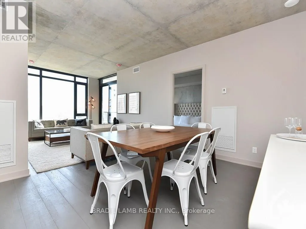 CATHERINE / BANK This is a bright and spacious 2BD with two full bath unit approx. 1002sqft facing South West with unobstructed views into the Glebe. Dining, kitchen and living are included in the dimensions under dining. Quiet and comfortable with a great layout, the unit has modern quality finishes such as exposed concrete ceiling and feature walls, Stainless Steel Kitchen appliances, in-suite laundry and Gas hook up on the balcony for BBQs. Unit features high end Quartz counters and hardwood floors throughout. SoBa is centrally located close to all amenities and within walking distance of transit, entertainment, schools, dinning and more. Building is equipped with indoor gym, outdoor seasonal pool and party room. Parking& locker Combo- additional spot if desired can be purchased separately for $44,900. Actual finishes and furnishings in unit may differ from those shown in photos., Flooring: Hardwood. (id:27476)