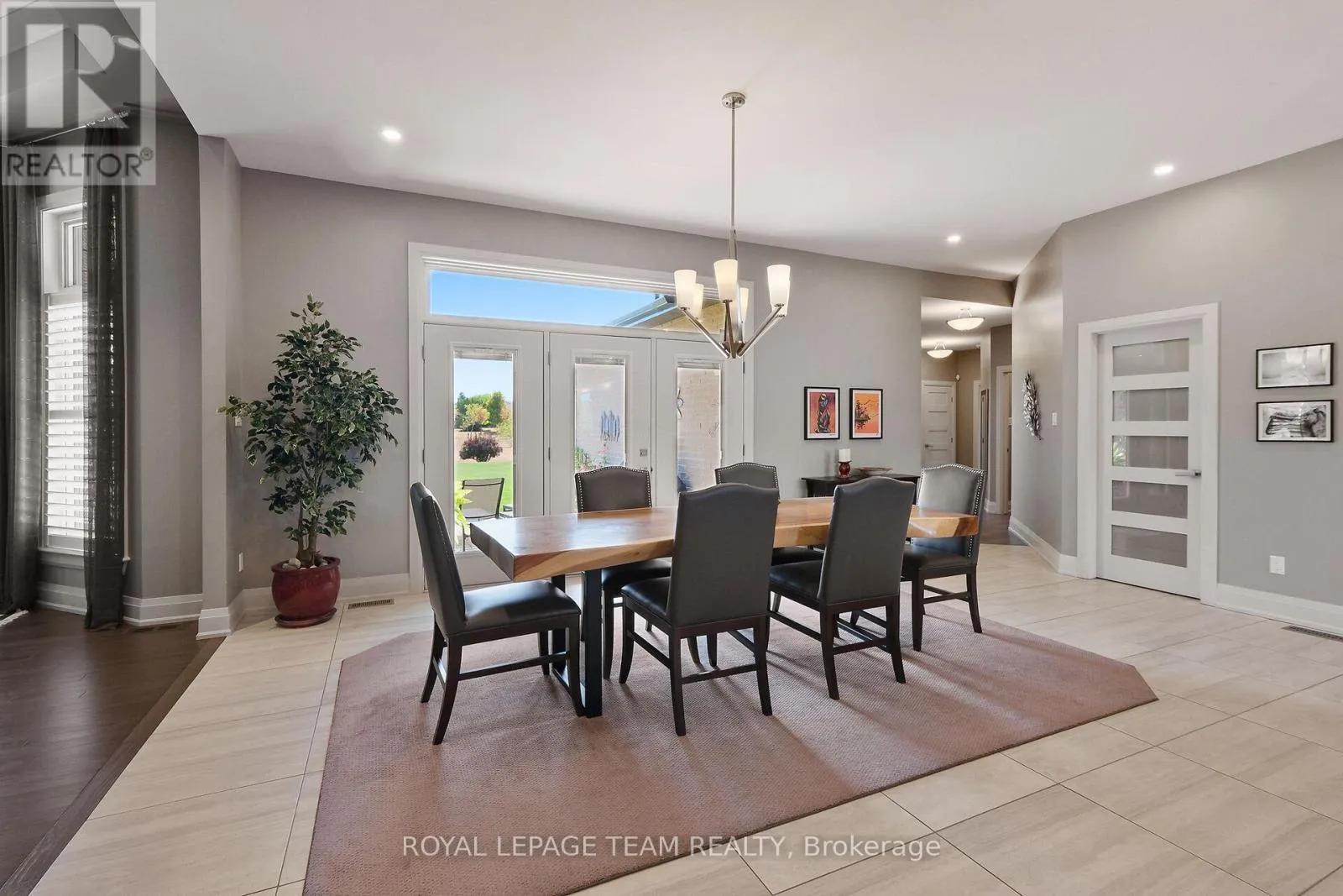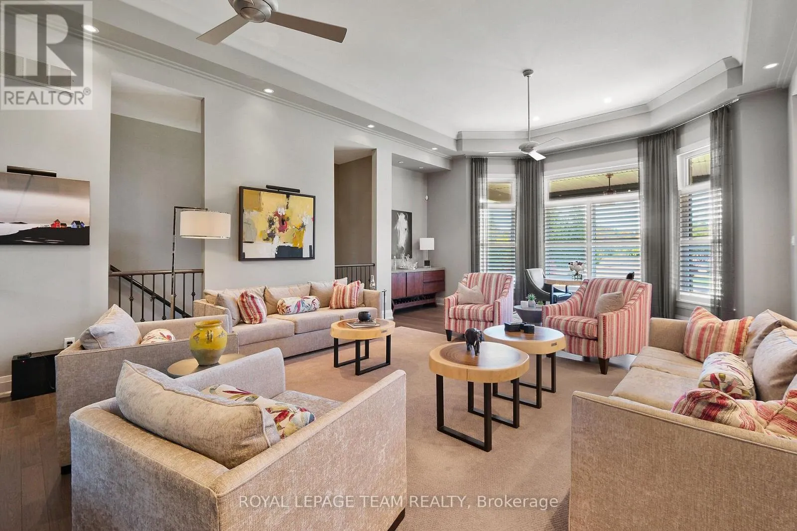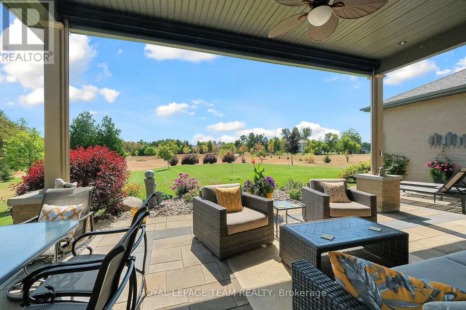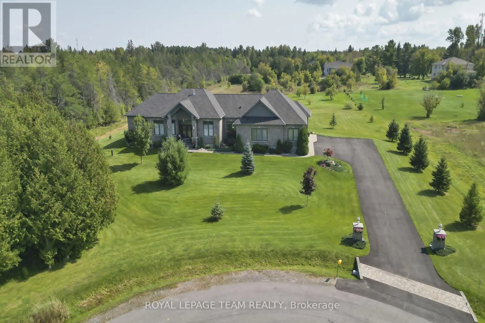 Cross Streets: Richardson Side Rd. ** Directions: Richardson Side Rd to Gentry Rd to Shamus Way. Welcome to this executive-style bungalow offering refined luxury and timeless design on a beautifully landscaped 2+ acre country lot. Impeccably built with a stately stone and brick exterior; this home exudes sophistication with warmth from the moment you arrive. The covered front porch and elegant glass entry open to soaring tall ceilings, rich hand-scraped hardwood floors, and expansive transom windows that flood the home with natural light. The open-concept living space centers around a striking double-sided fireplace and flows seamlessly into the designer Deslaurier kitchen, a true showpiece featuring full-height custom cabinetry, granite countertops, built-in stainless steel appliances, and a grand island with seating for four; perfectly designed for entertaining or for everyday living. The spacious primary suite offers a tranquil retreat with large windows, a walk-in closet, and a spa-inspired ensuite showcasing dual vanities and contemporary finishes. Additional bedrooms and a main-floor office and cozy den provide flexibility for family or remote work. Enjoy the relaxed country air outside under a covered 16ft x 36ft back patio with discreet power sunscreen, while looking out onto manicured lawns, lush gardens, and a completely private backdrop, ideal for gatherings or peaceful evenings as the sun sets. An attached oversized 4-car garage with extra tall insulated doors, direct basement access, a fully paved driveway with decorative lit stone pillars, and impeccable attention to detail complete this exceptional rural property. Experience the perfect blend of luxury, comfort, and craftsmanship in this remarkable bungalow. Truly a home to fall in love with! Welcome Home! (id:27476)