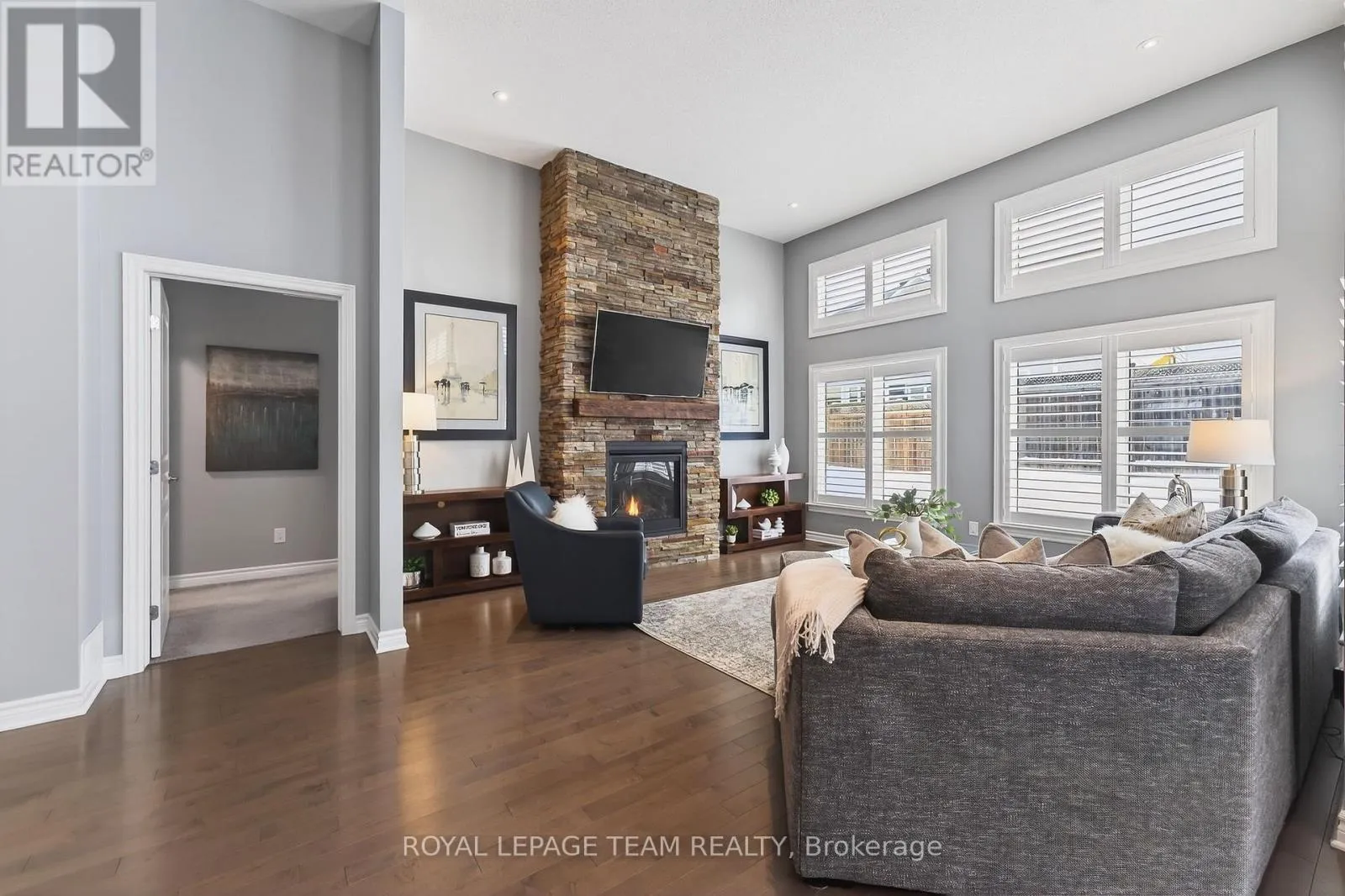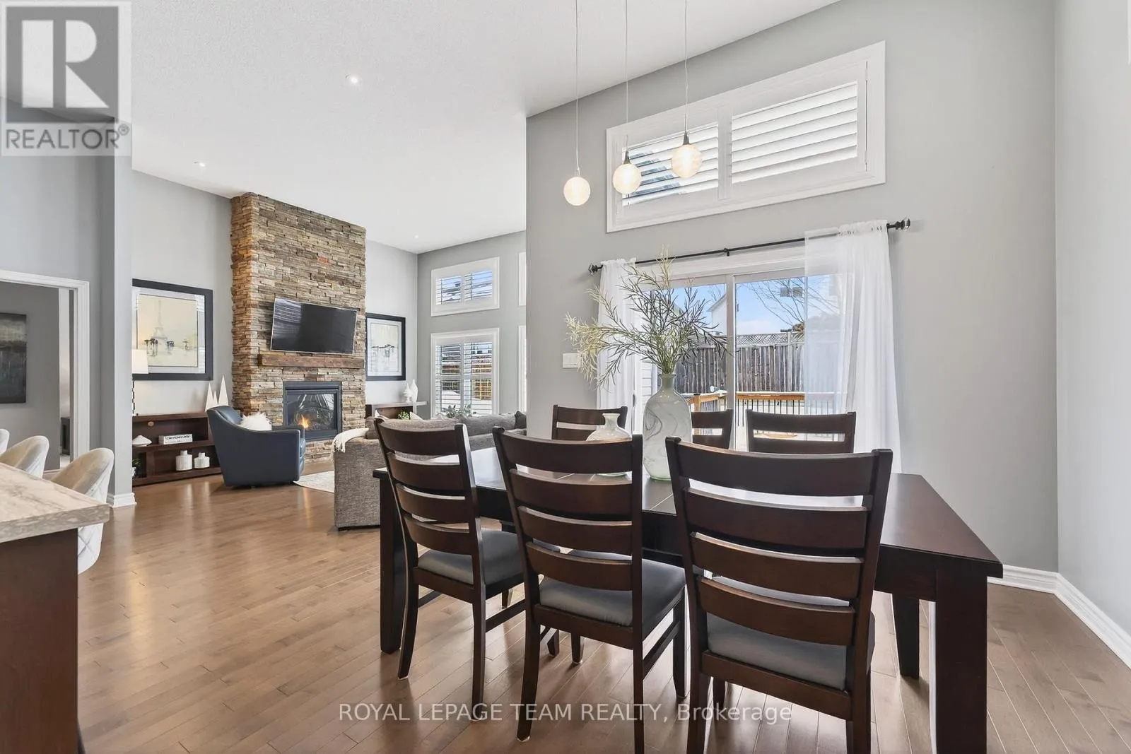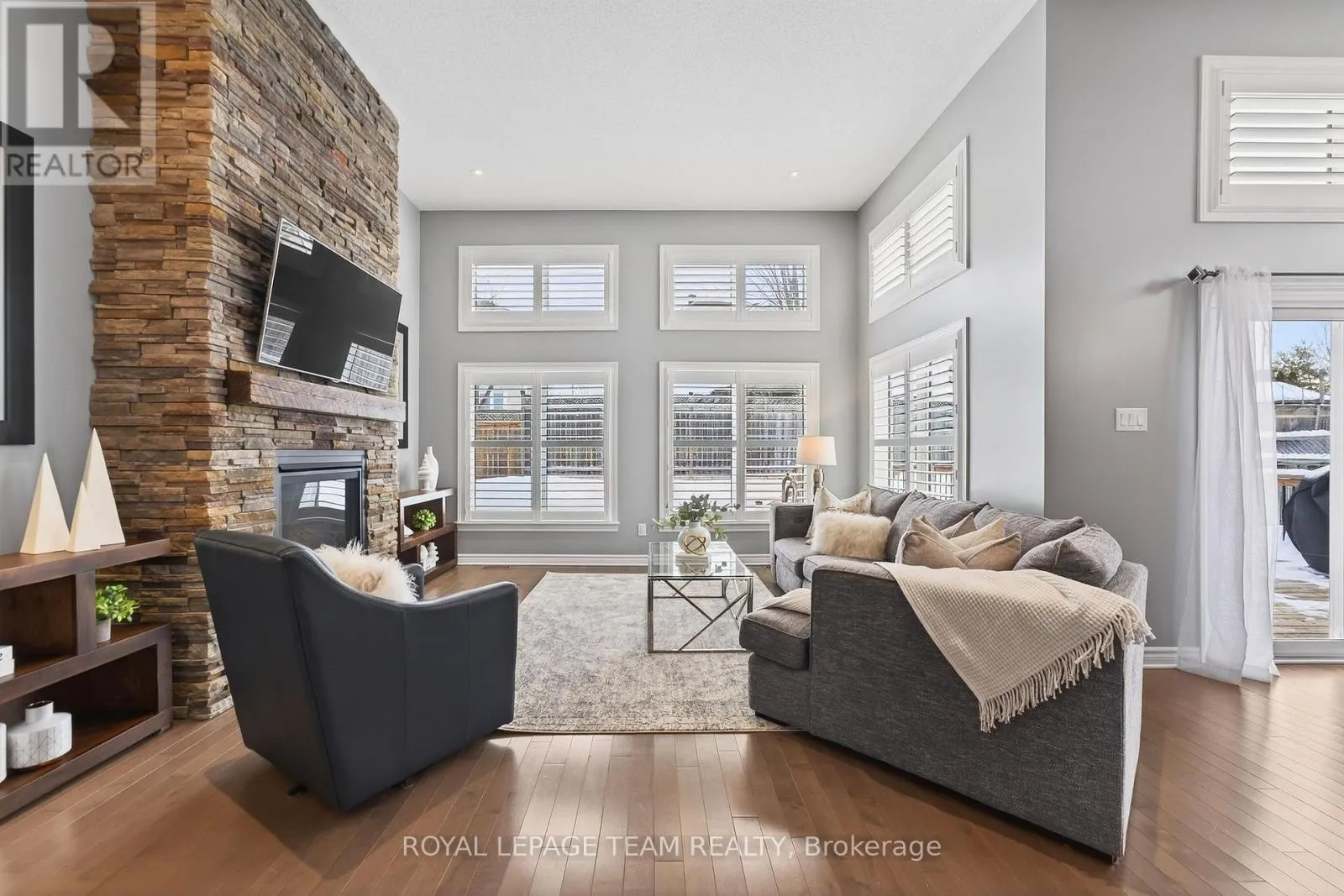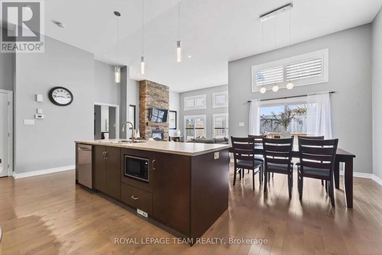 Cross Streets: West Ridge and Rockson. ** Directions: West Ridge Dr. in Stittsville, Turn (west) onto Rockson Crescent. Welcome to 834 Rockson Crescent - a highly sought-after custom-built Metric home offering 3+1 bedrooms and 3 full bathrooms, thoughtfully designed for both comfort and style. From the moment you enter, you're greeted by a bright and inviting foyer with tiled flooring that transitions seamlessly into rich hardwood throughout the main living space. Soaring 12-foot cathedral ceilings create an airy, open atmosphere that enhances the home's natural light and architectural presence. The open-concept kitchen and living area is beautifully appointed with elegant window shutters, a striking natural gas stone fireplace, and a functional island with abundant counter space. A rare oversized walk-in pantry provides exceptional storage and everyday convenience. The main level also features convenient laundry, inside access to the garage, neutral tones throughout, two linen closets, and three generously sized bedrooms. The serene primary retreat offers 9-foot ceilings, a walk-in closet, and a spa-inspired ensuite complete with double sinks, a spacious walk-in shower, and slate-colored ceramic flooring. Upgrades include 33" doors for mobility (with exception of 2 front bedrooms). Enhanced soundproof insulation in select main-floor walls and the lower level adds an extra layer of comfort and privacy. The finished lower level, complete with Berber carpeting, includes a fourth bedroom with a generous closet, a full 3-piece bathroom, and a large recreation room ideal for a home gym, media space, or flexible family living. Lower level has rough-in for wet bar or kitchenette. Step outside to an expansive back deck perfect for summer entertaining, along with a functional patio area and fully fenced backyard for added privacy. This property offers a seamless blend of functionality, warmth, and timeless appeal in a desirable neighborhood of Stittsville on a private crescent. (id:27476)