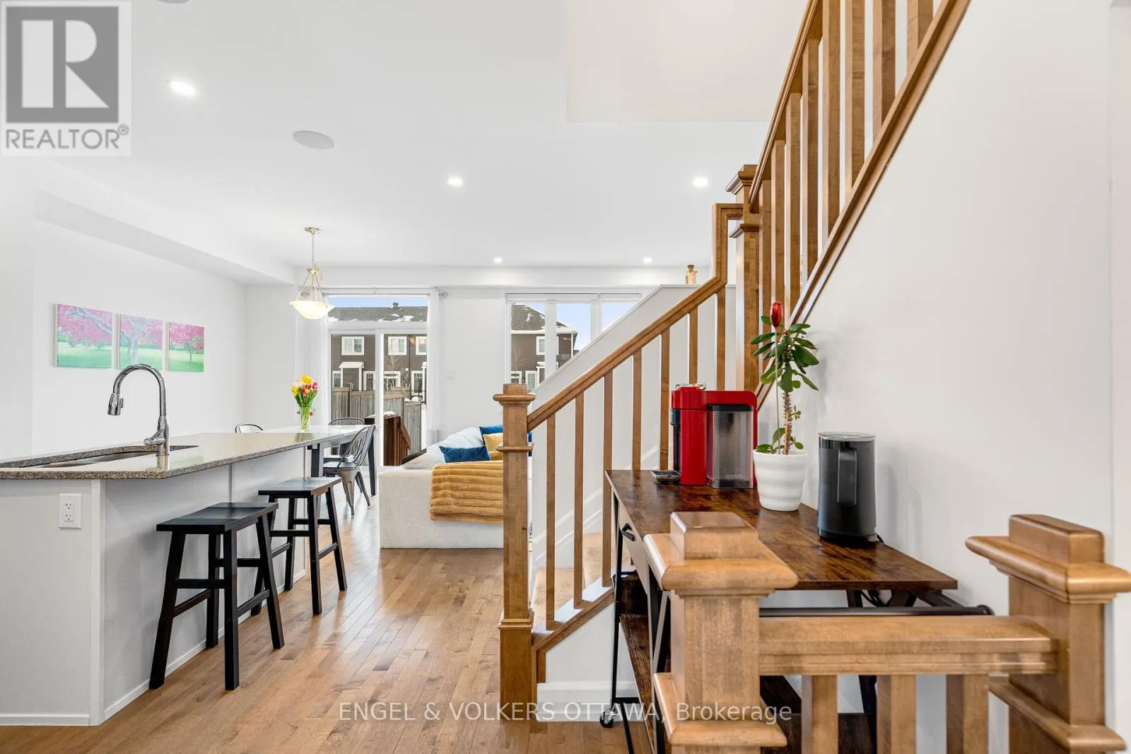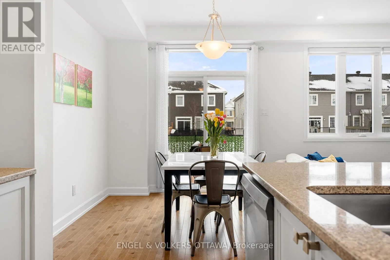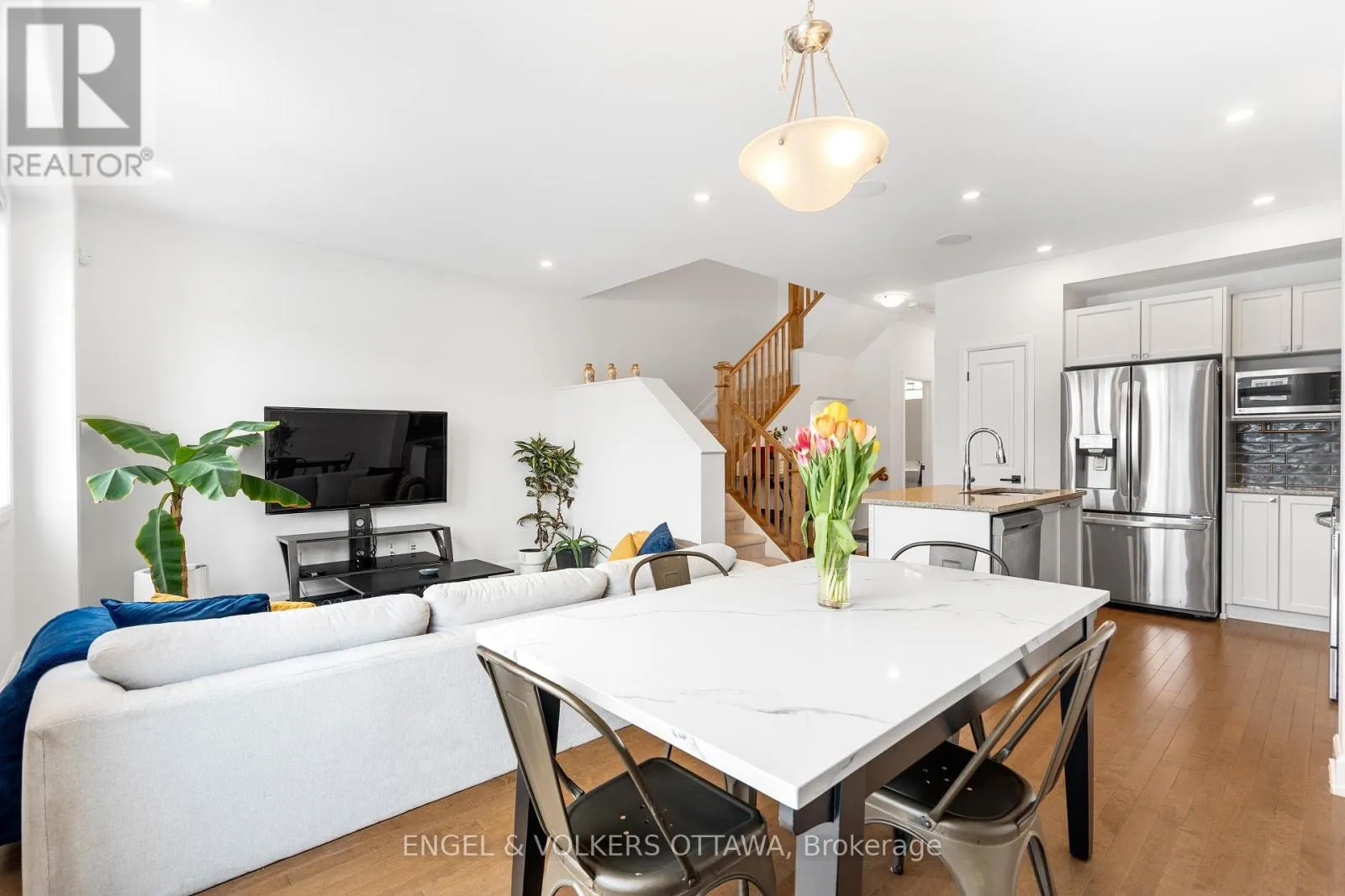Cross Streets: Mer Bleue & Promenade Decoeur. ** Directions: Mer Bleue or Tenth Line to Promenade Decoeur, Guppy Grv, West on Gardenpost. Modern comfort and thoughtful design define this Minto Laguna model offering about 1,684 sq ft including a finished lower level. This three bedroom, three bathroom townhome sits on a premium lot with no direct rear neighbours and features an attached garage and private fenced yard. The open concept main floor showcases nine foot ceilings, hardwood flooring, pot lights, large bright windows, and a built in speaker system, while the kitchen is finished with granite counters, stainless steel appliances, and a centre island with seating. Upstairs includes laundry, a full bath, and three generously sized bedrooms including a spacious primary retreat with walk in closet and ensuite. The finished lower level adds versatile space ideal for a gym, media room, family room, or office along with excellent storage. (id:27476)