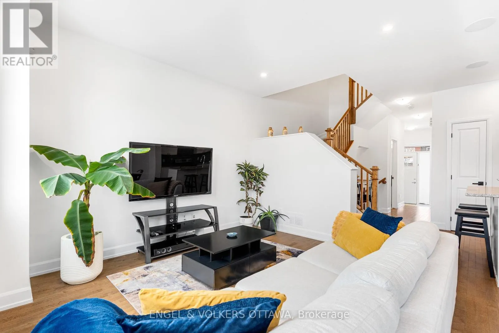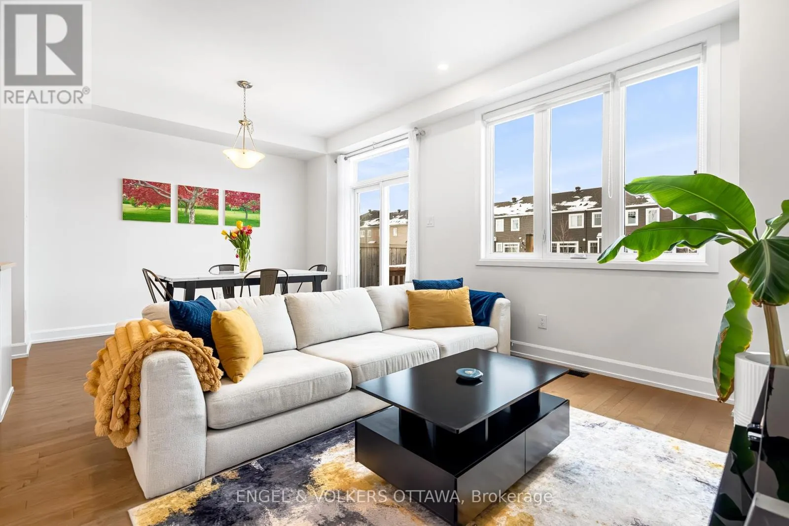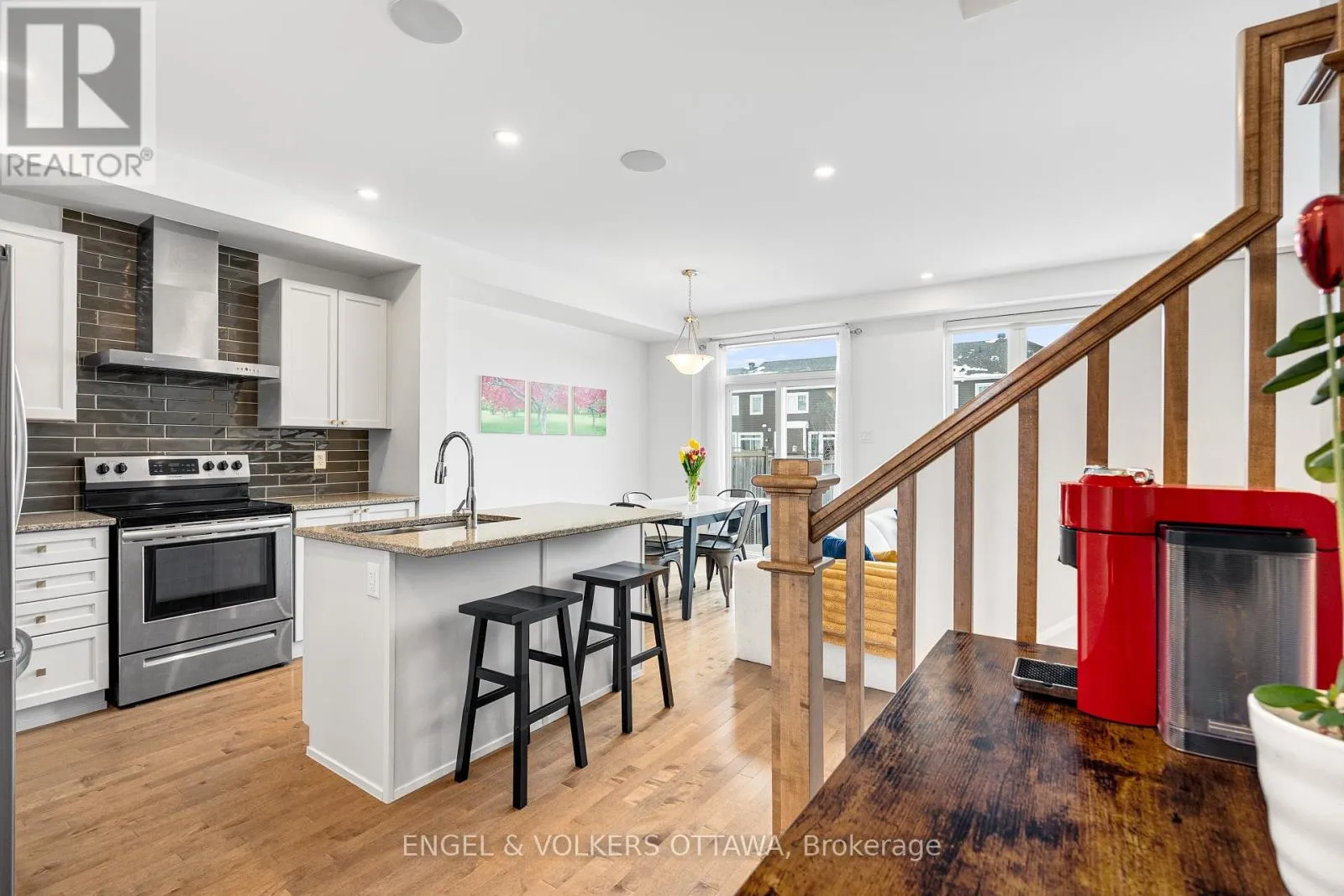 Cross Streets: Mer Bleue & Promenade Decoeur. ** Directions: Mer Bleue or Tenth Line to Promenade Decoeur, Guppy Grv, West on Gardenpost. Modern comfort and thoughtful design define this Minto Laguna model offering about 1,684 sq ft including a finished lower level. This three bedroom, three bathroom townhome sits on a premium lot with no direct rear neighbours and features an attached garage and private fenced yard. The open concept main floor showcases nine foot ceilings, hardwood flooring, pot lights, large bright windows, and a built in speaker system, while the kitchen is finished with granite counters, stainless steel appliances, and a centre island with seating. Upstairs includes laundry, a full bath, and three generously sized bedrooms including a spacious primary retreat with walk in closet and ensuite. The finished lower level adds versatile space ideal for a gym, media room, family room, or office along with excellent storage. (id:27476)