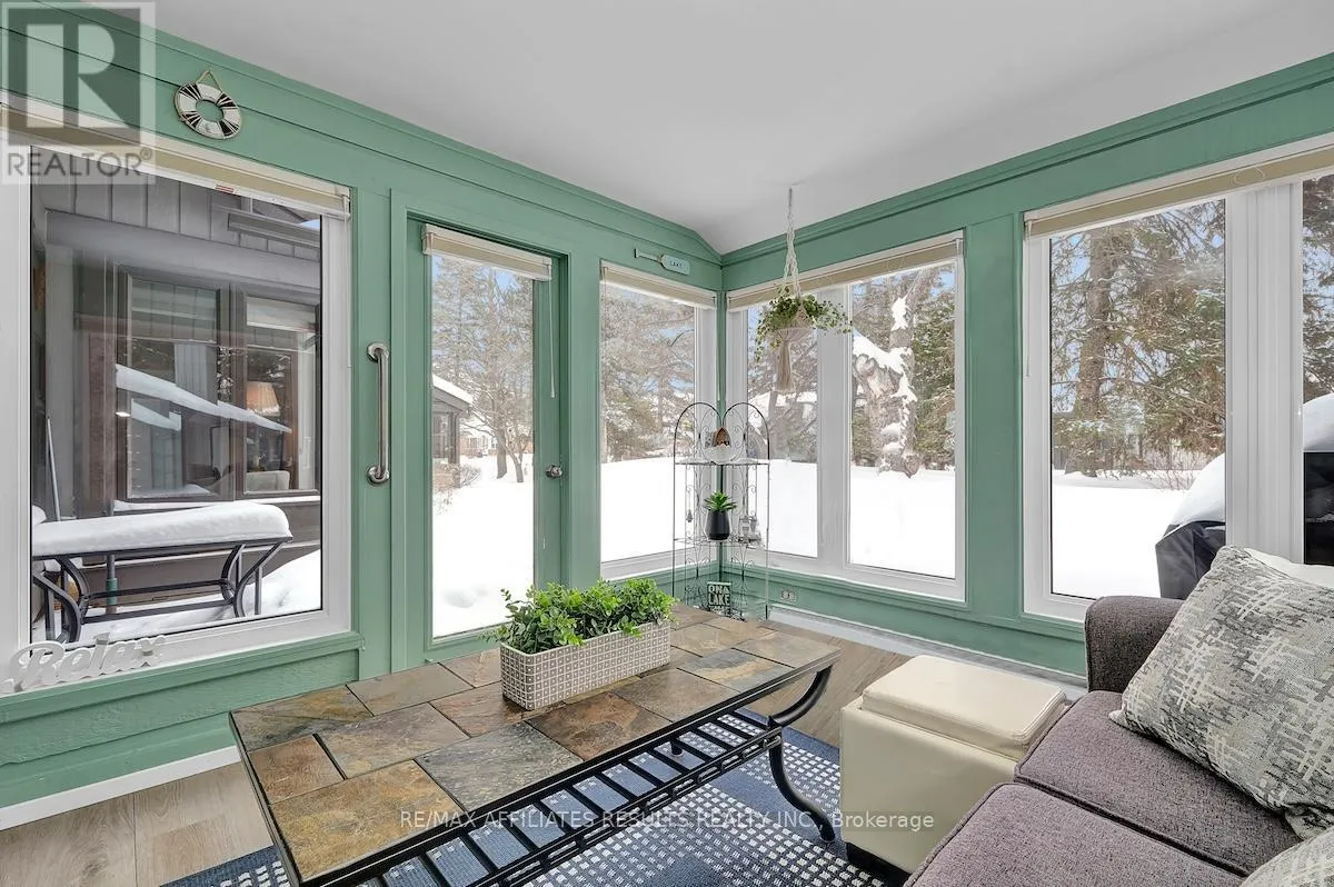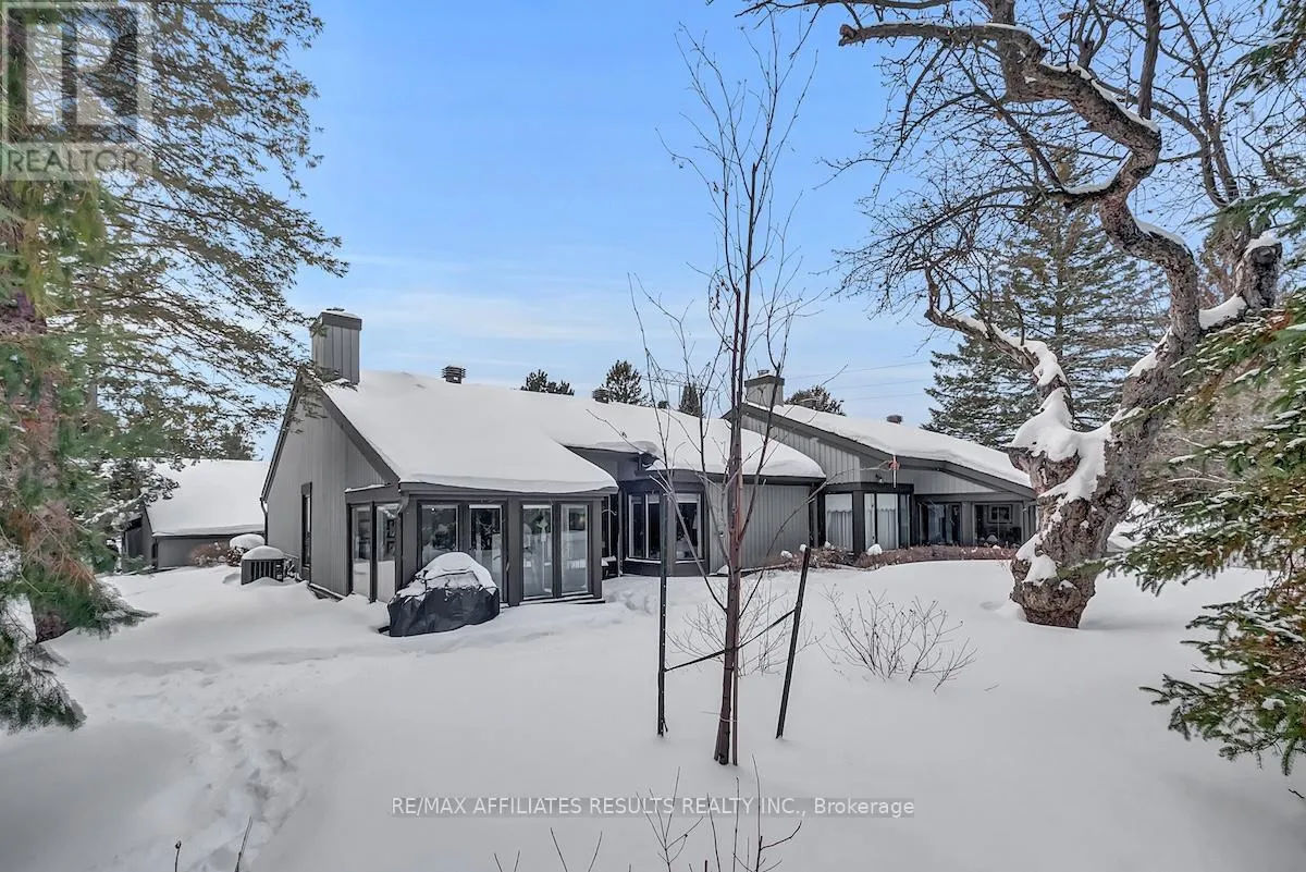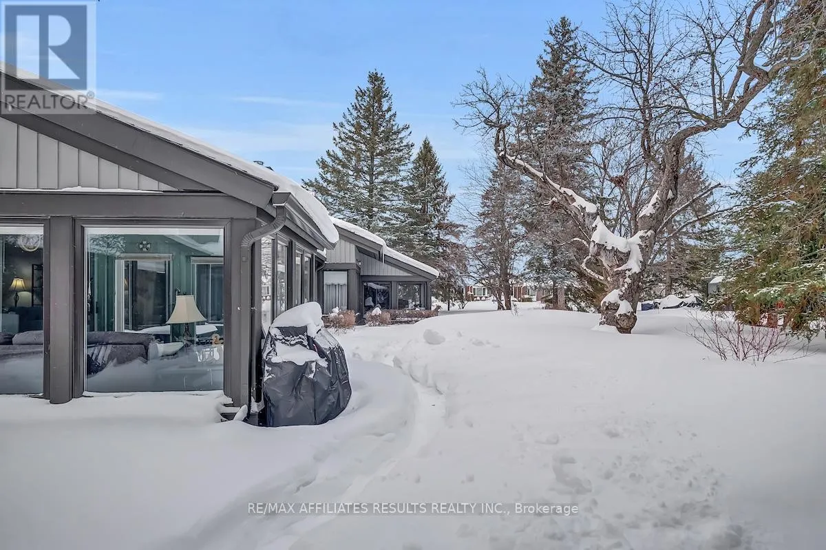 Cross Streets: Springbrook Dr & Arbor Ridge. ** Directions: Hazeldean Rd. to Amberwood to Springwood, past the golf course, turn left on Arbor Ridge. Parking is on the left as you arrive. 5 Arbor Ridge is behind the garages. Welcome to 5 Arbor Ridge, a beautifully renovated 2-bedroom bungalow in the exclusive Amberwood Village community. This rare end unit is nestled in a secluded, park-like setting with mature trees and lush landscaping, offering true privacy and tranquility. Enjoy breathtaking views from your all-season sunroom, surrounded by windows on three sides-perfect for relaxing year-round. Step out to your private, extended stone patio with a natural gas BBQ, ideal for entertaining or quiet evenings at home. Inside, you'll find gorgeous new 5" hickory hardwood flooring (Logs End), an elegant gas fireplace, and a modern kitchen with new stainless steel appliances and updated countertops. The thoughtful layout includes a walk-in storage room, a full laundry room, plus a crawl space for seasonal storage. Guests will appreciate the additional bedroom and full bath. Recent upgrades like freshly painted top to bottom, new blinds throughout, new eavestroughing, new windows in the living room and second bedroom, and a garage door opener add peace of mind. Very spacious garage offers plenty of extra space for extra tires etc. Live a carefree lifestyle in this quiet, friendly community. Optional membership at the Amberwood Village Community Centre unlocks year-round access to golf, pickleball, aquafit, winter trails, yoga, fitness, and vibrant social events. Don't miss your chance to call this exceptional home your own; schedule a visit to 5 Arbor Ridge today and experience Ottawa living at its best! (id:27476)