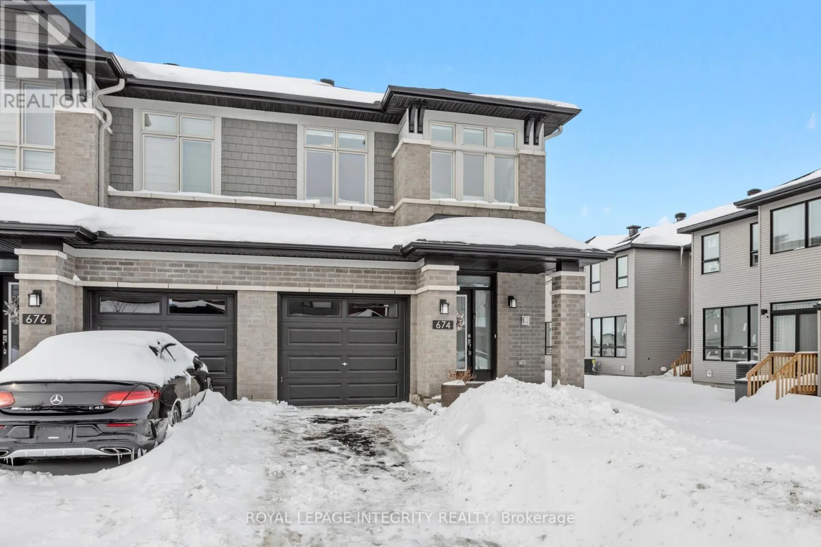 Cross Streets: honeydew st and borbridge ave. ** Directions: south on spratt rd, left on borbridge ave, right on honeydew st. ** OPEN HOUSE SATURDAY AND SUNDAY FEBRUARY 14 AND 15 2- 4PM ** Welcome to 674 Honeydew - a beautifully upgraded Richcraft Fairhaven model END UNIT townhouse on an oversized lot offering space, style, and flexibility for modern living. Built in 2025 and still protected by the Tarion warranty, this home delivers over 2,500 sq. ft. of thoughtfully designed living space. With 9-foot ceilings, elegant finishes, and an inviting layout perfect for everyday living and entertaining. The chef-inspired kitchen showcases upgraded quartz countertops, premium stainless steel appliances, and abundant cabinetry, flowing seamlessly into generous dining and living areas filled with natural light. 4 BEDS and 4 BATHS - with a HUGE primary bedroom and a spa-like ensuite with double sink vanity, soaker tub, and modern glass stand shower. The finished lower level includes a full bathroom, creating excellent multigenerational living potential, guest accommodations, or a private retreat. Garage attached with inside entry, and an oversized driveway to comfortably fit 3 cars! Situated in a prime location close to amenities, schools, parks, and commuter routes, this nearly new home combines contemporary design with exceptional functionality. (id:27476)
