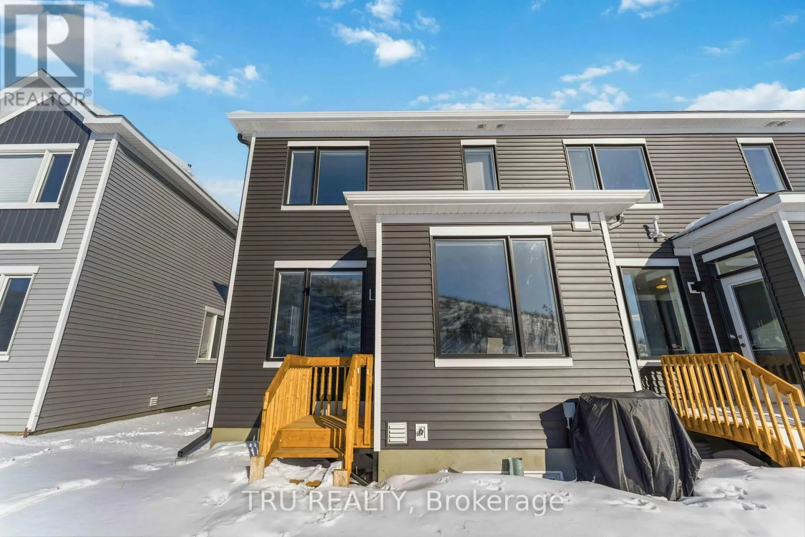 Cross Streets: Elevation Rd & Cambrian Rd. ** Directions: From Standard drive turn left onto Haiku Street, Turn left onto Expansion road. Stunning new 3+1 bedroom end-unit townhome located in Barrhaven with no rear neighbours, backing onto a natural hill for added privacy. This beautifully upgraded home offers 3.5 bathrooms and a bright, functional layout ideal for families and professionals alike. The main floor features 9-foot ceilings and smooth ceilings throughout, enhancing the open-concept design and allowing for abundant natural light, especially as an end unit. The modern kitchen is finished with upgraded granite stone countertops and is fully equipped with new stainless steel Whirlpool appliances, including a gas stove with air-fry oven, French-door refrigerator with bottom freezer and water and ice dispenser, and a powerful 400 CFM slim over-the-range microwave hood fan, making it a true chef inspired space. The upper level offers three generously sized bedrooms, including a spacious primary suite with an upgraded ensuite featuring a walk-in shower. The fully finished lower level provides a versatile +1 bedroom, ideal for a home office, guest room, or additional living space. A total of 3.5 bathrooms ensures comfort and convenience for the entire household.This home is truly move-in ready with custom zebra blinds installed throughout. The private backyard setting offers peaceful views of the hill behind with no rear neighbours, a rare and highly desirable feature in townhome living. Ideally situated close to top-rated schools, including Barrhaven Public School, Longfields-Davidson Heights Secondary School, and Mother Teresa High School. Enjoy easy access to Costco, Walmart, Loblaws, Cineplex, restaurants, cafes, parks, trails, public transit, the Barrhaven station, and Highway 416 for effortless commuting. (id:27476)