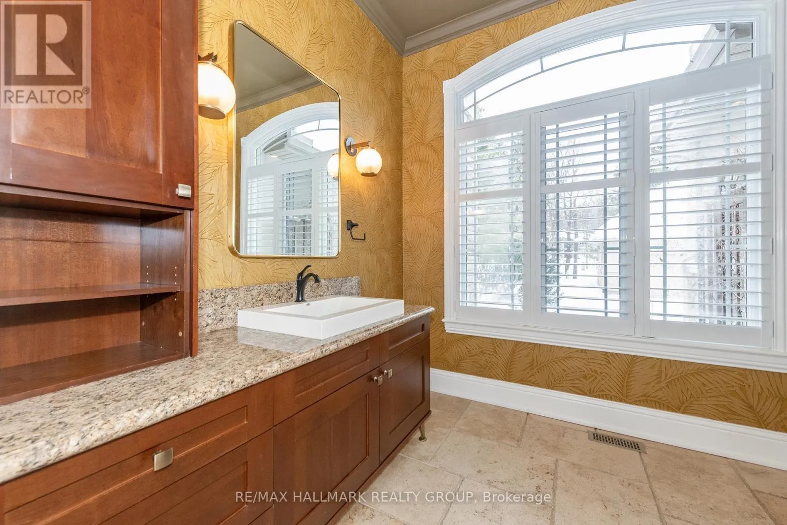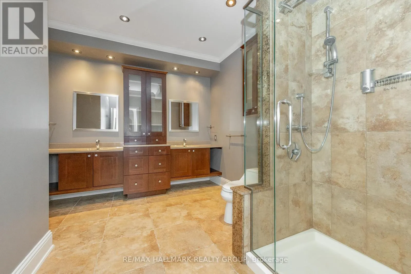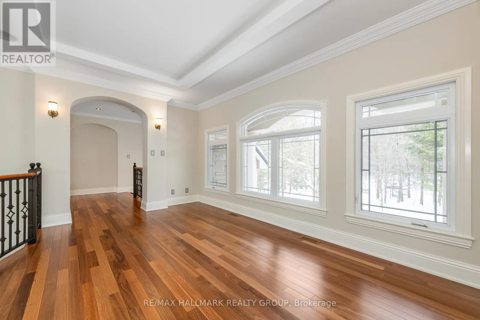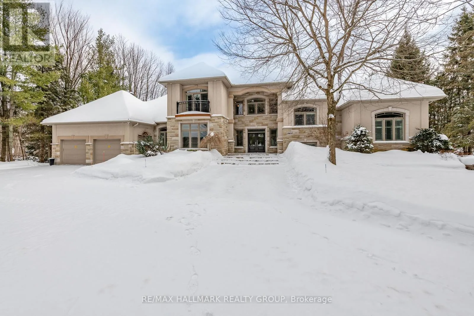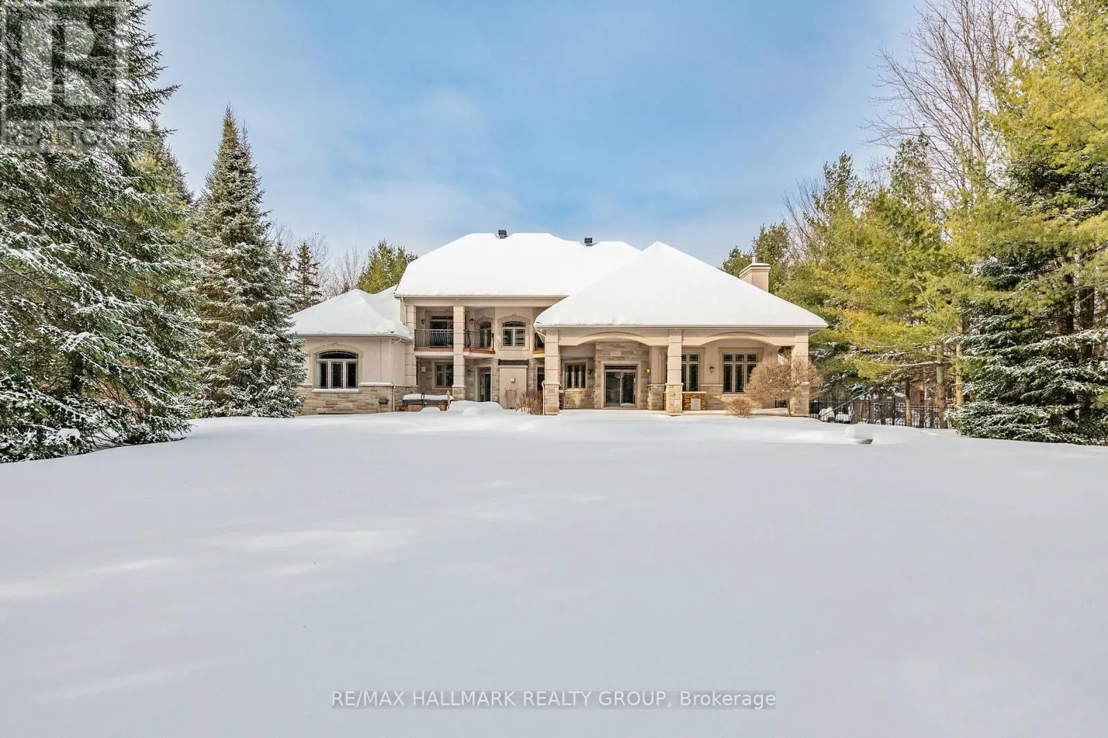 Cross Streets: Mitch Owens Road and Dozois Road. ** Directions: Mitch Owens Road, South on Dozois Road, East on Gough Road, North on Knights Drive, East on Queenscourt Crescent. Set on a beautifully treed 2.12 acre estate lot in prestigious Rideau Forest, this elegant Nowaki-built residence offers exceptional privacy, timeless design, and impressive curb appeal. A grand foyer welcomes you inside, where soaring two-storey windows flood the formal living room with natural light and highlight a cozy gas fireplace, creating an immediate sense of scale and warmth. The thoughtfully designed main level blends everyday comfort with upscale finishes. A private primary suite is positioned on one side of the home, featuring a generous walk-in closet and a luxurious 5pc ensuite with double sinks, a soaker tub, and an open walk-in shower with rain head. At the heart of the home, the chef's kitchen showcases rich cabinetry, stone countertops, high-end built-in appliances, and a large centre island, seamlessly connecting to the family room with wood-burning fireplace and tranquil views of the backyard retreat. Upstairs, the secondary bedrooms offer exceptional comfort and versatility. Two feature expansive balconies overlooking the private backyard, while another enjoys its own front-facing balcony. Two bedrooms include walk-in closets, and one benefits from a private 4-piece ensuite, providing ideal accommodations for family or guests. The fully finished lower level is designed for entertaining, complete with a bar, home theatre area, billiards room, sauna, 2pc bath, and direct access to the garage. Outside, enjoy resort-style living with a luxurious in-ground saltwater pool surrounded by mature trees for ultimate privacy. In addition to the attached garage, a separate detached garage provides extra parking, storage, or workshop potential, with an expansive driveway accommodating numerous vehicles. Located in one of the region's most sought-after estate communities, this remarkable property offers a rare combination of space, privacy, and refined living just minutes from city amenities. (id:27476)