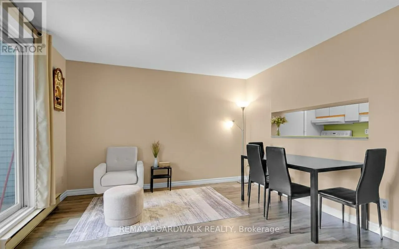 Cross Streets: Merivale and Viewmount. ** Directions: Merivale to Viewmount. Beautifully maintained 1-bedroom condo on the top floor of the very well managed Viewmount Woods community. This bright and inviting unit features a modern galley-style kitchen and convenient in-unit laundry. Enjoy a spacious open-concept living and dining area with laminate flooring throughout, leading to a private balcony through a sliding patio door, perfect for morning coffee or evening relaxation. The generously sized primary bedroom includes a walk-in closet, and the full bathroom has been updated with a brand-new vanity. Rent includes 1 outdoor parking space and water/sewer. Ideally located near Algonquin College, Carleton University, and major public transit routes. You'll also find schools, grocery stores, pharmacies, restaurants, Best Buy, and Costco all just minutes away. (id:27476)