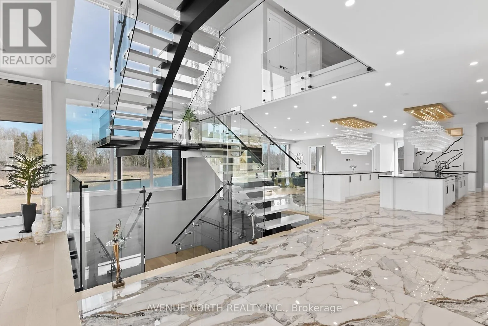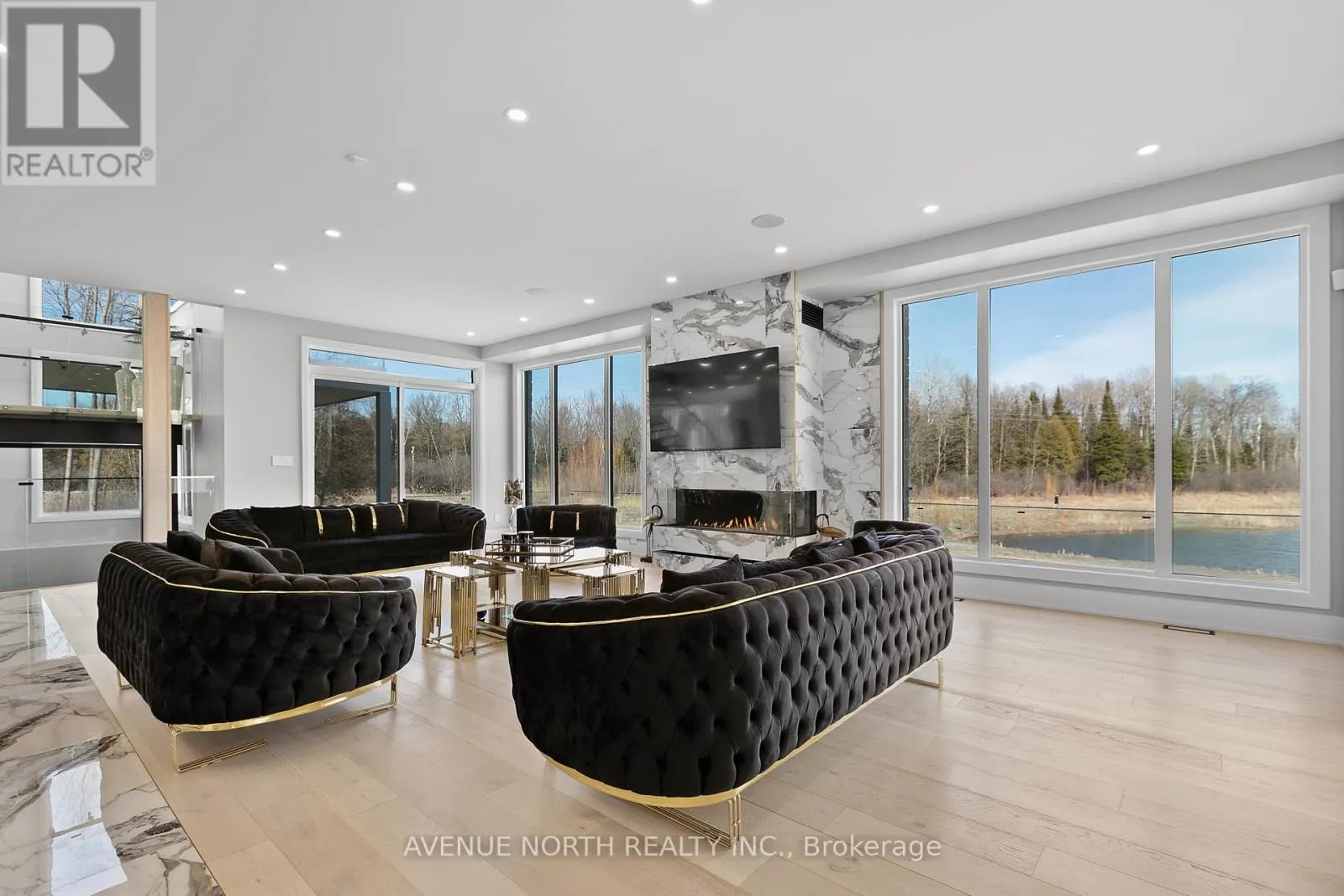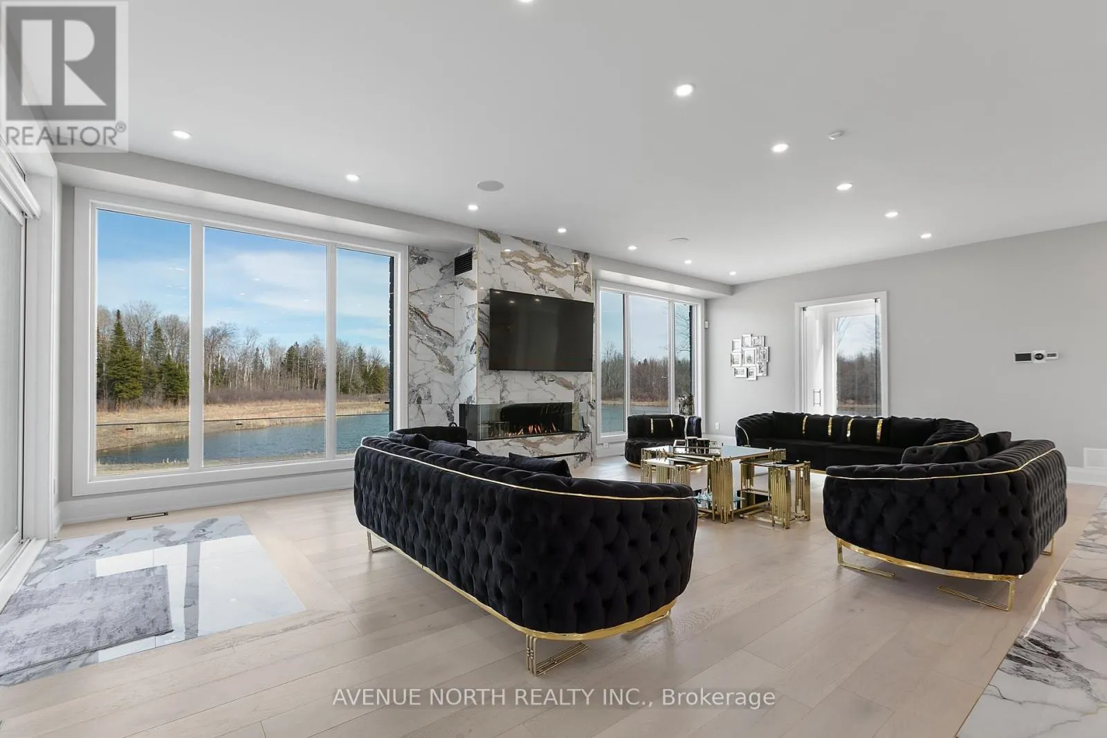 Cross Streets: Old Prescott Road to Shoreway Drive. ** Directions: Old Prospect Road to Donwell Drive, Right onto Shoreway Drive. WATERFRONT LUXURY MASTER PIECE ON SUNSET LAKE! Situated on an extraordinary 38,947-square-foot lot with a private sandy beach, this 2023-built waterfront estate offers over 7,400 square feet of refined living space and breathtaking sunset views. Designed for both multi-generational living and grand entertaining, the home can be offered fully furnished at an additional cost, providing a seamless turnkey opportunity. A dramatic 19-foot foyer welcomes you into an elegant main level featuring 10-foot ceilings and an open-concept layout. The chef's kitchen is a true showpiece with two impressive 18-foot islands, premium Jenn-Air appliances, a 6-burner gas range, double ovens, a 36" fridge, separate 30" freezer, coffee bar, private butler's pantry, and walk-in pantry. The kitchen flows seamlessly into the lake-facing great room with fireplace and stunning water views. A ventilated sunroom and glass-enclosed study provide exceptional spaces for relaxation and working from home.The main floor also includes a laundry room, mudroom, full bath with pet wash, and access to a 5-car garage with 15-foot ceilings-ideal for car lifts.Upstairs, a spacious landing opens to a family room. The primary suite features a fireplace, private balcony, and spa-inspired ensuite with a soaking tub and dual sinks. Five additional bedrooms, three full baths, a second laundry room, and an expansive terrace perfect for entertaining complete the level.Outdoor living is exceptional, with multiple balconies, a covered hot tub area with outdoor fireplace, and direct waterfront access from the private sandy beach. The semi-finished basement is pre-wired with plumbing rough-ins, offering endless potential for a gym, theatre, or custom retreat. A rare opportunity to own a true lakeside masterpiece combining luxury, scale, and spectacular natural beauty for creating family memories. ** This is a linked property.** (id:27476)