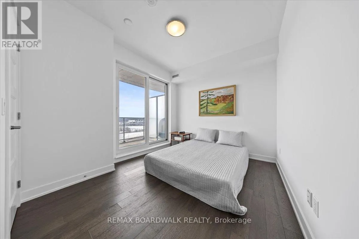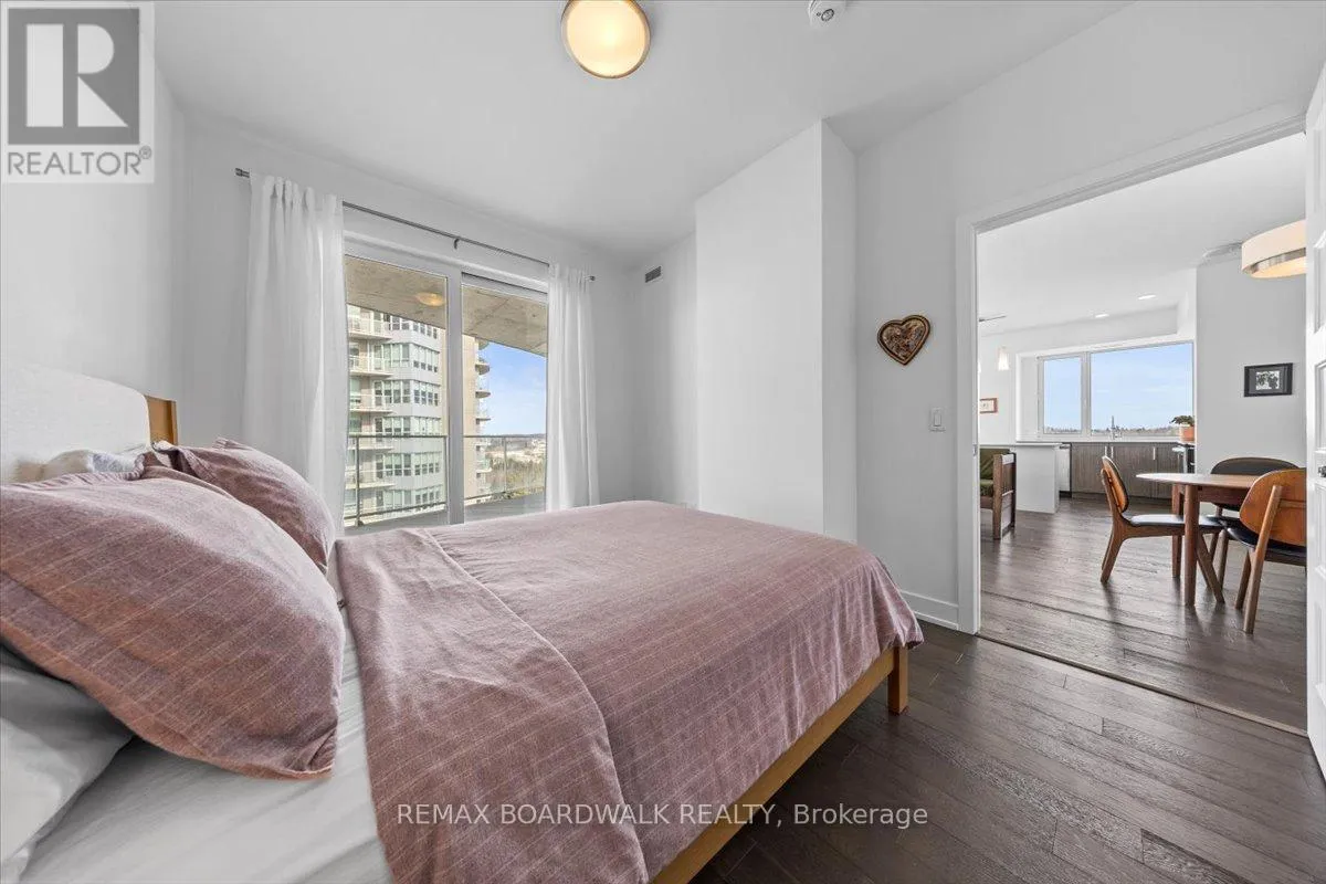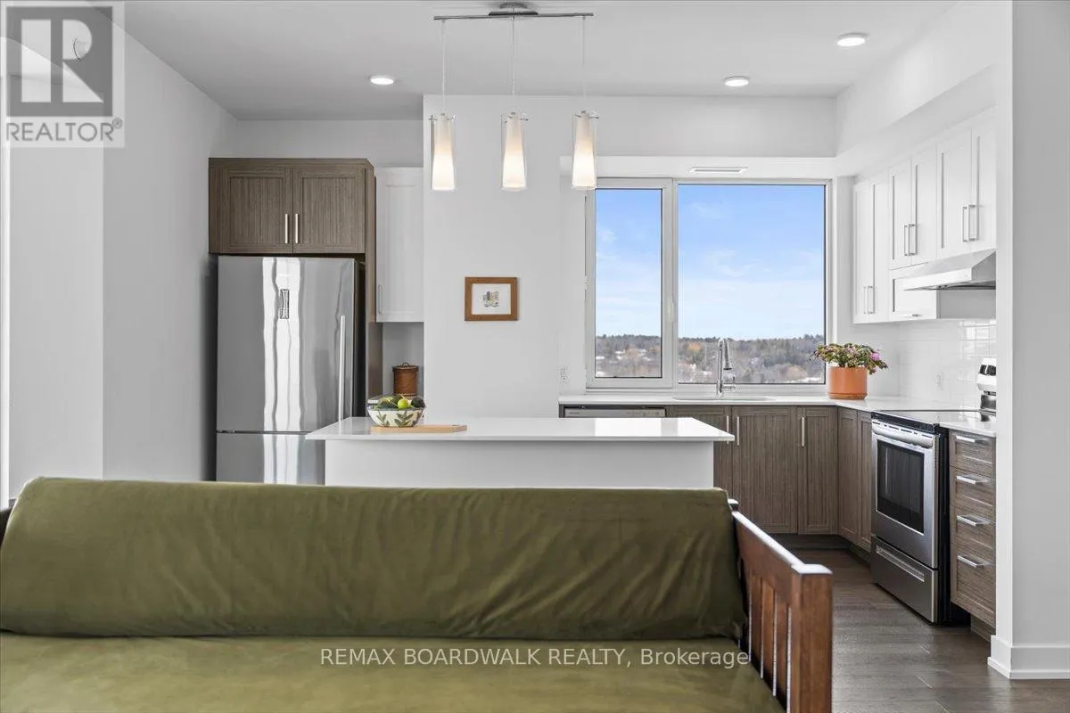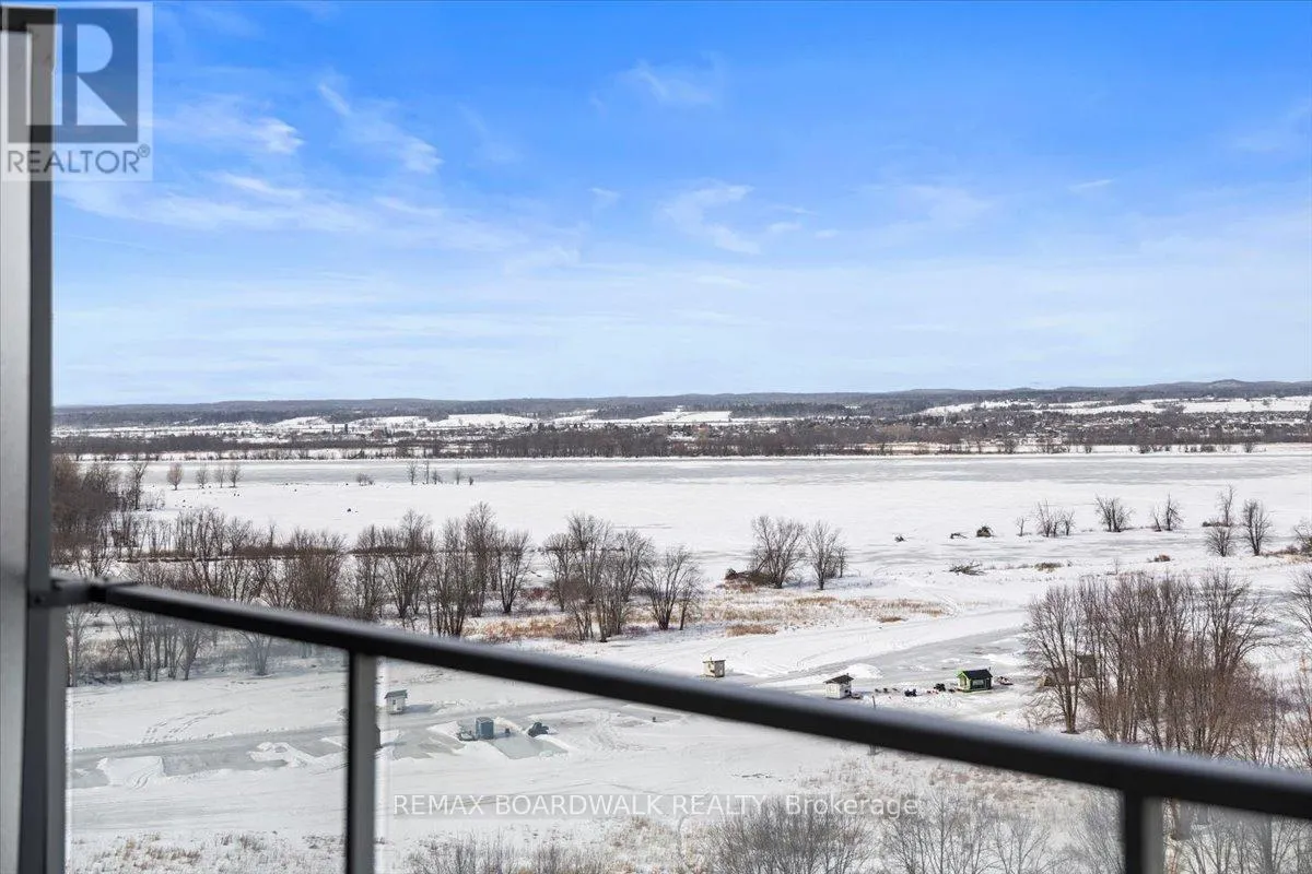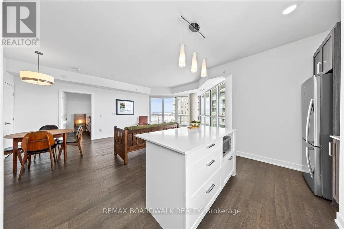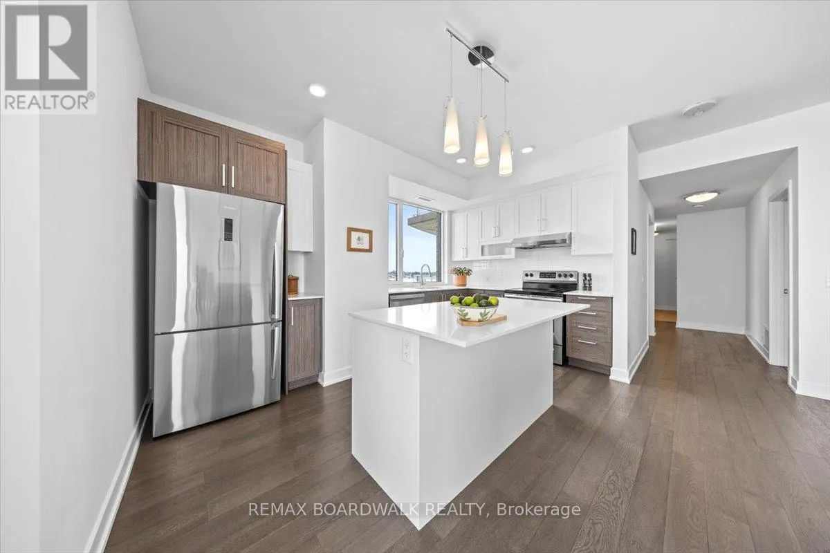 Cross Streets: Petrie Island. ** Directions: Trim Road to Inlet Private. Architecturally composed corner residence w/dual covered balconies, southern exposure, & elevated Ottawa River views. This two-bedroom suite is thoughtfully designed for both form & function, offering refined materials & intentional spatial flow, 37.5" wide entry door introduces a welcoming foyer w/closet storage, setting a tone of accessibility & understated sophistication. Wide-plank engineered hardwood & oversized ceramic tile run throughout, complemented by flat ceilings, boxed baseboards, recessed pot lighting, & modern five-panel interior doors, centre-island kitchen anchors the living space w/quartz surfaces, breakfast bar seating, pot drawers, & two-tone shaker cabinetry w/integrated garage feature. A recessed double sink positioned beneath an oversized window captures natural light & river vistas. The living room's corner glazing frames panoramic water views & morning sun, while the dining area integrates a walk-in pantry for seamless entertaining, primary suite is designed as a private retreat w/its own patio door, walk-through double-sided closet, & a five-piece ensuite featuring twin vanities & a glass-enclosed shower w/rain head & European wand. The second bedroom offers a private balcony, walk-in closet, & pocket-door access to a three-piece cheater ensuite w/double-wide shower, allowing flexibility for guests or workspace, full-size laundry, a separate storage locker, & the rare inclusion of two underground parking spaces enhance livability & long-term value. Residents enjoy curated amenities including a fitness studio w/sunset views, an elegant lounge, rooftop pool, hot tub, & outdoor terrace w/BBQ area. All positioned to embrace the natural landscape of the Ottawa River. A residence defined by light, proportion, & elevated riverside living. 24 hour irrevocable on all offers. (id:27476)