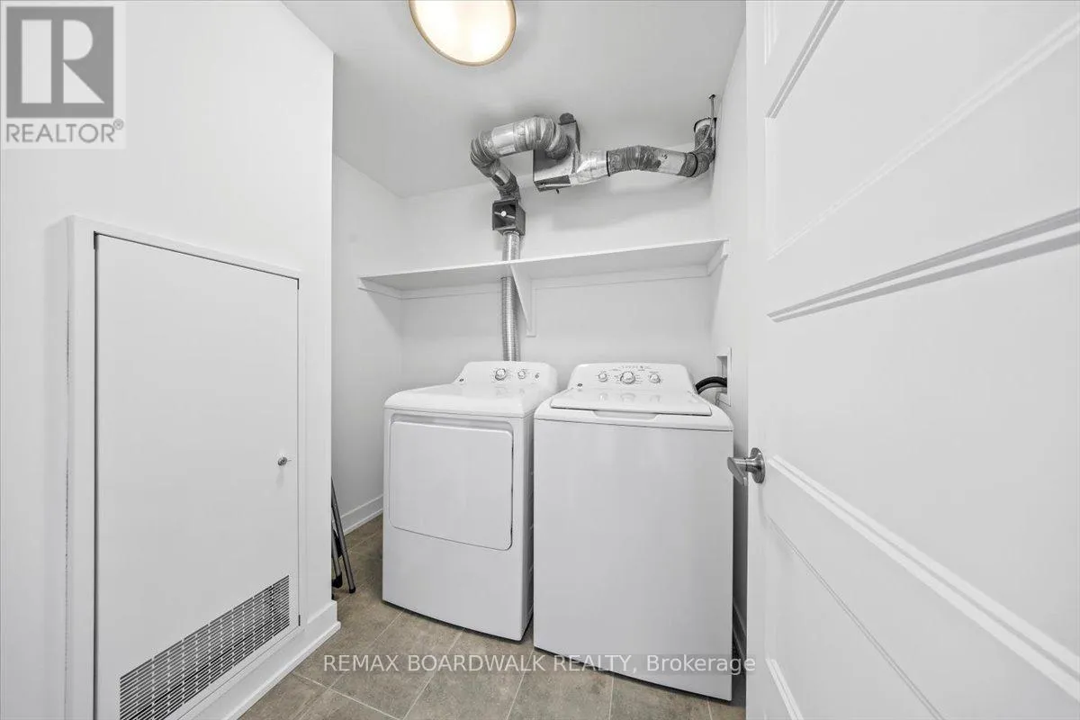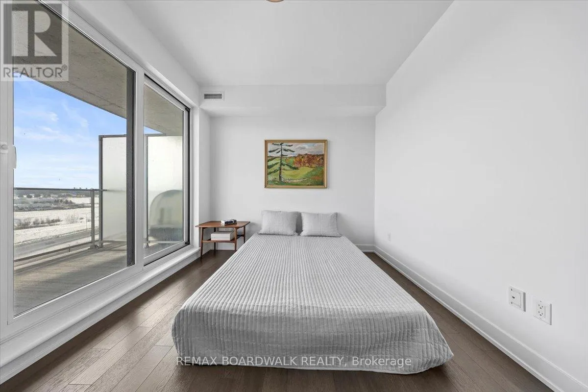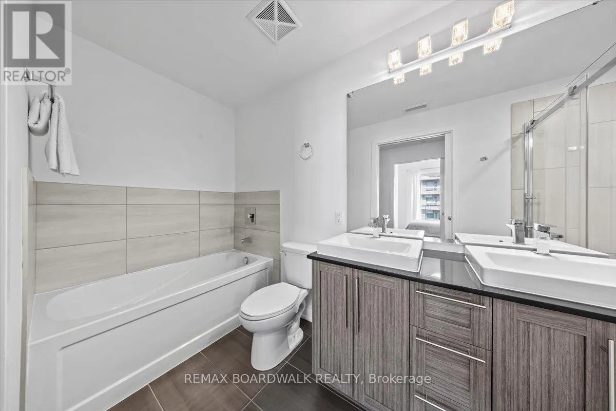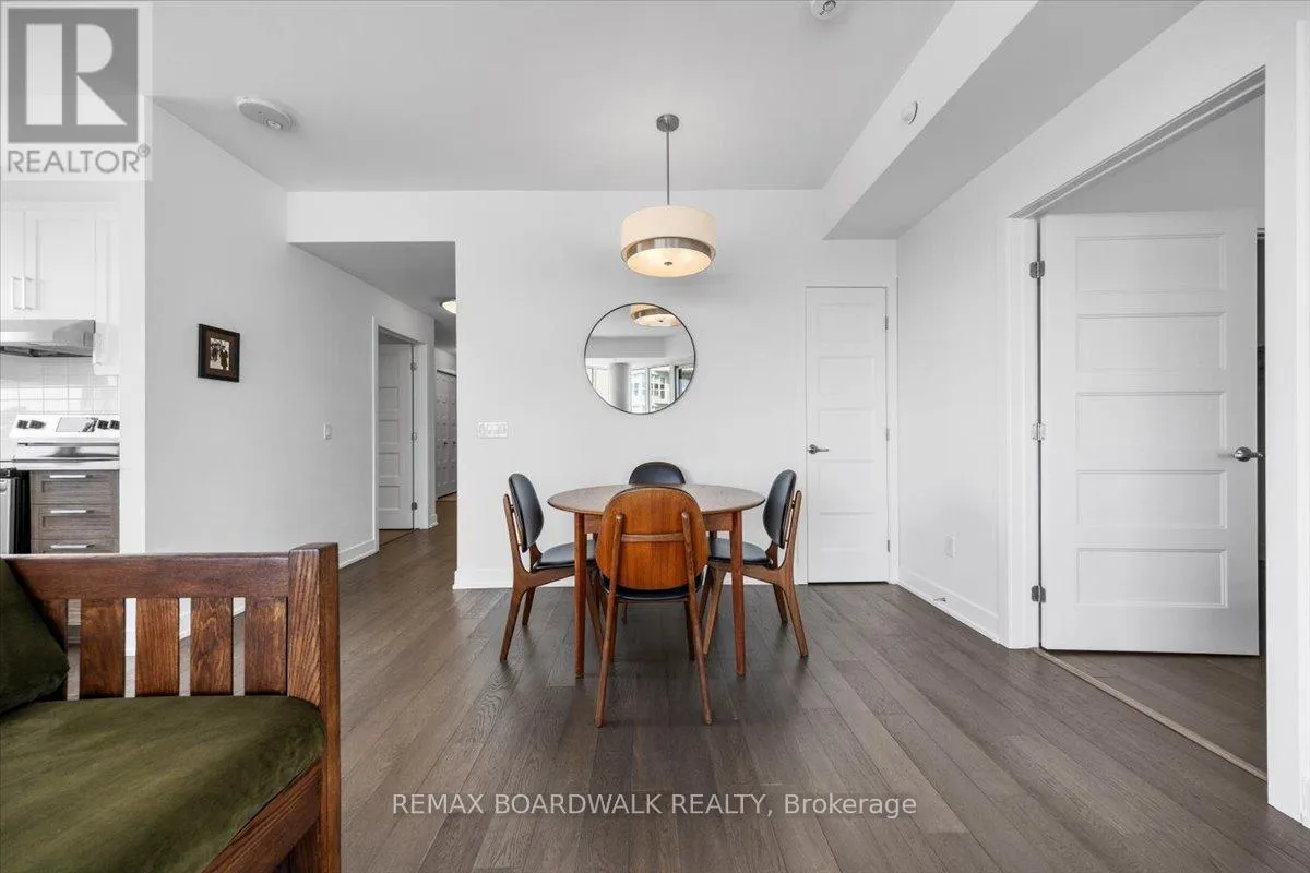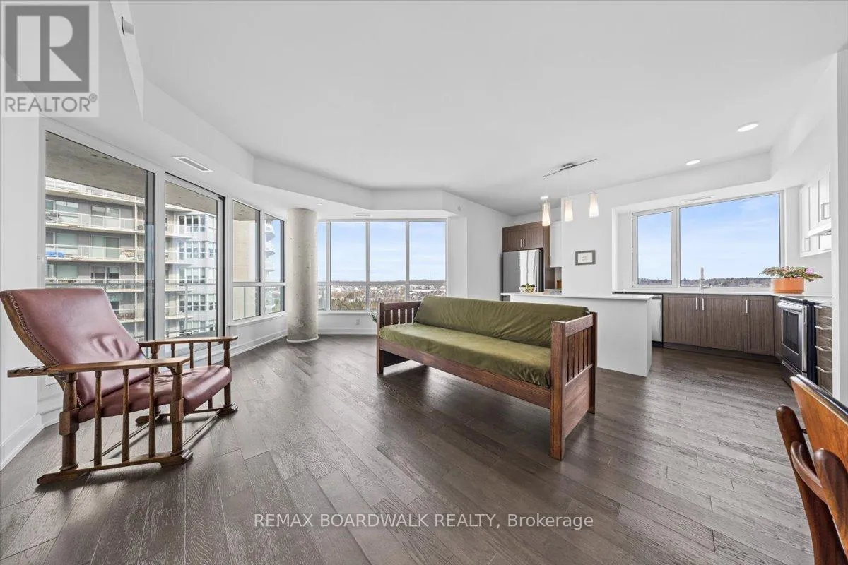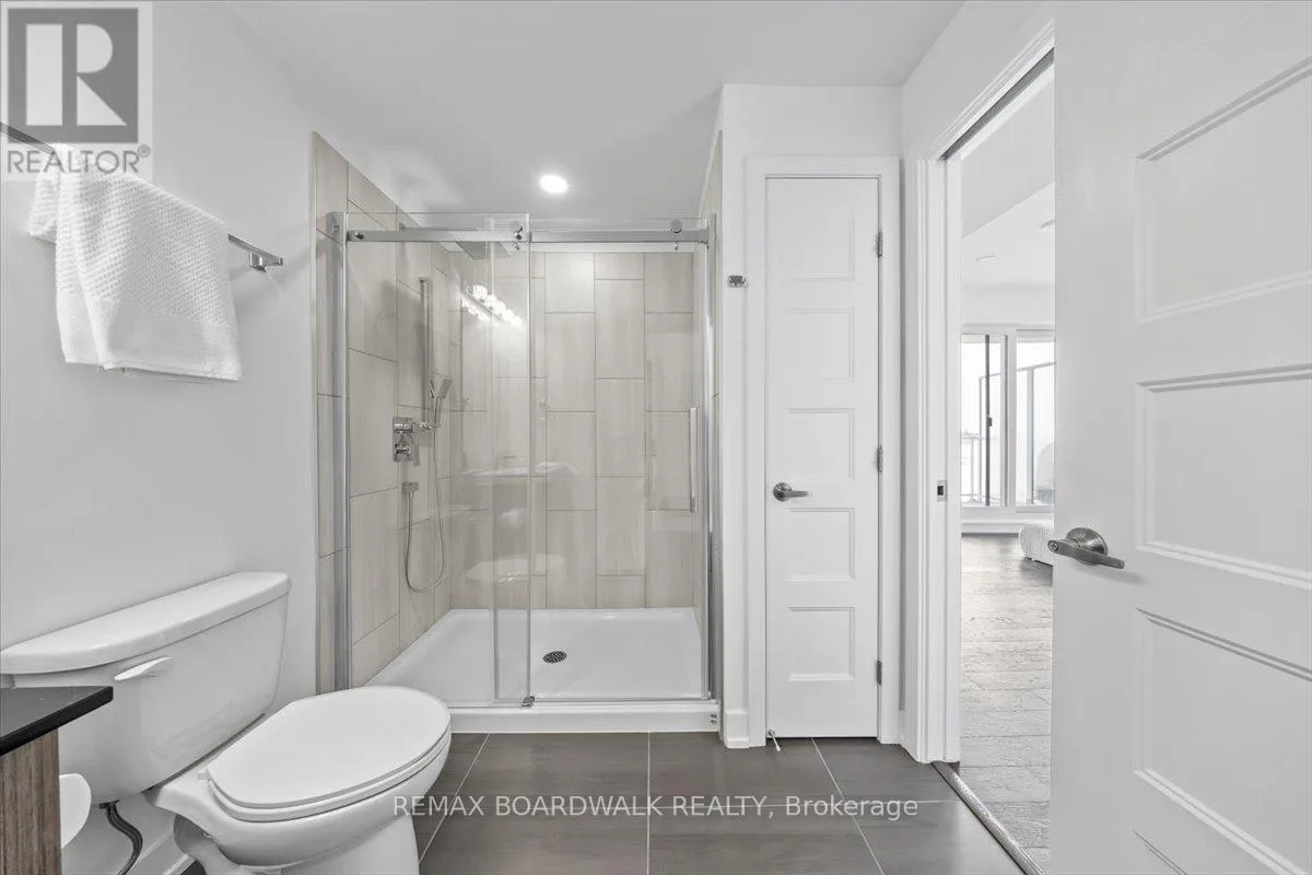 Cross Streets: Petrie Island. ** Directions: Trim Road to Inlet Private. Architecturally composed corner residence w/dual covered balconies, southern exposure, & elevated Ottawa River views. This two-bedroom suite is thoughtfully designed for both form & function, offering refined materials & intentional spatial flow, 37.5" wide entry door introduces a welcoming foyer w/closet storage, setting a tone of accessibility & understated sophistication. Wide-plank engineered hardwood & oversized ceramic tile run throughout, complemented by flat ceilings, boxed baseboards, recessed pot lighting, & modern five-panel interior doors, centre-island kitchen anchors the living space w/quartz surfaces, breakfast bar seating, pot drawers, & two-tone shaker cabinetry w/integrated garage feature. A recessed double sink positioned beneath an oversized window captures natural light & river vistas. The living room's corner glazing frames panoramic water views & morning sun, while the dining area integrates a walk-in pantry for seamless entertaining, primary suite is designed as a private retreat w/its own patio door, walk-through double-sided closet, & a five-piece ensuite featuring twin vanities & a glass-enclosed shower w/rain head & European wand. The second bedroom offers a private balcony, walk-in closet, & pocket-door access to a three-piece cheater ensuite w/double-wide shower, allowing flexibility for guests or workspace, full-size laundry, a separate storage locker, & the rare inclusion of two underground parking spaces enhance livability & long-term value. Residents enjoy curated amenities including a fitness studio w/sunset views, an elegant lounge, rooftop pool, hot tub, & outdoor terrace w/BBQ area. All positioned to embrace the natural landscape of the Ottawa River. A residence defined by light, proportion, & elevated riverside living. 24 hour irrevocable on all offers. (id:27476)