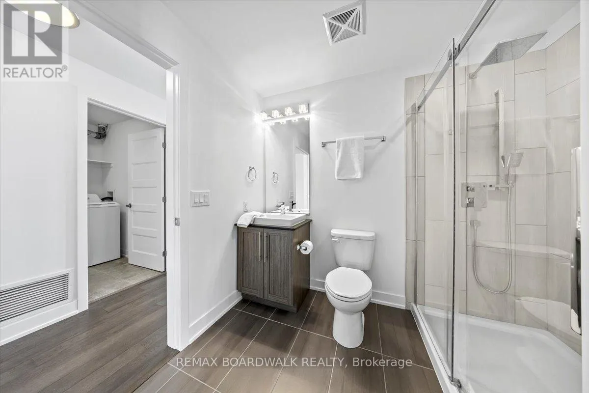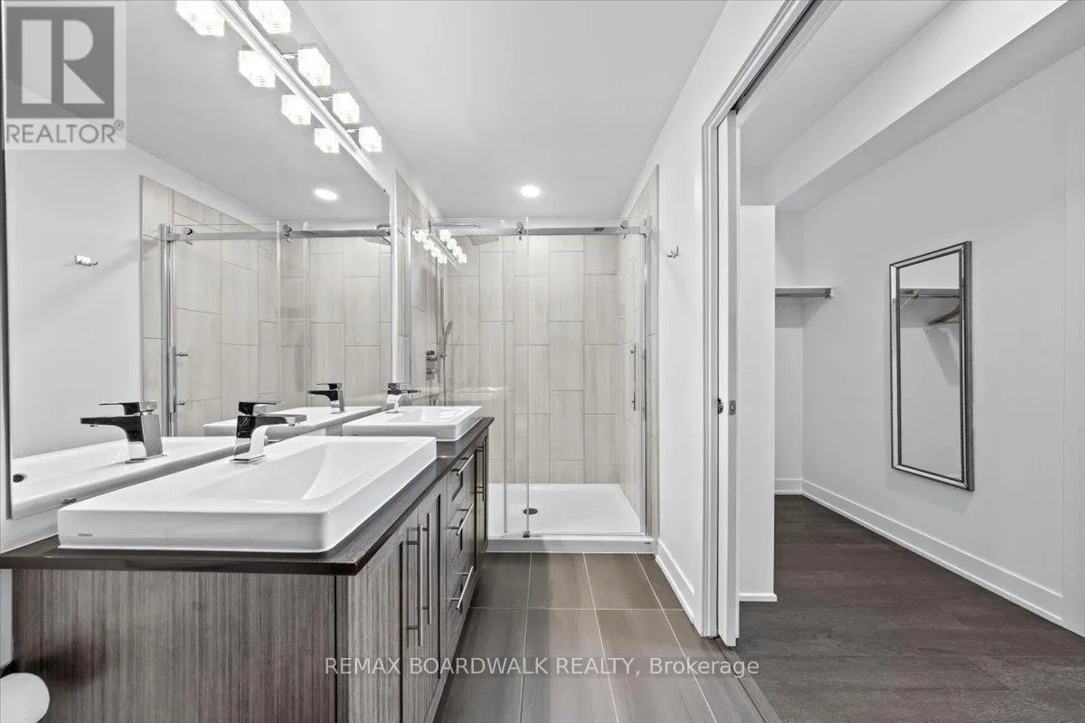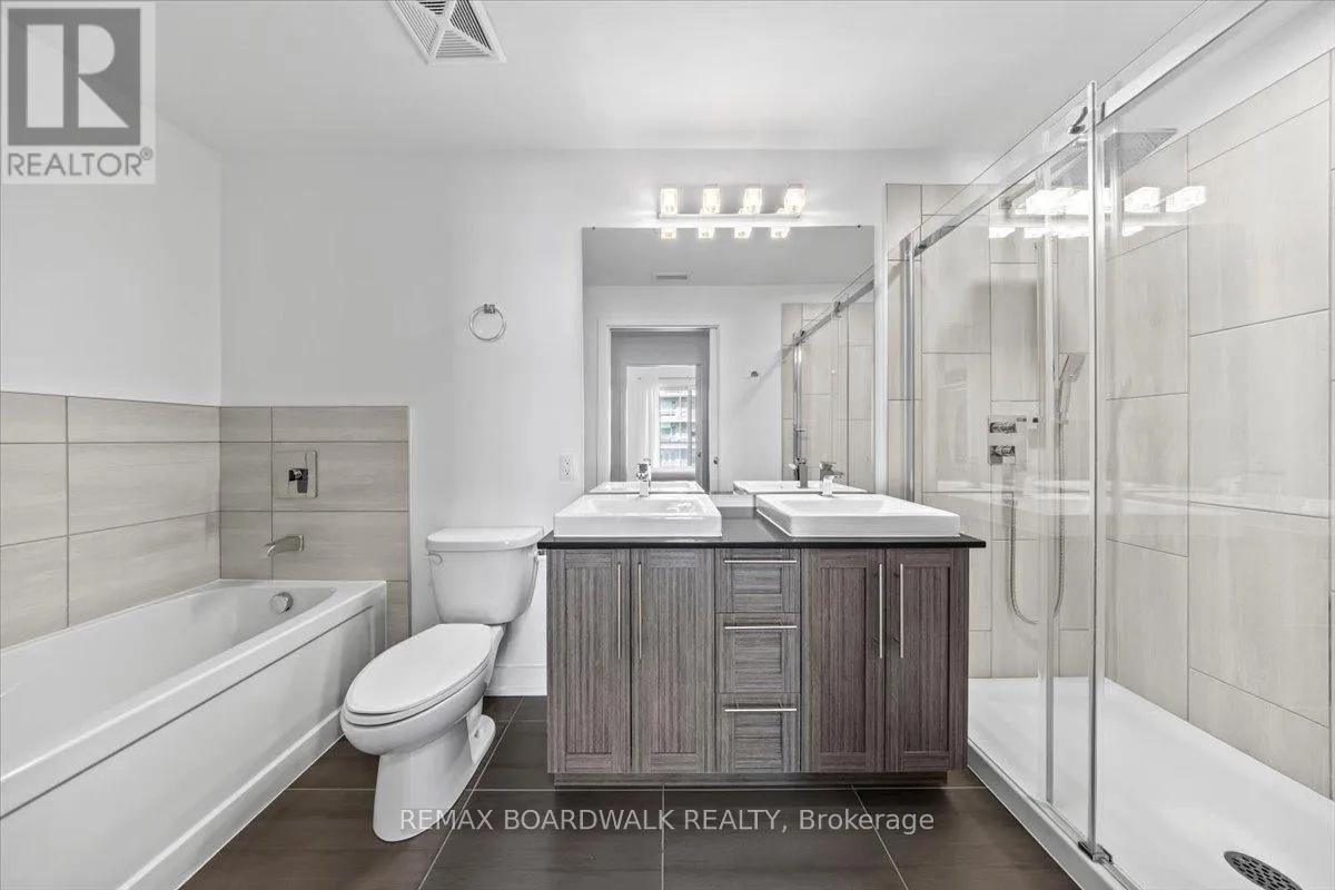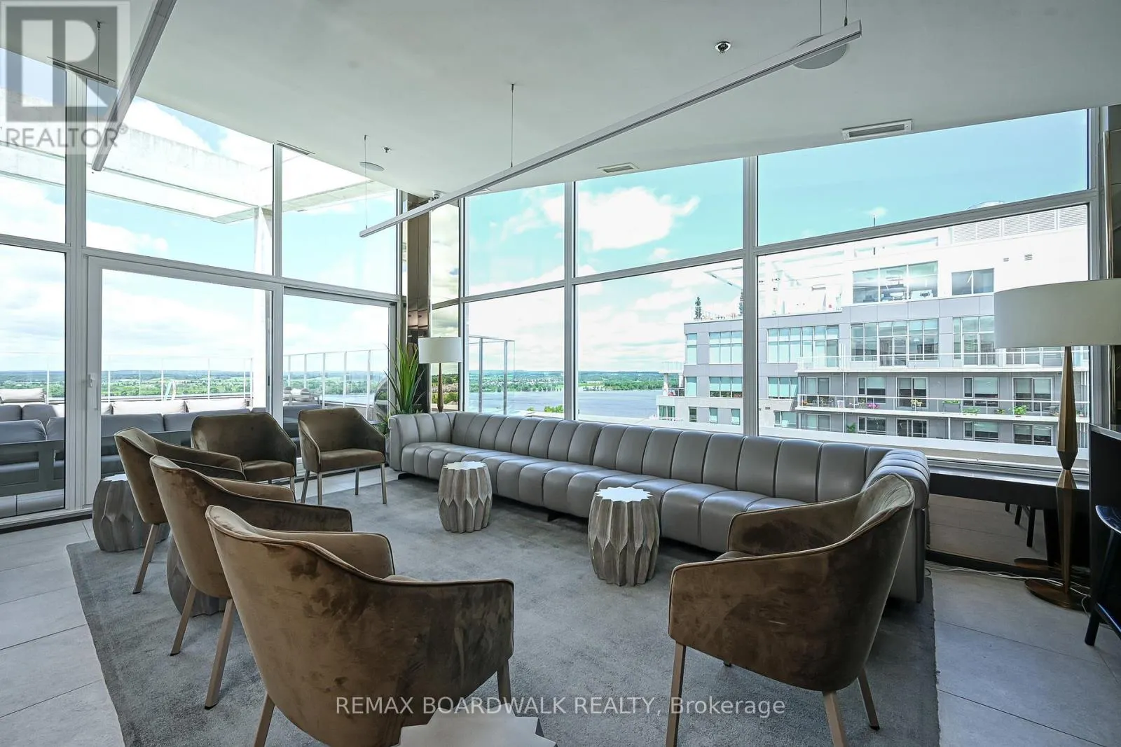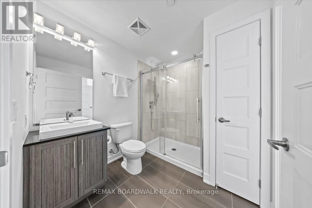 Cross Streets: Petrie Island. ** Directions: Trim Road to Inlet Private. Architecturally composed corner residence w/dual covered balconies, southern exposure, & elevated Ottawa River views. This two-bedroom suite is thoughtfully designed for both form & function, offering refined materials & intentional spatial flow, 37.5" wide entry door introduces a welcoming foyer w/closet storage, setting a tone of accessibility & understated sophistication. Wide-plank engineered hardwood & oversized ceramic tile run throughout, complemented by flat ceilings, boxed baseboards, recessed pot lighting, & modern five-panel interior doors, centre-island kitchen anchors the living space w/quartz surfaces, breakfast bar seating, pot drawers, & two-tone shaker cabinetry w/integrated garage feature. A recessed double sink positioned beneath an oversized window captures natural light & river vistas. The living room's corner glazing frames panoramic water views & morning sun, while the dining area integrates a walk-in pantry for seamless entertaining, primary suite is designed as a private retreat w/its own patio door, walk-through double-sided closet, & a five-piece ensuite featuring twin vanities & a glass-enclosed shower w/rain head & European wand. The second bedroom offers a private balcony, walk-in closet, & pocket-door access to a three-piece cheater ensuite w/double-wide shower, allowing flexibility for guests or workspace, full-size laundry, a separate storage locker, & the rare inclusion of two underground parking spaces enhance livability & long-term value. Residents enjoy curated amenities including a fitness studio w/sunset views, an elegant lounge, rooftop pool, hot tub, & outdoor terrace w/BBQ area. All positioned to embrace the natural landscape of the Ottawa River. A residence defined by light, proportion, & elevated riverside living. 24 hour irrevocable on all offers. (id:27476)