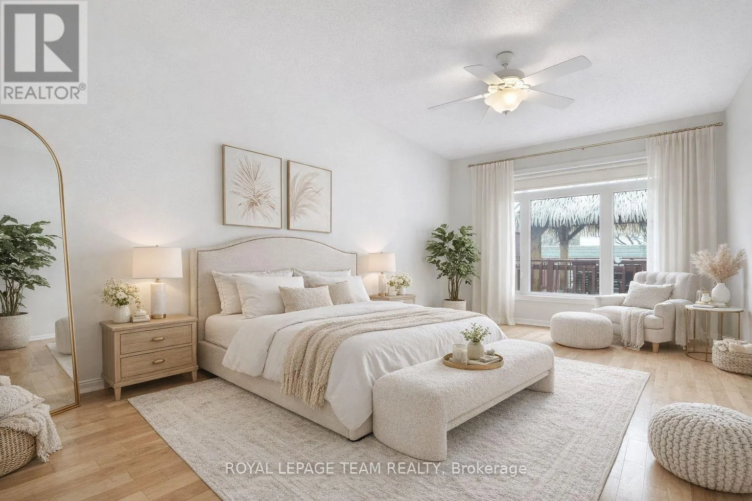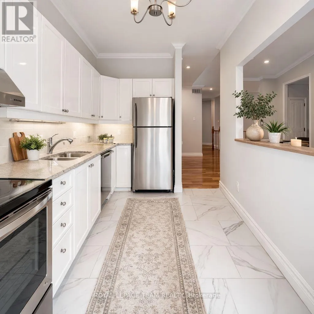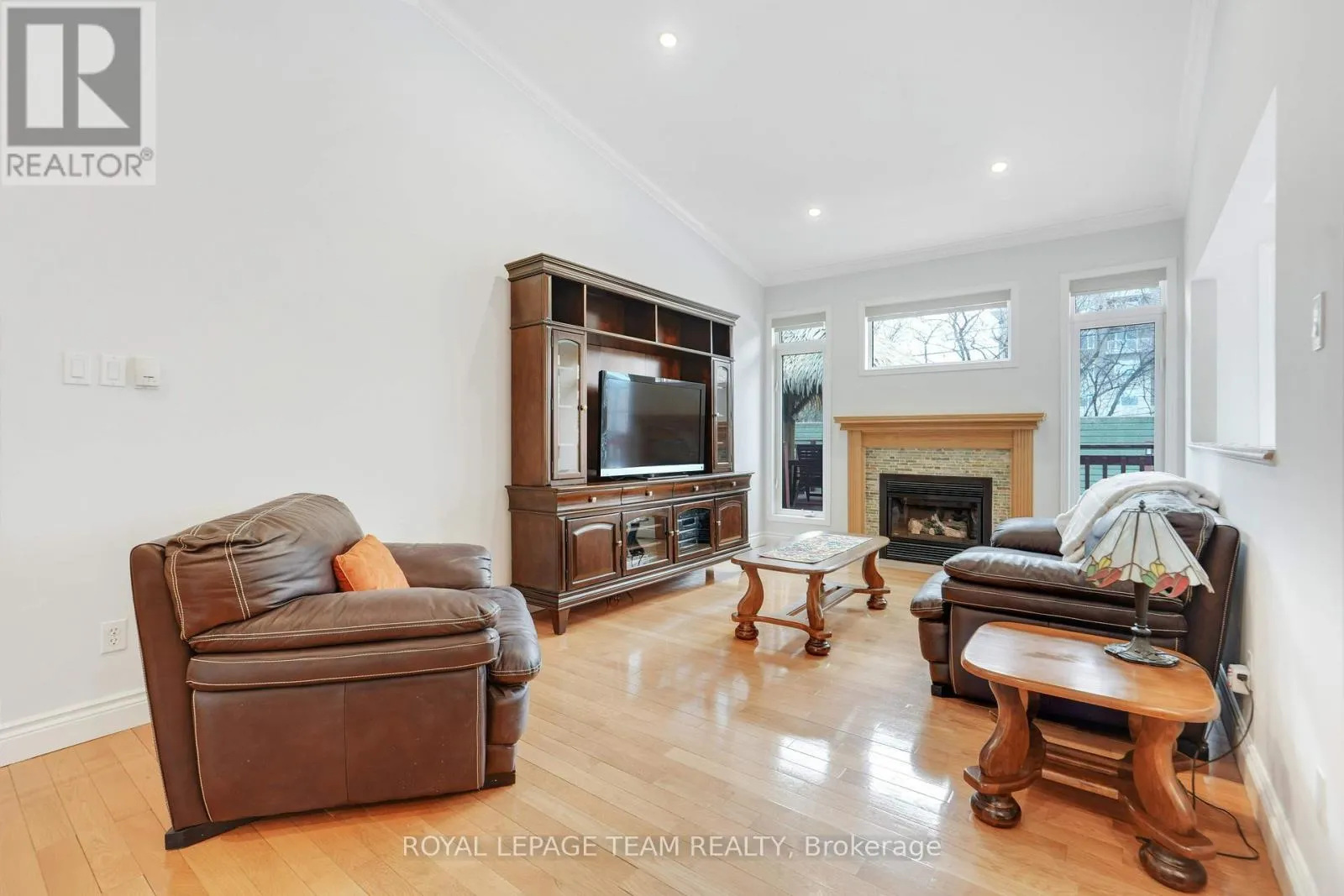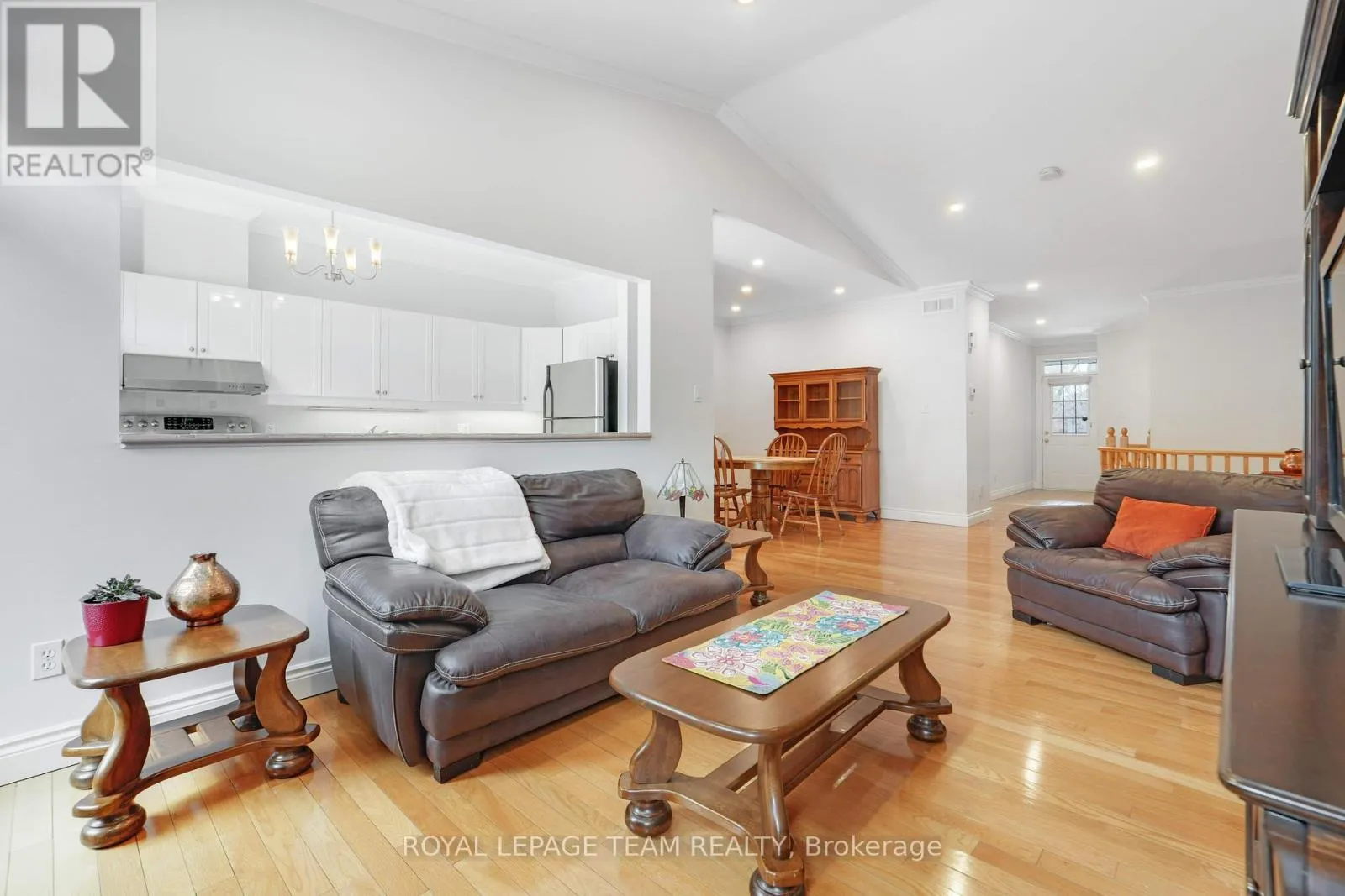 Cross Streets: Hunt Club and McCarthy. ** Directions: From Hunt Club, head North on McCarthy, turn right on Plante, right on Pattermead, then onto Bartlett and property is on your right. Rare bungalow row-unit offering sought-after one-level living, low maintenance, no grass to cut and a spacious double car garage, tucked away on a quiet private street in Ottawa.This bright, open-concept home features a functional and inviting layout, high ceilings, with generous principal rooms, gas fireplace and large windows that fill the space with natural light. Bright kitchen with updated tiles and countertops (2013). The main level includes well-proportioned bedrooms, highlighted by a spacious primary retreat complete with a beautifully renovated ensuite bathroom (2017) and walk-in closet.The unfinished basement presents an excellent opportunity for future customization with bathroom rough-in - whether you envision additional living space, a home gym, workshop, or extended storage. Step outside to enjoy the rear deck - a perfect spot for relaxing, summer barbecues, or morning coffee. Furnace (2025). Association Fee: $166 / month. (id:27476)