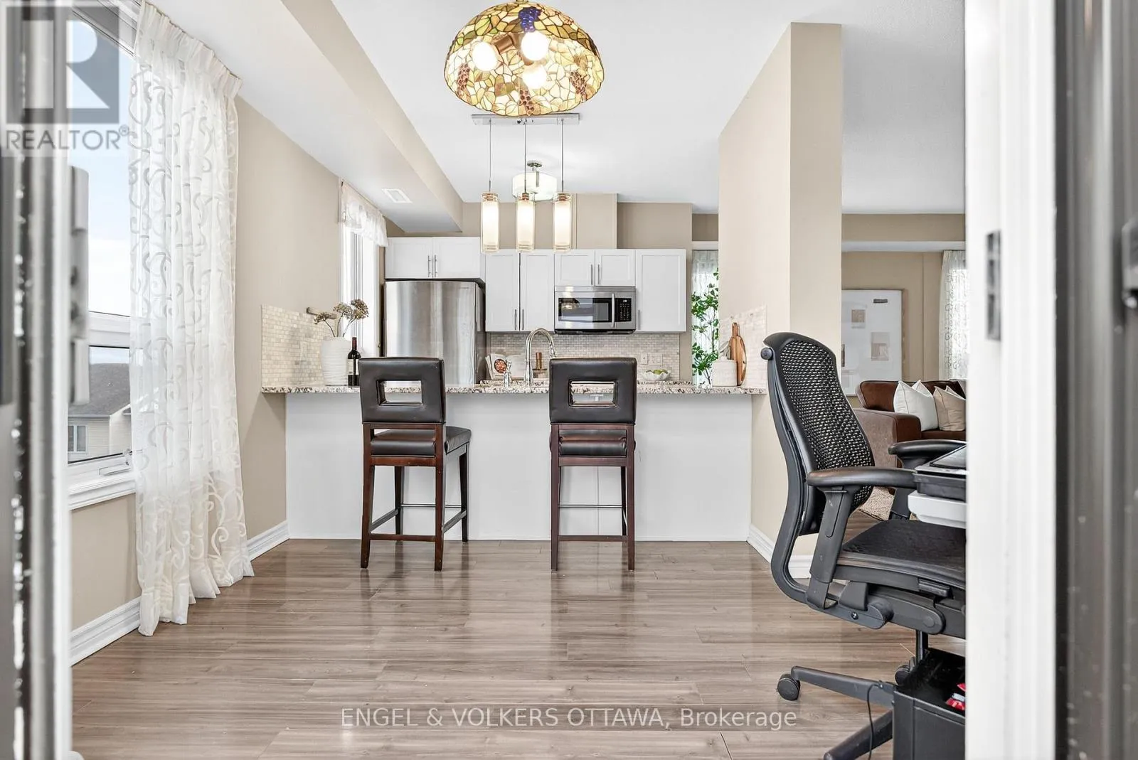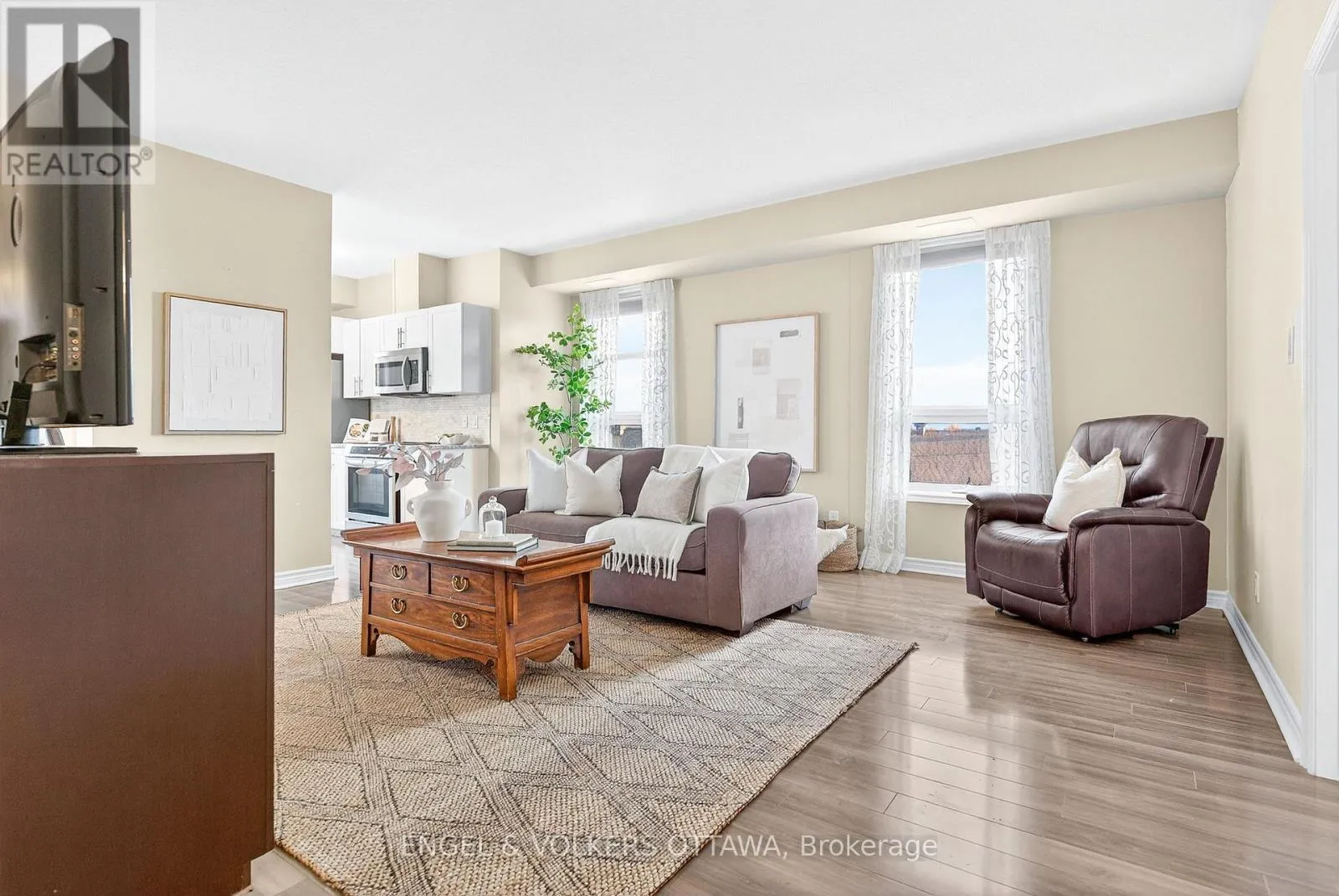 Cross Streets: From Longfields Dr & Chapman Mills Dr. ** Directions: From Longfields Dr turn onto Chapman Mills Dr. Located in the heart of Chapman Mills, this bright and thoughtfully designed Bravo model 2-bed, 2-bath condo spans approximately 1,038 sq. ft. and features a large walkout terrace. The main living area is warm and inviting, with a seamless flow between the dining, kitchen, and living spaces. Oversized windows fill the rooms with natural light, while the updated kitchen features white shaker cabinetry, granite countertops, stainless-steel appliances, and a peninsula with seating that opens into the dining area with direct access to the terrace. With wood-plank flooring and a clear glass railing, this unit's outdoor space is perfect for morning coffee, unwinding with a book, or enjoying views of the surrounding neighbourhood while dining. The primary bedroom, with a tray ceiling detail and plush carpeting, features ample closet space and leads to an ensuite with a walk-in shower. The well-proportioned secondary bedroom features a large picture window and mirrored closet doors, making it ideal as a children's or guest room. A second full bathroom, located near the unit's entrance, features tiled flooring and a tub/shower combo. Just off the main lobby, access to the garage space and a storage locker make unpacking the car a breeze! With everyday amenities just minutes away, including shopping, grocery stores, restaurants, public transit, and cafés, this home is ideal for both downsizers and young professionals in one of Barrhaven's most desirable neighbourhoods! (id:27476)
