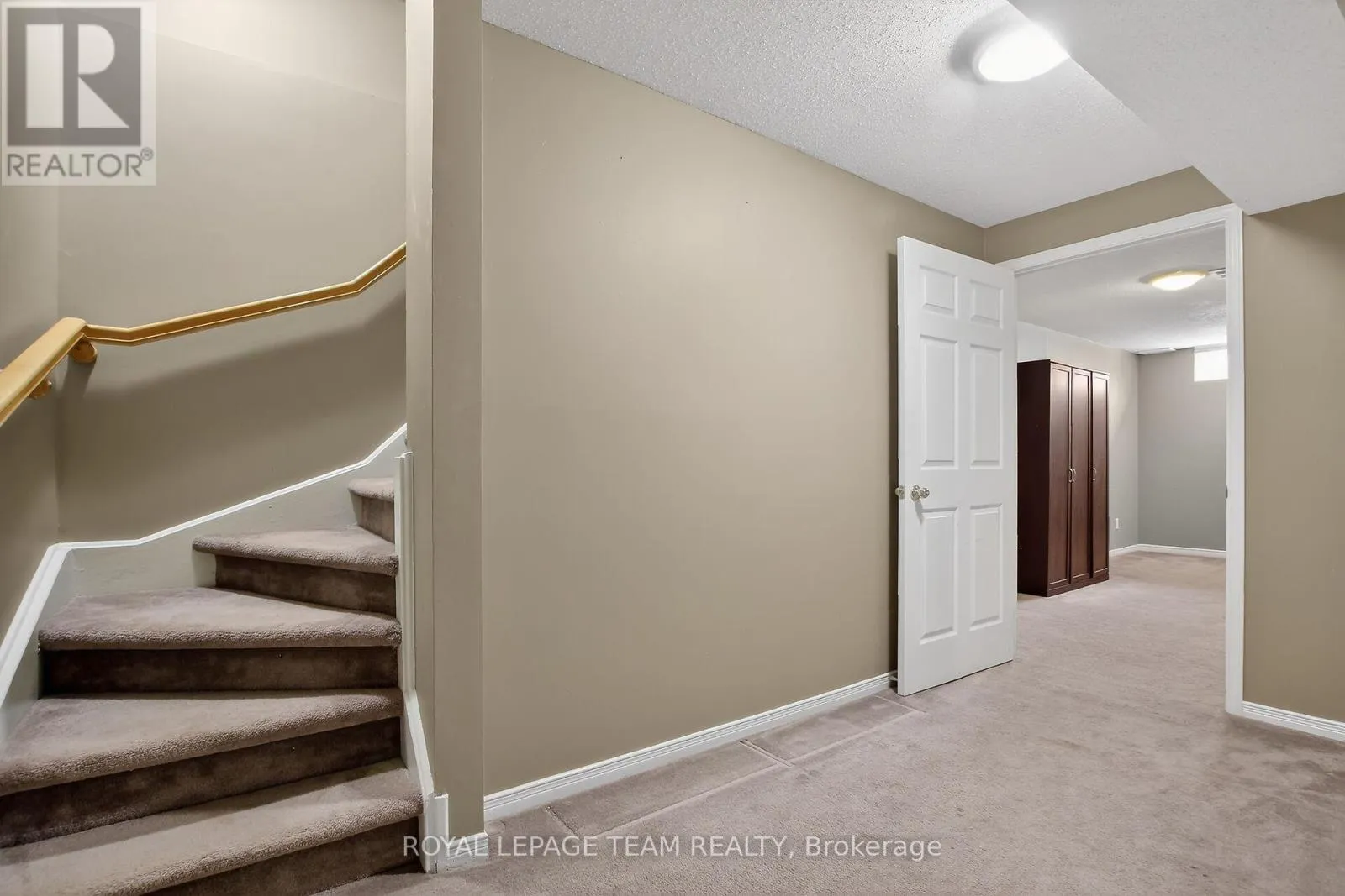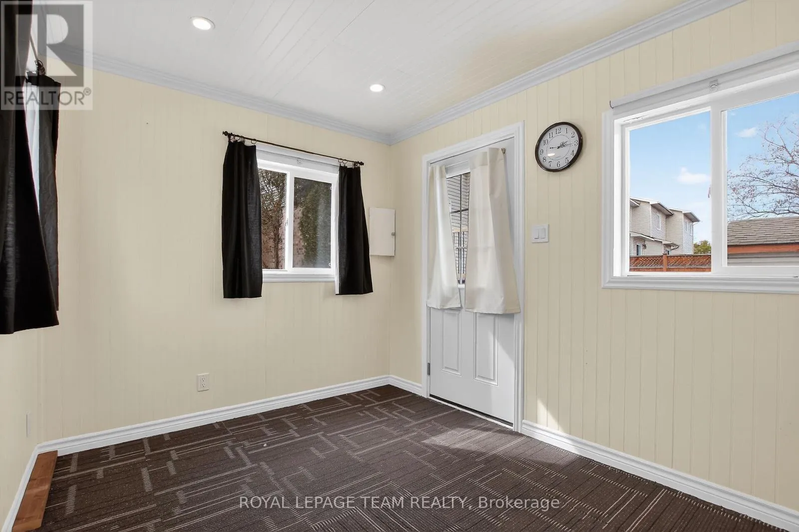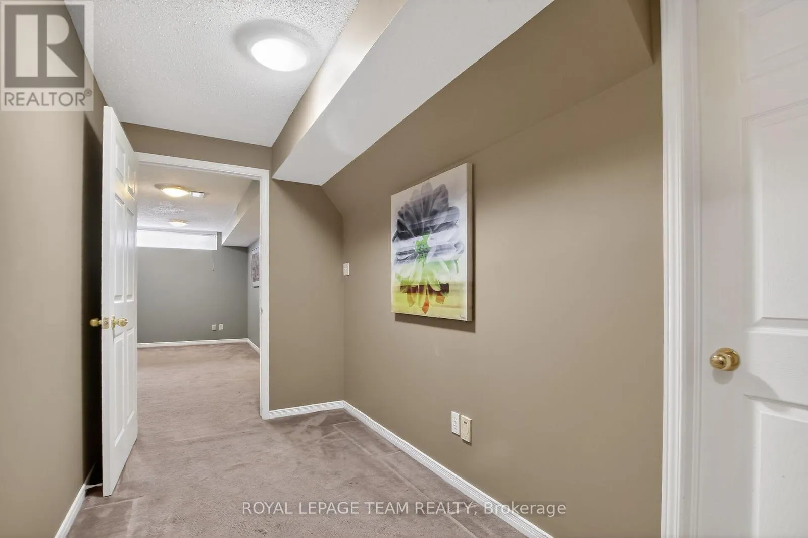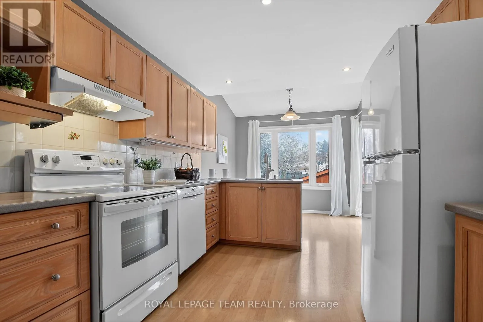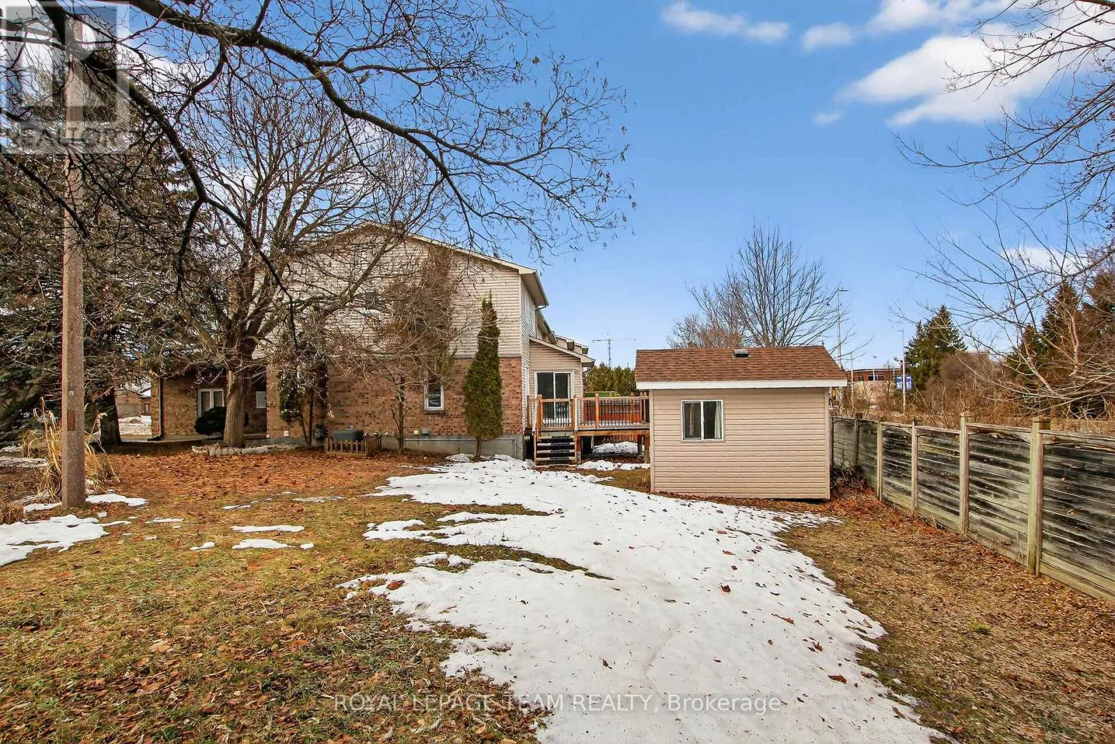 HWY 417 West exit at Castlefrank/Kanata Exit 139 and turn left at the top of the off ramp onto Castlefrank. Turn right onto Aird Place and left onto Baton Court Lovely Holitzner built end unit townhome, located on a private court and on an amazing large lot with mature trees, in the central neighborhood of Katimavik. Three bedrooms, three baths, open plan living & dining room, eat-in kitchen with patio door to composite deck plus finished lower level with gas fireplace. Bonus free standing building/coach house (2022) used as an office, could also be a hobby room. Insulated, power, recessed lighting, engineered hardwood flooring (carpet tile on top).Private enlarged double driveway (4 car parking) with interlock near garage & interlock walkway to covered front porch. Tiled foyer and reception area, has a cut out with view of living room, double closet and entry to the garage is close by. Open living and dining room with updated laminate flooring and several updated windows, fantastic space for entertaining. Kitchen has many tall cabinets, tile backsplash, double stainless steel sink, updated faucet & appliances are included. Eating area in kitchen has vaulted ceiling and recessed lighting and beautiful views of yard. Patio door opens onto the composite deck, great for barbecues and relaxing. Powder room has newer vanity, sink and mirror. Second level with three good-sized bedrooms and two full baths. The primary bedroom has a big window with views of the court and a spacious walk-in closet. The ensuite bath has a vanity with sink, medicine cabinet, glass shelf and double shower with seat. Two more bedrooms with neutral decor, double closets, big windows and overhead lights. The linen closet and full bath is conveniently close by. The main bath has a combined tub and shower with tile surround and vanity with sink and medicine cabinet. Lower level with spacious family room, office area, plus a library area, laundry & utility room. Walk to many parks, schools, shops and Leisure Center. Minutes to bus on Castlefrank & convenient access to 417. Updated windows (2018), garage door & more. 24 hours irrevocable on all offers. (id:27476)