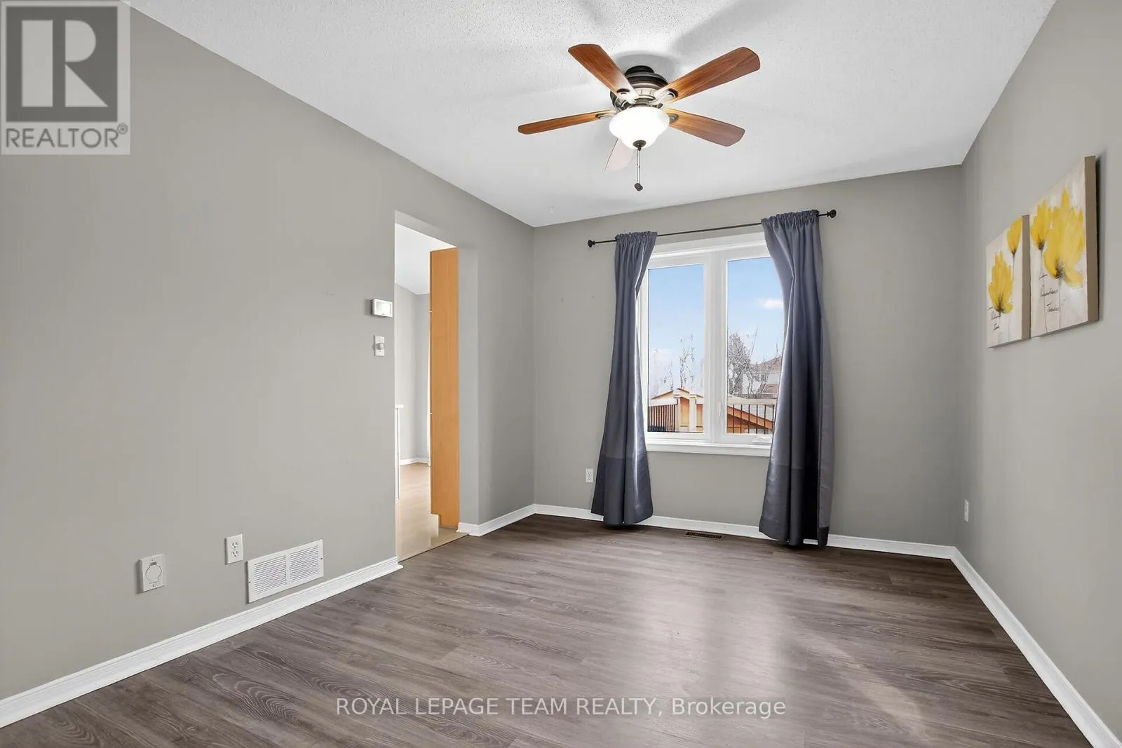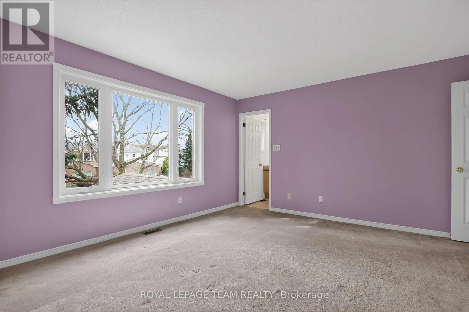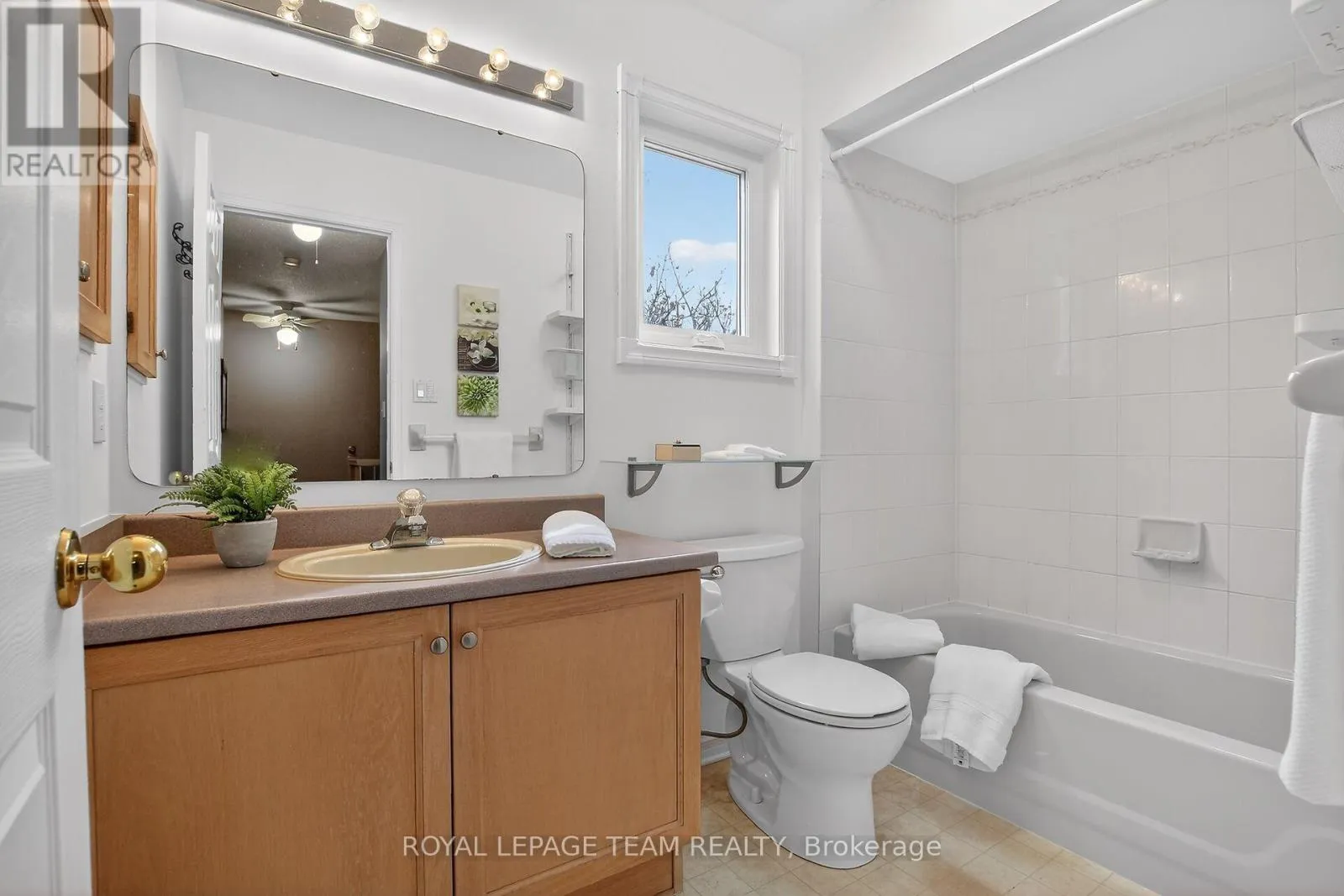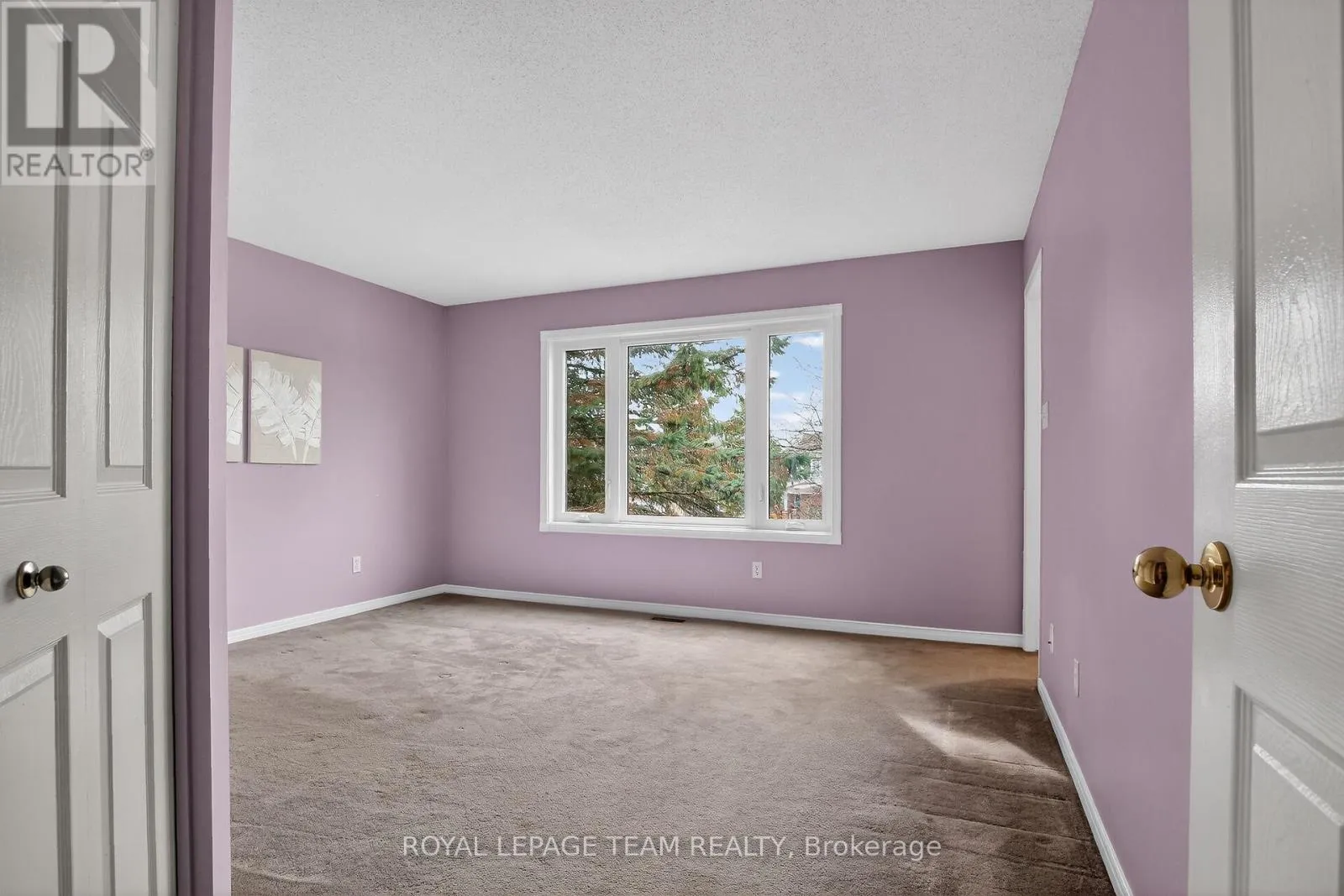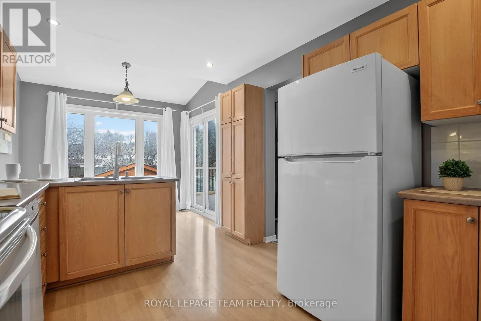 HWY 417 West exit at Castlefrank/Kanata Exit 139 and turn left at the top of the off ramp onto Castlefrank. Turn right onto Aird Place and left onto Baton Court Lovely Holitzner built end unit townhome, located on a private court and on an amazing large lot with mature trees, in the central neighborhood of Katimavik. Three bedrooms, three baths, open plan living & dining room, eat-in kitchen with patio door to composite deck plus finished lower level with gas fireplace. Bonus free standing building/coach house (2022) used as an office, could also be a hobby room. Insulated, power, recessed lighting, engineered hardwood flooring (carpet tile on top).Private enlarged double driveway (4 car parking) with interlock near garage & interlock walkway to covered front porch. Tiled foyer and reception area, has a cut out with view of living room, double closet and entry to the garage is close by. Open living and dining room with updated laminate flooring and several updated windows, fantastic space for entertaining. Kitchen has many tall cabinets, tile backsplash, double stainless steel sink, updated faucet & appliances are included. Eating area in kitchen has vaulted ceiling and recessed lighting and beautiful views of yard. Patio door opens onto the composite deck, great for barbecues and relaxing. Powder room has newer vanity, sink and mirror. Second level with three good-sized bedrooms and two full baths. The primary bedroom has a big window with views of the court and a spacious walk-in closet. The ensuite bath has a vanity with sink, medicine cabinet, glass shelf and double shower with seat. Two more bedrooms with neutral decor, double closets, big windows and overhead lights. The linen closet and full bath is conveniently close by. The main bath has a combined tub and shower with tile surround and vanity with sink and medicine cabinet. Lower level with spacious family room, office area, plus a library area, laundry & utility room. Walk to many parks, schools, shops and Leisure Center. Minutes to bus on Castlefrank & convenient access to 417. Updated windows (2018), garage door & more. 24 hours irrevocable on all offers. (id:27476)