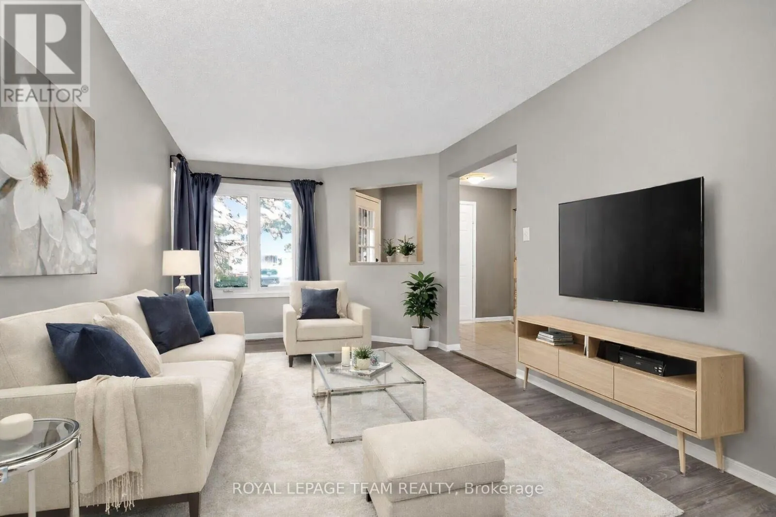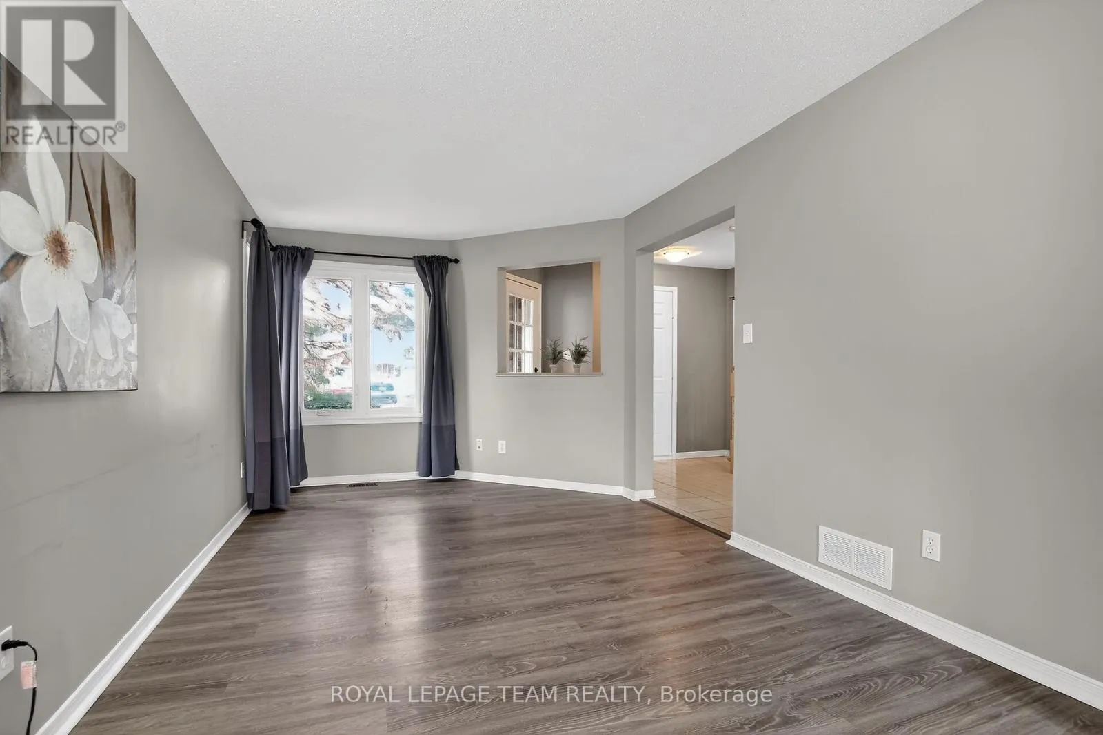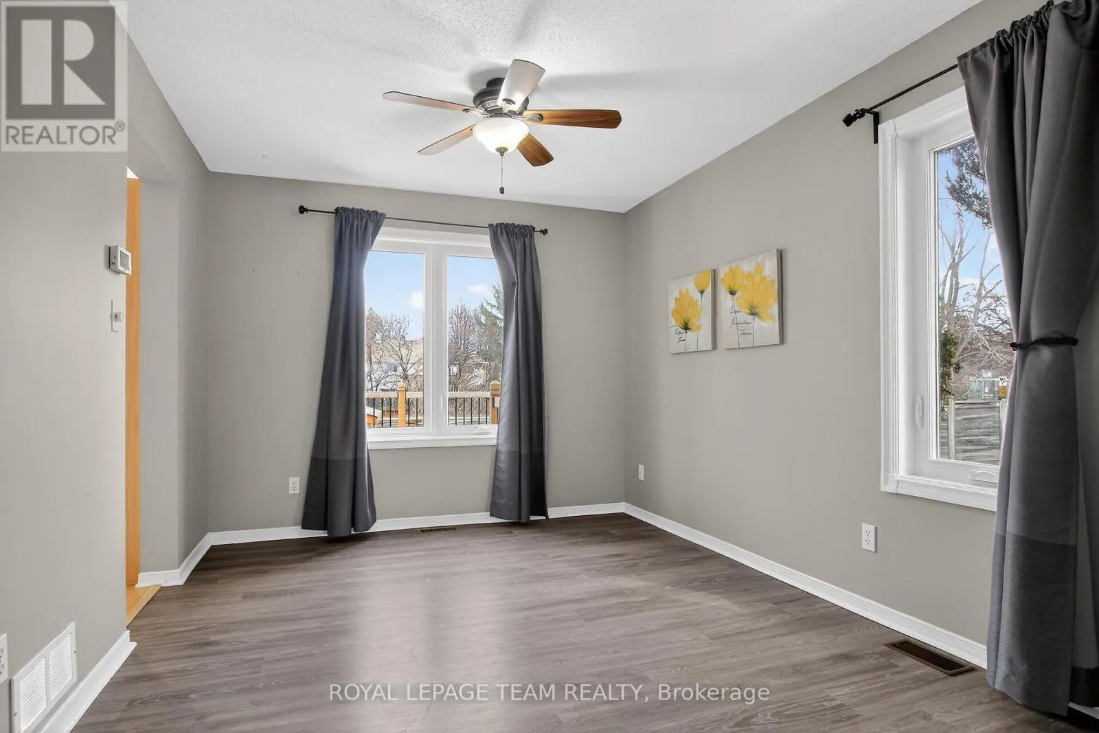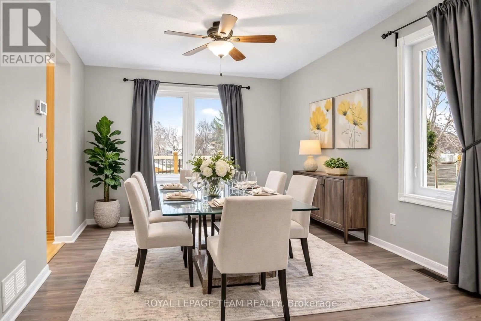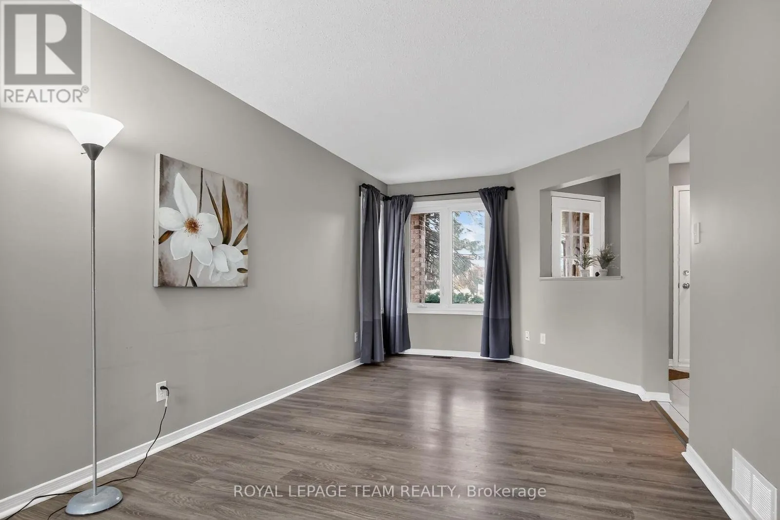 HWY 417 West exit at Castlefrank/Kanata Exit 139 and turn left at the top of the off ramp onto Castlefrank. Turn right onto Aird Place and left onto Baton Court Lovely Holitzner built end unit townhome, located on a private court and on an amazing large lot with mature trees, in the central neighborhood of Katimavik. Three bedrooms, three baths, open plan living & dining room, eat-in kitchen with patio door to composite deck plus finished lower level with gas fireplace. Bonus free standing building/coach house (2022) used as an office, could also be a hobby room. Insulated, power, recessed lighting, engineered hardwood flooring (carpet tile on top).Private enlarged double driveway (4 car parking) with interlock near garage & interlock walkway to covered front porch. Tiled foyer and reception area, has a cut out with view of living room, double closet and entry to the garage is close by. Open living and dining room with updated laminate flooring and several updated windows, fantastic space for entertaining. Kitchen has many tall cabinets, tile backsplash, double stainless steel sink, updated faucet & appliances are included. Eating area in kitchen has vaulted ceiling and recessed lighting and beautiful views of yard. Patio door opens onto the composite deck, great for barbecues and relaxing. Powder room has newer vanity, sink and mirror. Second level with three good-sized bedrooms and two full baths. The primary bedroom has a big window with views of the court and a spacious walk-in closet. The ensuite bath has a vanity with sink, medicine cabinet, glass shelf and double shower with seat. Two more bedrooms with neutral decor, double closets, big windows and overhead lights. The linen closet and full bath is conveniently close by. The main bath has a combined tub and shower with tile surround and vanity with sink and medicine cabinet. Lower level with spacious family room, office area, plus a library area, laundry & utility room. Walk to many parks, schools, shops and Leisure Center. Minutes to bus on Castlefrank & convenient access to 417. Updated windows (2018), garage door & more. 24 hours irrevocable on all offers. (id:27476)
