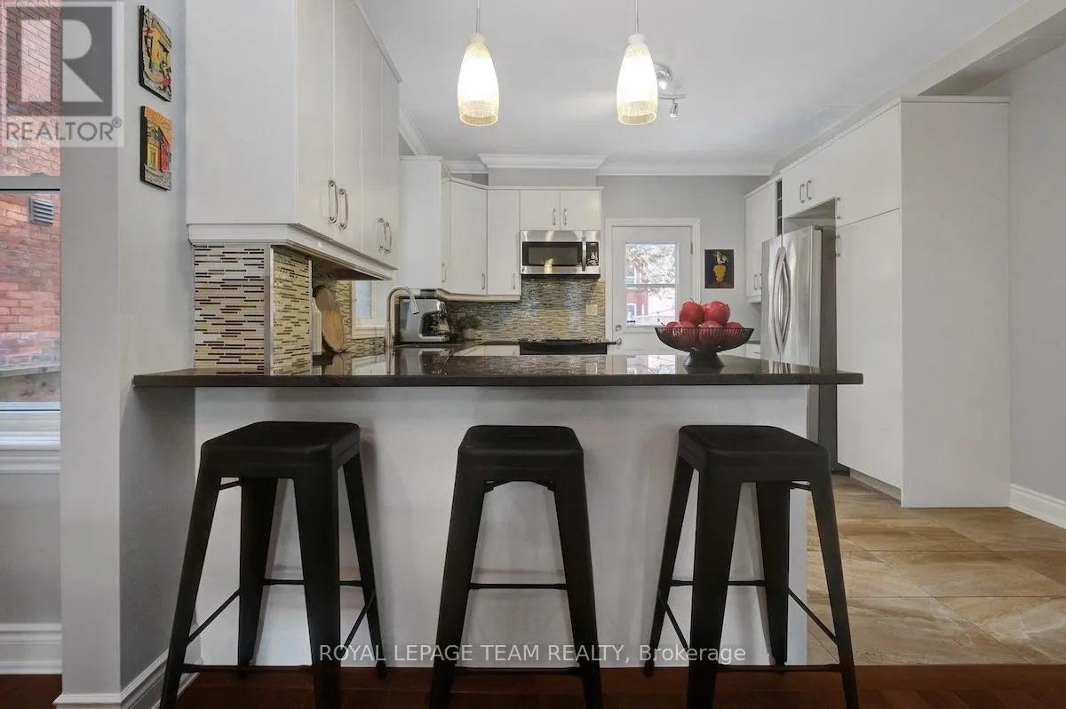 Cross Streets: Bronson/Flora. ** Directions: Percy St.South of Gladstone to West on Flora-Flora is a one way street. Welcome to 281 Flora Street, a charming red-brick home on a quiet street in the heart of Centretown. Blending classic character with thoughtful modern updates, this home offers comfortable urban living just steps to cafés, restaurants, parks, and downtown amenities. The main level features 9' ceilings, crown moulding, and hardwood flooring that flows through the living and dining areas, creating a bright and inviting space for both everyday living and entertaining. The modern kitchen is beautifully appointed with granite countertops, stainless steel appliances, soft-close cabinetry, breakfast bar seating, and a large pantry with convenient pull-out shelving. Upstairs, hardwood flooring continues through the stairwell and upper level. The spacious primary bedroom is filled with natural light and features his-and-hers closets with access to a private upper balcony. Two additional bedrooms offer flexible space for family, guests, or a home office. The fully finished lower level extends the living space with a comfortable rec room featuring custom built-ins and an electric fireplace, along with a convenient 4-piece bathroom. At the rear of the home, a private deck and fenced yard provide a low-maintenance outdoor space perfect for relaxing or entertaining. With its classic curb appeal, thoughtful updates, and unbeatable walkable location, this home offers an excellent opportunity to enjoy the best of Centretown living. Based on Ottawa.ca, this address qualifies for a City of Ottawa street parking permit, subject to availability. (id:27476)