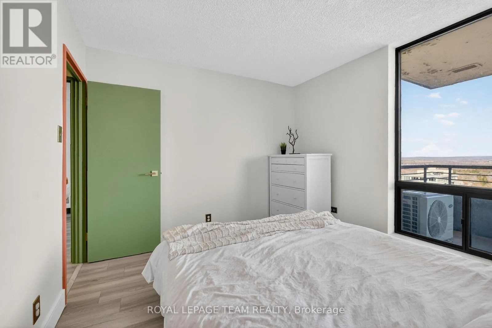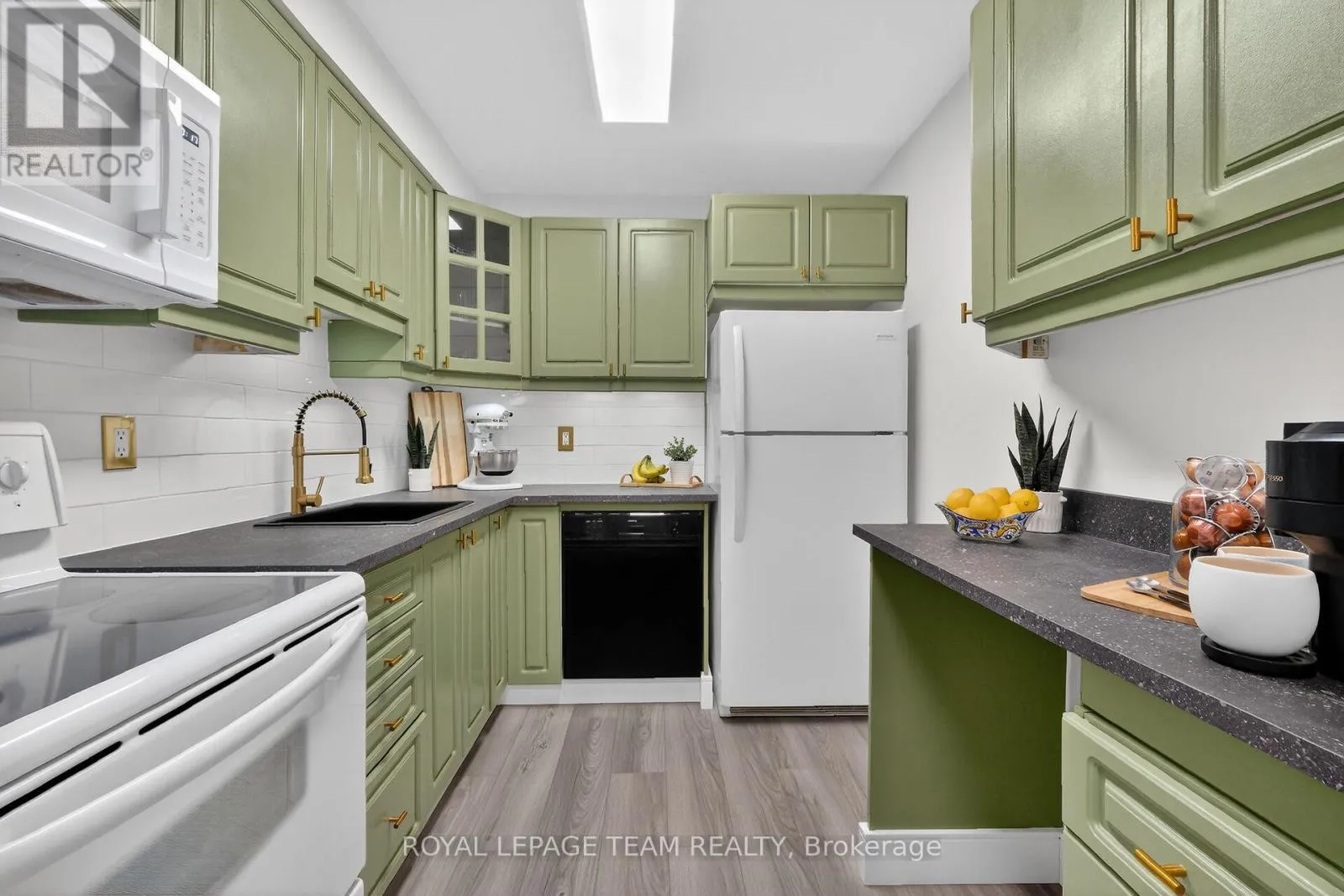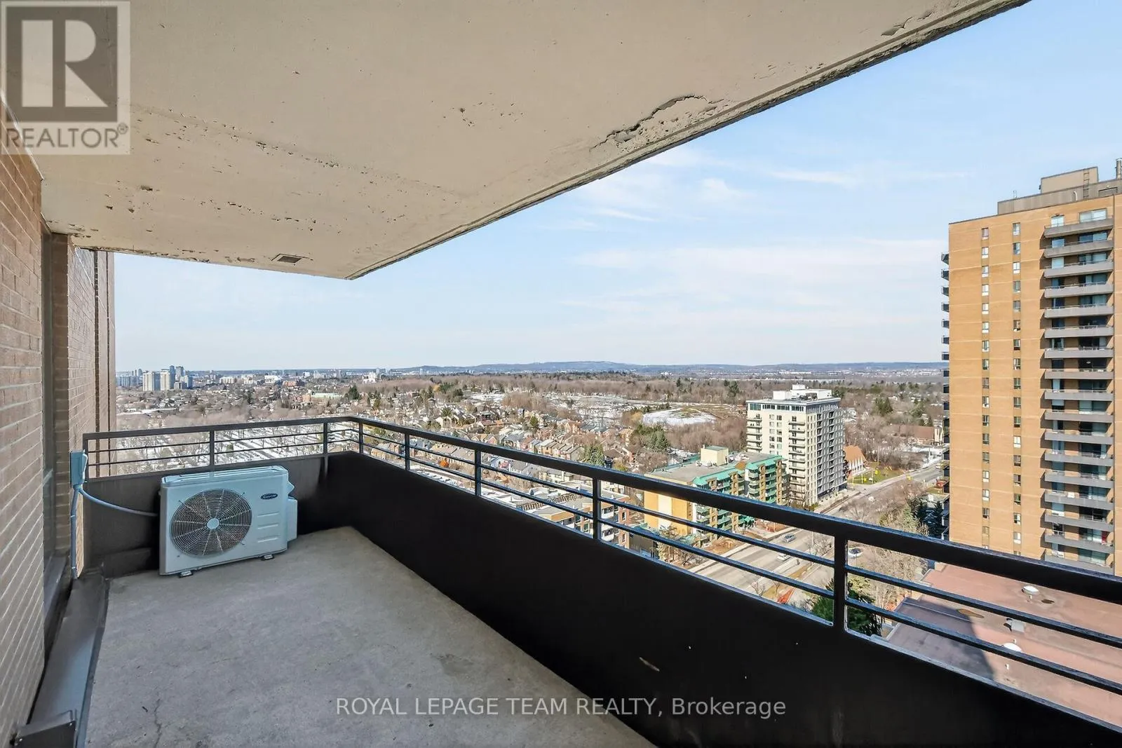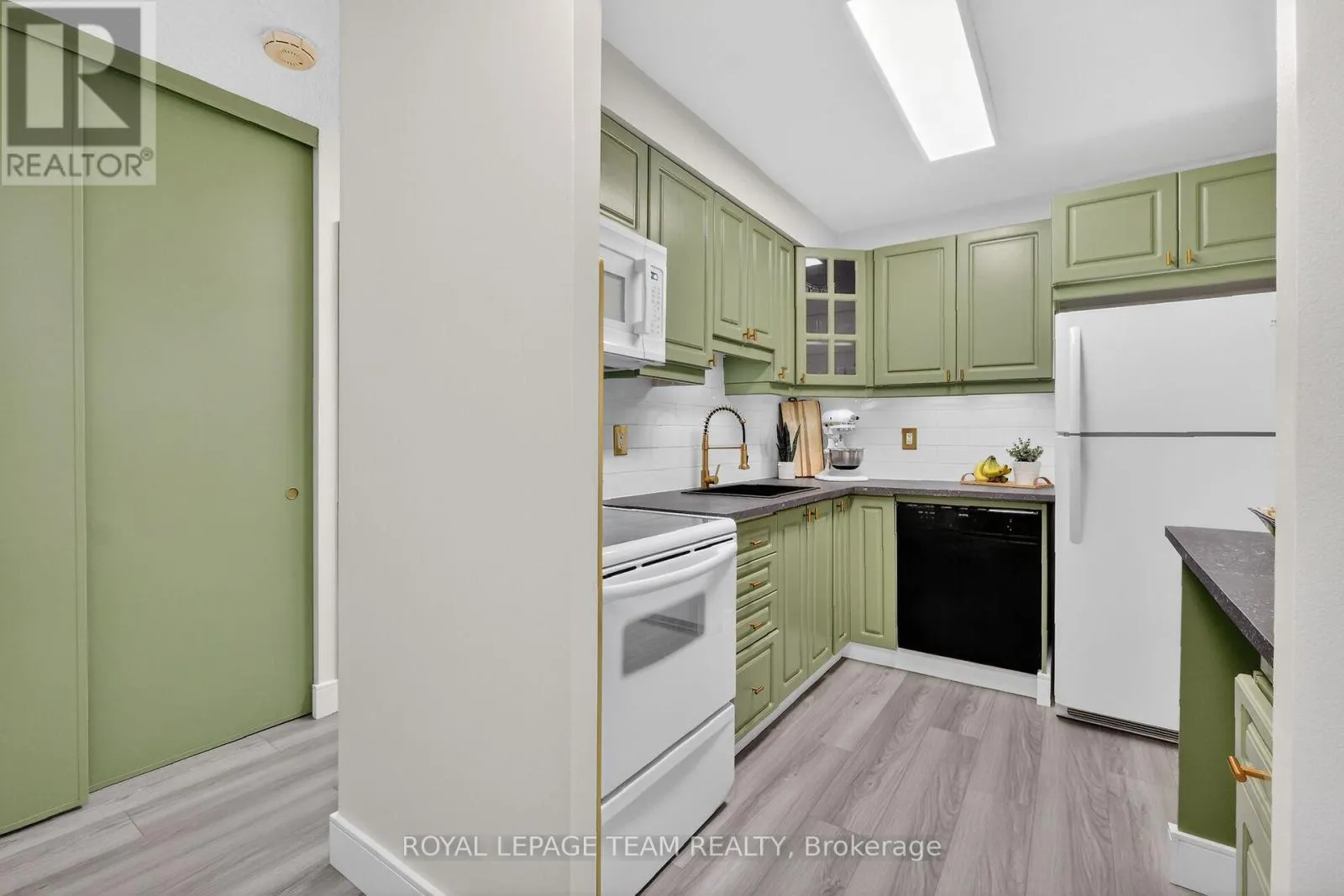 Cross Streets: Montreal Road. ** Directions: St. Laurent North past Montreal Road, up ahead on your RHS. Perched high on the 18th floor, this beautifully updated 2 Bedroom Condo offers sweeping panoramic views and stylish, move-in-ready living in the core of downtown Ottawa. With expansive windows and a private balcony, enjoy stunning cityscapes stretching across the skyline and treetops; an ever-changing view from sunrise to sunset. Step inside to a bright, open-concept Living and Dining space featuring wide plank flooring, modern lighting, and designer accents that create a warm yet contemporary feel. The Living Room flows seamlessly to the balcony, making it the perfect place to relax, entertain, or simply take in the impressive urban views.The updated Kitchen is both functional and stylish, featuring distinctive sage-green cabinetry, modern hardware, ample counter space, subway tile backsplash, and a full appliance package. Thoughtfully designed, it offers excellent storage and efficient workspace for everyday living.The spacious Primary Bedroom features large windows framing the city skyline, while the second Bedroom provides flexibility for guests, a home office, or growing families. The fully renovated Bathroom showcases elegant finishes including a glass shower, modern tilework, and sleek gold accents for a spa-inspired feel. Additional highlights include updated flooring throughout, contemporary fixtures, generous storage, and a well-maintained building with excellent amenities. This Manor Park condo is ideally located close to downtown offices, parks, shopping, restaurants, transit, and the Rideau River pathways, this condo offers the perfect blend of urban convenience and elevated living. A fantastic opportunity for professionals, first-time buyers, or investors looking to own a stylish high-rise condo with unbeatable views. 18th-floor living, spectacular views, and modern updates; this is downtown condo living at its best. (id:27476)