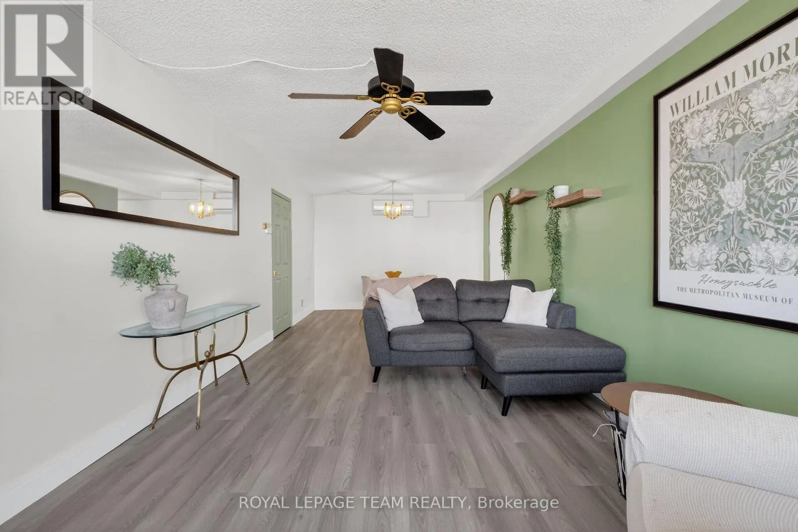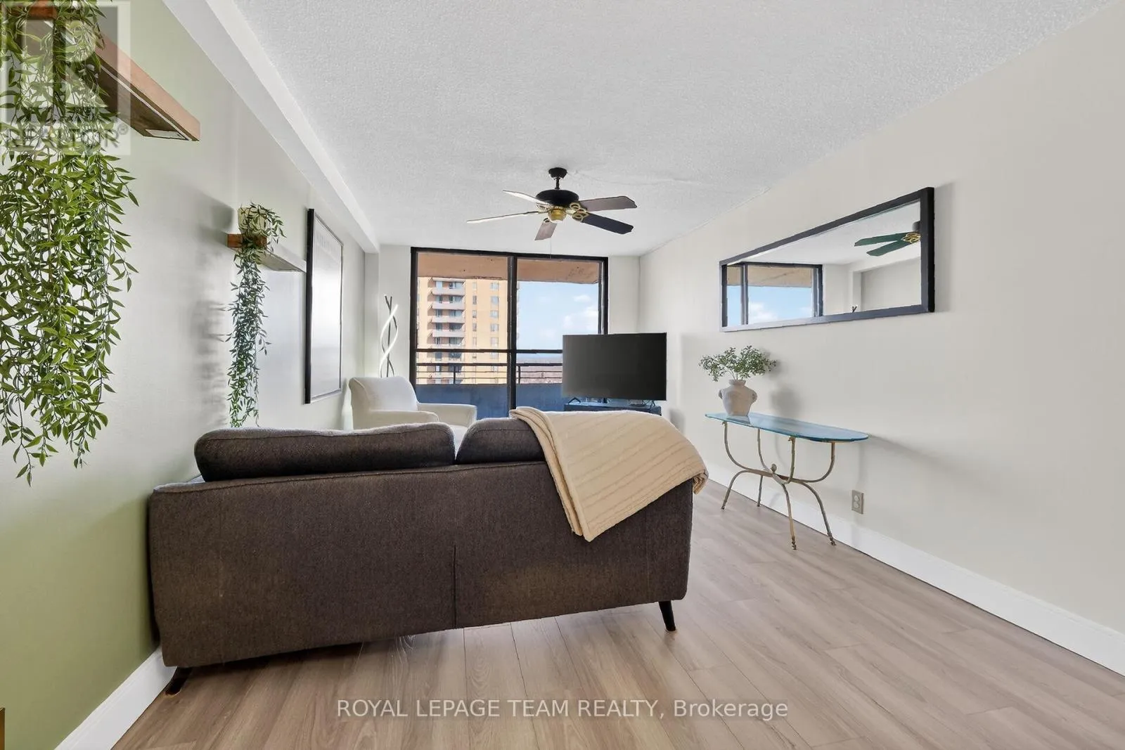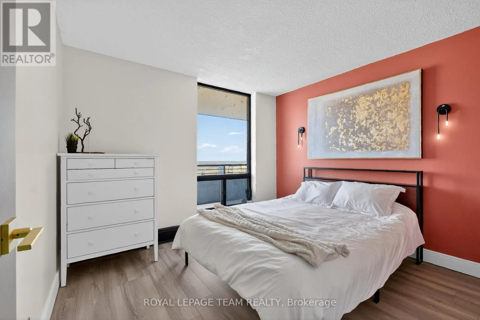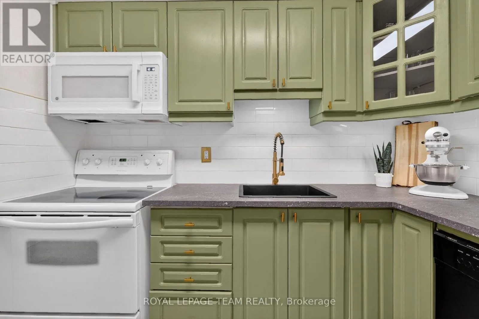 Cross Streets: Montreal Road. ** Directions: St. Laurent North past Montreal Road, up ahead on your RHS. Perched high on the 18th floor, this beautifully updated 2 Bedroom Condo offers sweeping panoramic views and stylish, move-in-ready living in the core of downtown Ottawa. With expansive windows and a private balcony, enjoy stunning cityscapes stretching across the skyline and treetops; an ever-changing view from sunrise to sunset. Step inside to a bright, open-concept Living and Dining space featuring wide plank flooring, modern lighting, and designer accents that create a warm yet contemporary feel. The Living Room flows seamlessly to the balcony, making it the perfect place to relax, entertain, or simply take in the impressive urban views.The updated Kitchen is both functional and stylish, featuring distinctive sage-green cabinetry, modern hardware, ample counter space, subway tile backsplash, and a full appliance package. Thoughtfully designed, it offers excellent storage and efficient workspace for everyday living.The spacious Primary Bedroom features large windows framing the city skyline, while the second Bedroom provides flexibility for guests, a home office, or growing families. The fully renovated Bathroom showcases elegant finishes including a glass shower, modern tilework, and sleek gold accents for a spa-inspired feel. Additional highlights include updated flooring throughout, contemporary fixtures, generous storage, and a well-maintained building with excellent amenities. This Manor Park condo is ideally located close to downtown offices, parks, shopping, restaurants, transit, and the Rideau River pathways, this condo offers the perfect blend of urban convenience and elevated living. A fantastic opportunity for professionals, first-time buyers, or investors looking to own a stylish high-rise condo with unbeatable views. 18th-floor living, spectacular views, and modern updates; this is downtown condo living at its best. (id:27476)