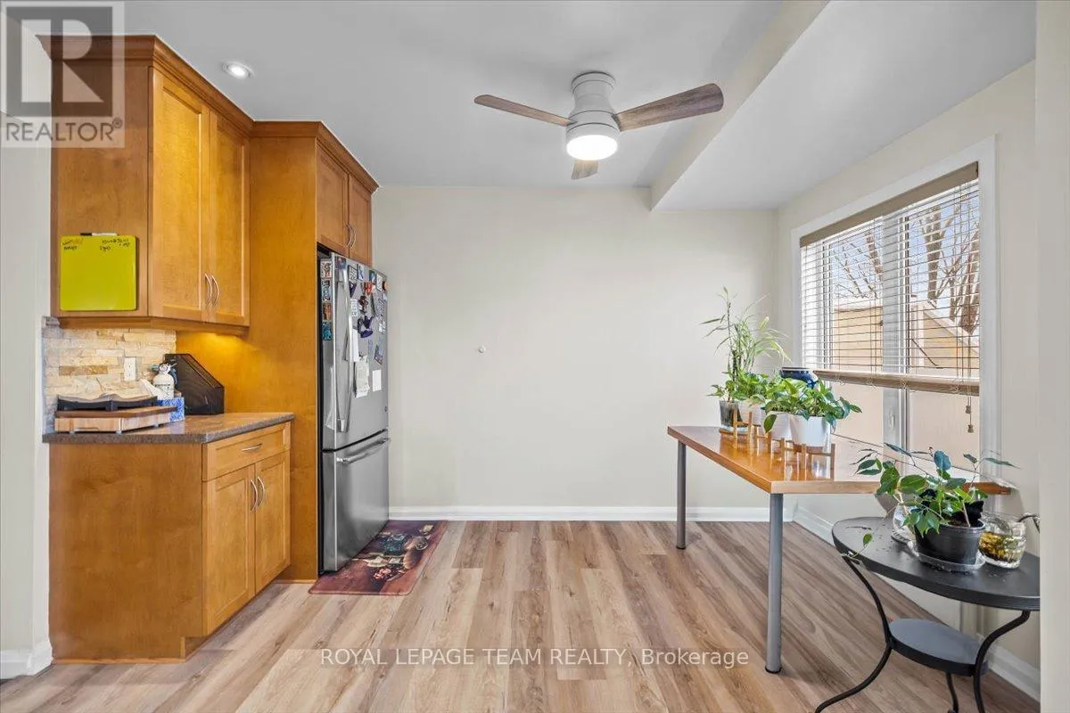 Cross Streets: Montreal Rd and Crownhill. ** Directions: Montreal Rd, south on Elwood, left on Seguin and it becomes Crownhill, left on Sumac and left on Chimney Hill Way. Welcome to a bright, updated, carpet-free 3-bedroom, 2-bathroom condo townhome located in a desirable neighbourhood featuring two covered parking spaces. The lower level features a convenient 3-piece bathroom, laundry room, and a versatile den/office/storage. The main level showcases a renovated kitchen with eating area, modern cabinetry, and pot lights, with direct access to a large balcony-perfect for relaxing or enjoying summer BBQs. A generously sized dining room with built-in shelves and cabinetry flows into a spacious living room highlighted by a wood-burning fireplace, all set on luxury vinyl flooring. This level also leads to a fenced, landscaped yard. Upstairs, you'll find a well-sized primary bedroom with built-in closet cabinetry, along with two additional bedrooms. All three bedrooms feature ceiling fans and laminate flooring. Ideally situated close to public transit, schools, parks, playgrounds, the O-Train, shopping, Costco, restaurants, and more, with easy access to Highway 417. (id:27476)