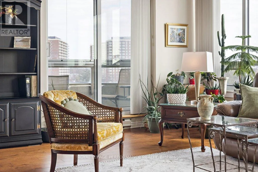Cross Streets: Riverside Drive and 417. ** Directions: From 417 exit highway to Riverside Drive. Refined living meets resort inspired comfort at your suite in the prestigious 'The Classics at Riviera'. This spacious two bedroom plus den residence offers a sophisticated layout designed to impress while remaining highly functional. The open living and dining area is bathed in natural light and features updated windows and patio doors for enhanced efficiency. This space extends to an enclosed southeast facing balcony featuring vibrant city views and windows that open if you wish. Your well positioned den with its own balcony access provides a private flex space perfect for a professional home office or an additional bedroom. The bright eat in kitchen features updated granite countertops, stainless steel appliances, and tile flooring. The primary suite serves as a private retreat complete with a six piece ensuite, a walk in closet, and an additional secondary closet. Interior highlights include high ceilings, hardwood and tile flooring throughout principal rooms, in suite laundry, and a dedicated storage room. Residents of this gated condo community enjoy an exceptional level of service including twenty four hour security and concierge. Your exclusive building amenities include a luxury lobby, event spaces, a library, and a private spa with a sauna and steam room. Enjoy indoor and outdoor spa pools, plus massage and hairstyling facilities. Additional access to the Riviera Club features indoor and outdoor pools, fitness centres, squash, pickleball and tennis courts, and several event spaces for a true resort style experience. Professionally landscaped grounds offer walking paths, water features, and BBQ areas. This prime location is minutes to downtown and steps from public transit at Hurdman Station. Enjoy easy access to shopping, hospitals, universities and riverfront biking trails right at your backdoor. Owned underground parking and a storage locker are included, plus ample outdoor visitor parking. 24 hour irrevocable on all offers. (id:27476)