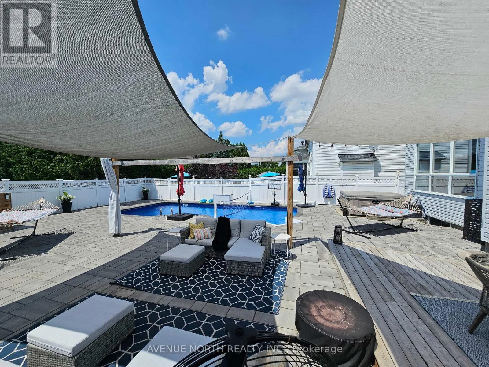 Cross Streets: Golflinks & Bracewood. ** Directions: Golflinks & Bracewood Way. Welcome home to this beautifully renovated property in the highly sought-after community of Stonebridge. From the moment you walk in, you're greeted by impressive cathedral ceilings and a spacious entryway with built-in storage designed to keep coats, shoes, and everyday essentials organized. A bright home office and elegant dining area create the perfect space for both work and entertaining. The heart of the home is the stunning chef's kitchen featuring stainless steel appliances, a gas double oven, built-in microwave, and a large island with a beautiful butcher-block cutting surface. The kitchen flows seamlessly into the sun-filled living room with soaring cathedral ceilings, a cozy gas fireplace, and large windows overlooking the spectacular backyard. Step outside into your private backyard oasis. Thoughtfully designed for entertaining and relaxation, the fully renovated yard features a beautiful inground pool, new interlock, built-in deck with canopies, waterfall feature, hot tub, gas BBQ hookup, and elegant fencing surrounding the spacious yard. The large master bedroom offers a second built-in air conditioning unit that allows the upper level to stay cool and relaxing. Additional highlights include a convenient laundry room, tinted windows to help manage sunlight, stylish drapery and blinds, a welcoming front porch, and a two-car garage. The fully finished basement offers large bright windows, a full bathroom, an additional bedroom ideal for guests or teens, extra-thick flooring for warmth and comfort, and plenty of storage. This exceptional home offers the perfect blend of luxury, comfort, and outdoor living in one of Ottawa's most desirable neighborhoods. (id:27476)