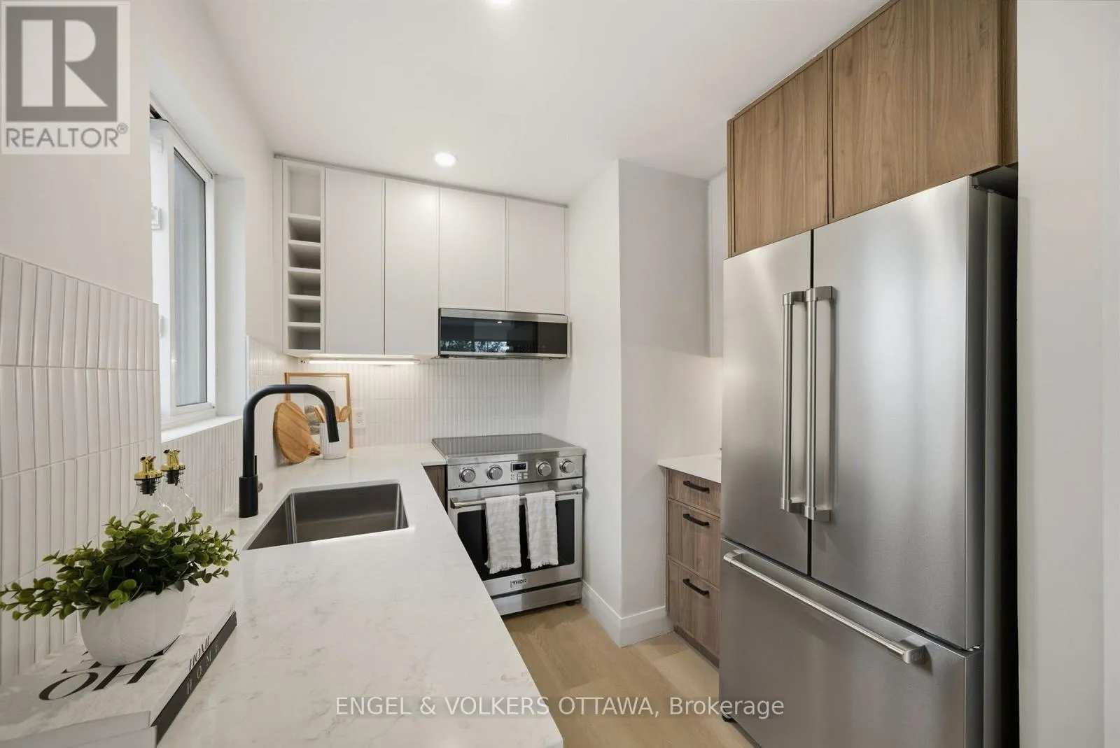 Cross Streets: Heron Rd & Baycrest Dr. ** Directions: Heron Rd. Welcome to this completely transformed condo located at 1490 Heron Road. Featuring two bedrooms, 2 full bathrooms, parking and a functional layout with modern finishes making it perfect for first time buyers, downsizers, professionals & investors. Wide-plank flooring runs throughout the main living areas and recessed lighting that enhances the bright, contemporary style. The open-concept living room is anchored by large south-facing windows that flood the space with natural light, creating a welcoming atmosphere for entertaining and providing direct access to the private covered balcony with glass-panel railings. The kitchen boasts quartz countertops, vertical tile backsplash, eye-catching two-tone cabinetry and Thor stainless steel appliances. The unit includes a spacious primary bedroom, a three-piece ensuite with heated floors, and a versatile secondary bedroom with ample closet space, large windows for natural light, and flooring consistent with the rest of the unit. The shared bathroom features a modern stone vanity, heated floors, and matte-black fixtures. Unique to this building, an in-unit laundry room near the entrance offers custom cabinetry and counter space just above the 2-in-1 washer/dryer. The location provides excellent access to downtown Ottawa, Old Ottawa East, and the Glebe via Bank St, Alta Vista Drive, and Riverside Drive, as well as multiple public transit options nearby. The surrounding neighbourhoods are known for their outdoor recreation opportunities and proximity to everyday amenities, including shopping, grocery stores, cafes, schools, and the city's major hospitals (CHEO & The Ottawa Hospital). Don't miss this opportunity to live in this fully renovated condo located in one of Ottawa's emerging neighbourhoods! Covered parking included. (id:27476)