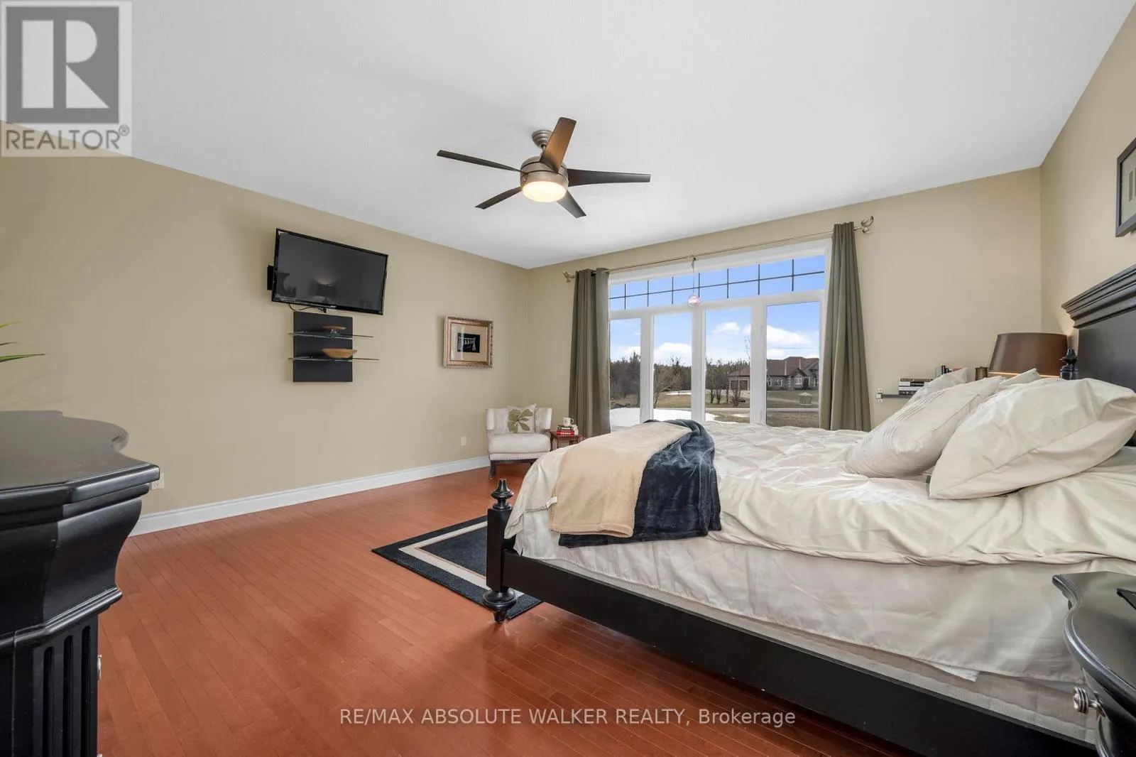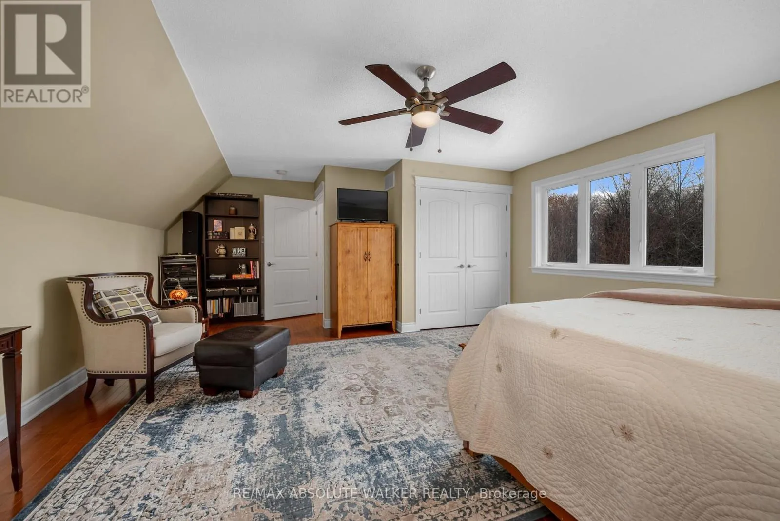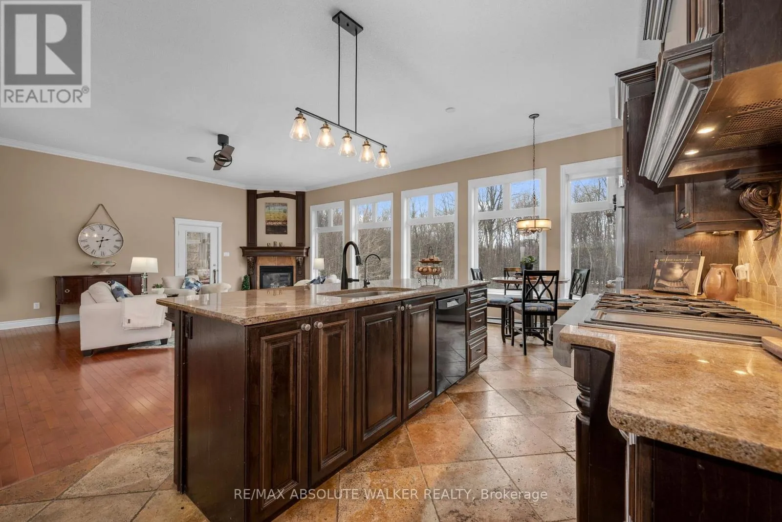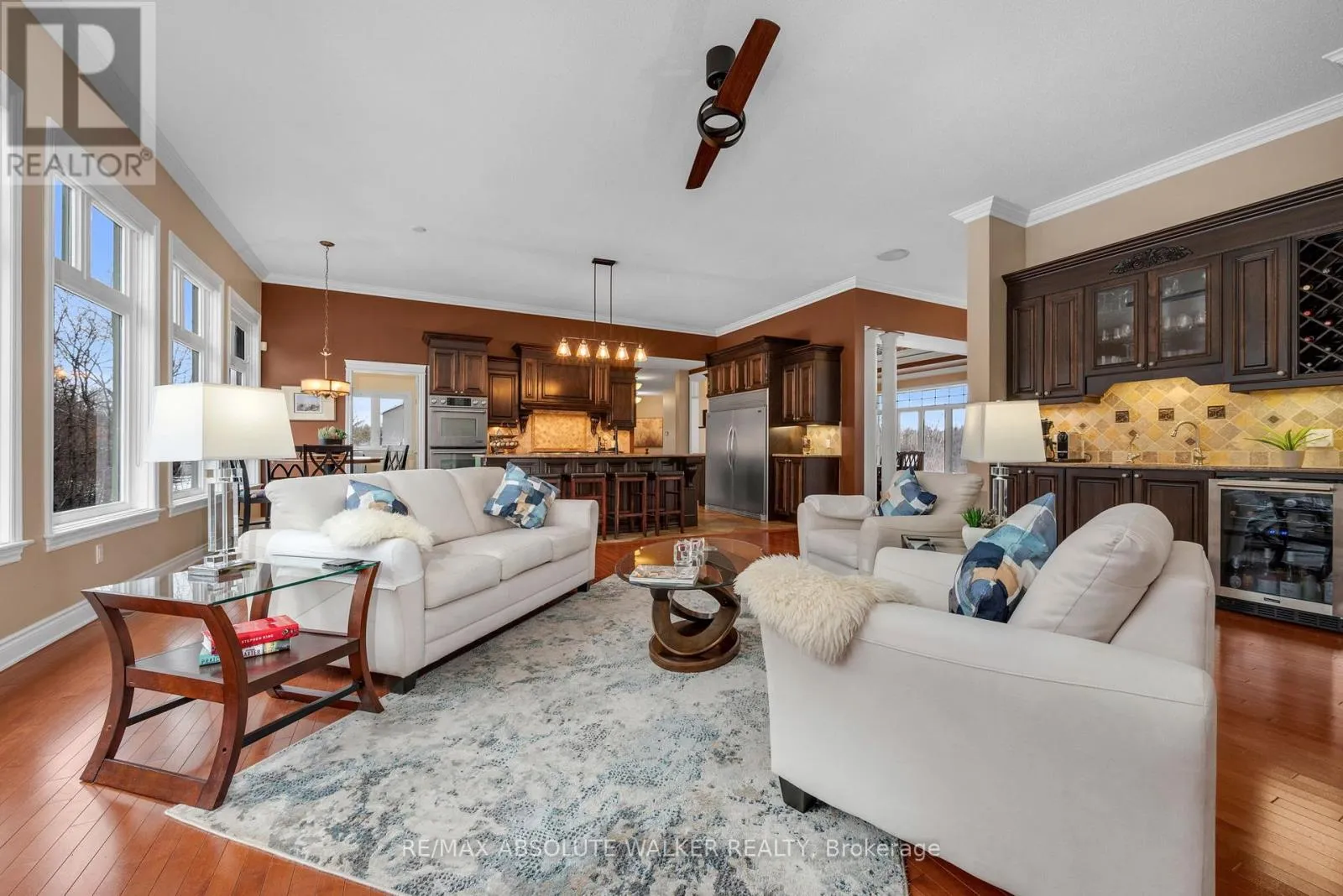 Cross Streets: Mitch Owens and 8th Line Rd. ** Directions: Mitch Owens to 8th Line Rd. to Adam Baker. Set on a private, wooded 1.97-acre executive lot just 20 minutes from downtown Ottawa, this custom Corvinelli bungalow features over 4,800 sq.ft. of thoughtfully designed finished living space with 3+2 bedrooms and 3 full bathrooms. An extra-wide foyer welcomes you into beautifully appointed principal rooms. The living room impresses with 11ft ceilings, architectural mouldings, a warm fireplace, and expansive windows showcasing forest views. A wet bar with a beverage fridge and wine storage adds the perfect touch for entertaining while the formal dining room, framed by decorative columns, features a custom coved ceiling and provides an elegant setting for gatherings. At the heart of the home is a chef-inspired kitchen with granite countertops, a large centre island with seating, heated floors, JennAir double wall ovens, a gas cooktop, and custom maple cabinetry. A spacious walk-in pantry offers excellent storage. Just beyond, the three-season sunroom with a fireplace overlooks the landscaped gardens and deck, creating a warm and inviting retreat. The private primary suite offers rich hardwood flooring, large windows, a walk-in closet, and a spa-like ensuite with heated floors, a double vanity, and an oversized walk-in shower with dual shower heads. An additional main floor bedroom, a full bathroom, and a well-designed laundry room with custom cabinetry complete this level. A bonus room above the garage offers the perfect space for teenage retreat, guest room, or studio. The walk-out lower level is ideal for guests or multigenerational living with a bright family room, accessory kitchen, two bedrooms, a full bathroom with heated floors, plus flexible spaces including a home theatre/gym, office, and workshop. Additional highlights include a three-car garage with 9ft doors and EV charger connection, a 17kW Generac generator, and upgraded insulated siding (2024). An exceptional property offering luxury, space, craftsmanship and privacy. (id:27476)