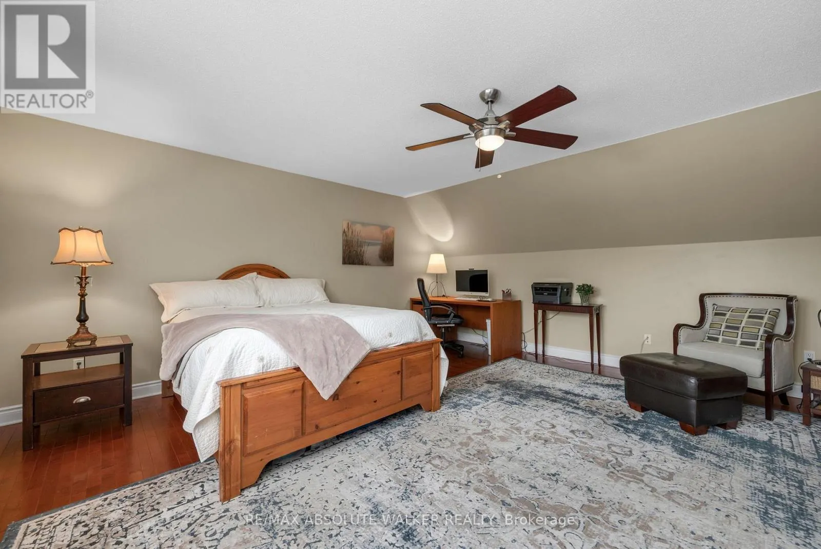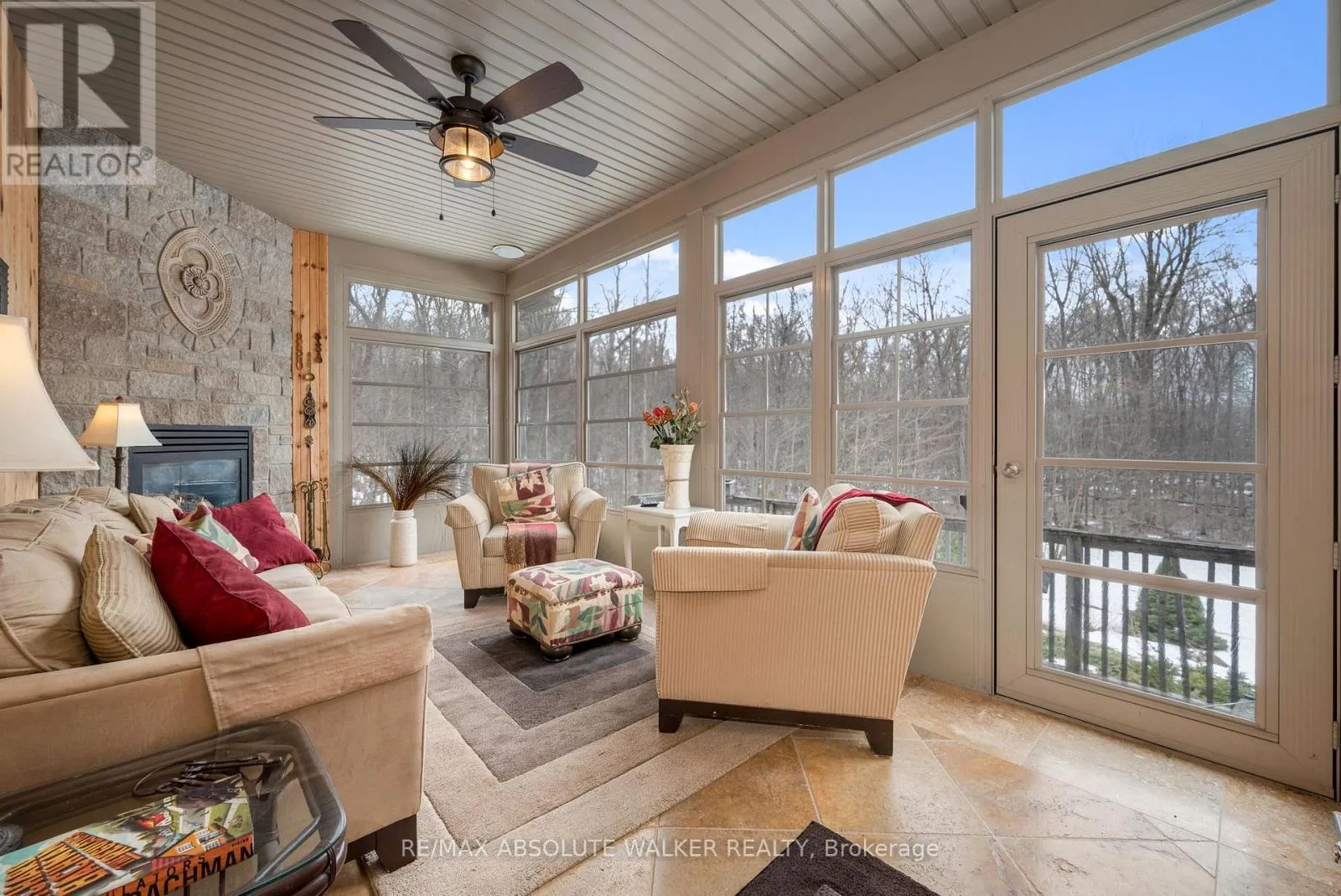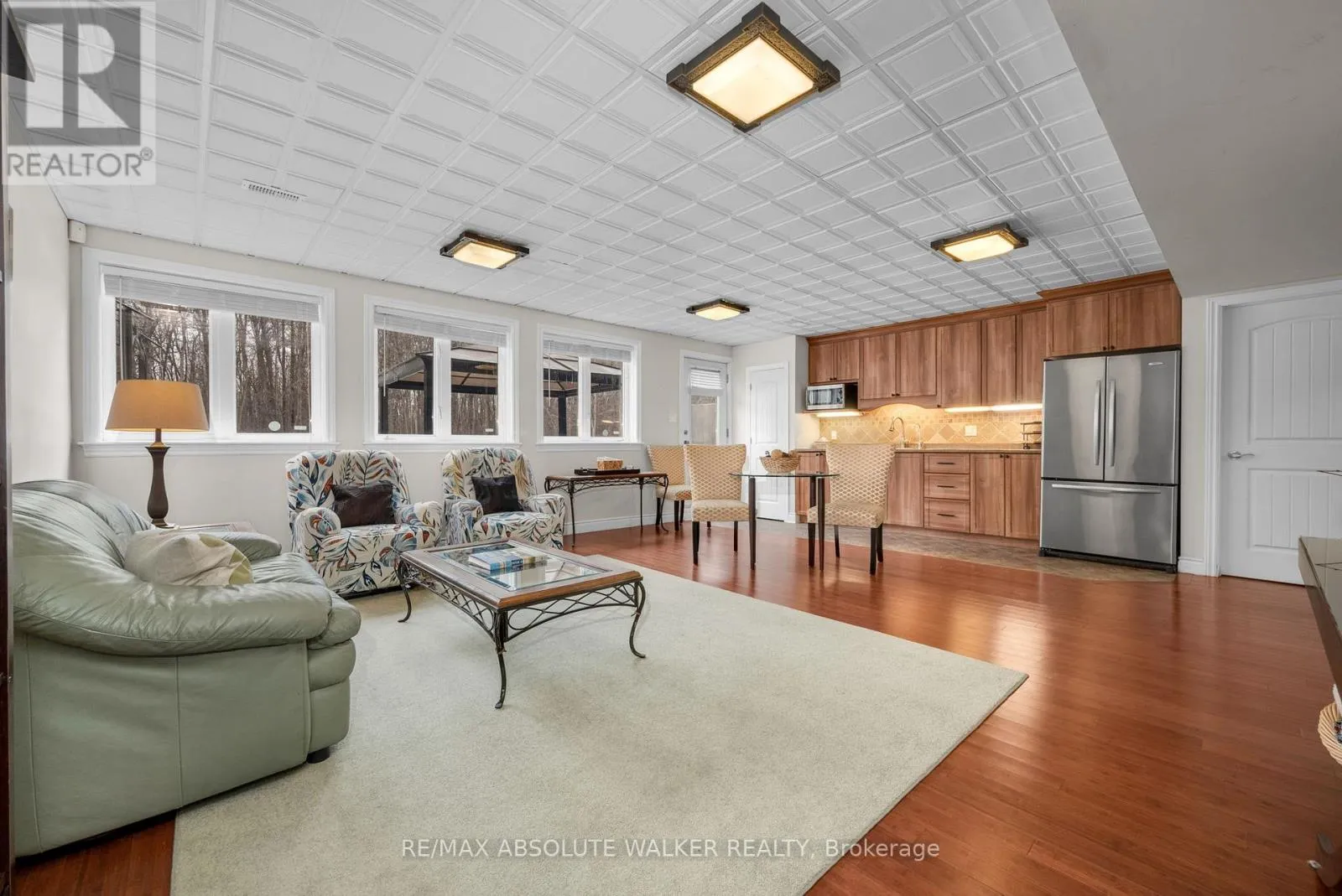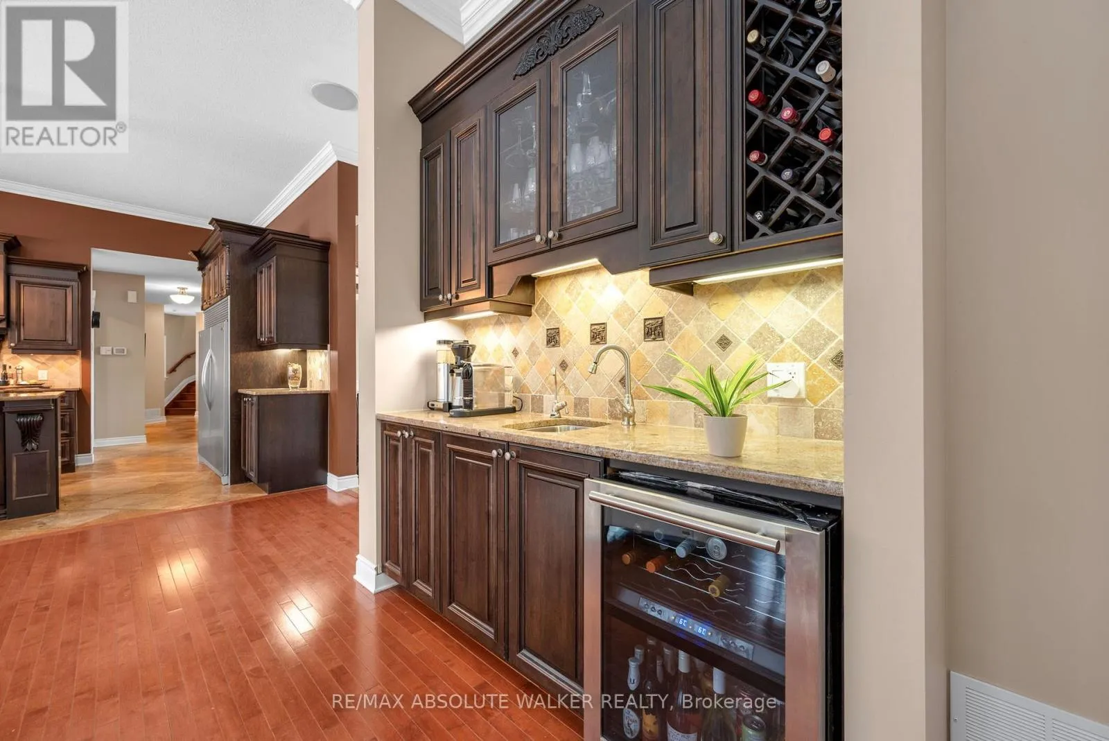 Cross Streets: Mitch Owens and 8th Line Rd. ** Directions: Mitch Owens to 8th Line Rd. to Adam Baker. Set on a private, wooded 1.97-acre executive lot just 20 minutes from downtown Ottawa, this custom Corvinelli bungalow features over 4,800 sq.ft. of thoughtfully designed finished living space with 3+2 bedrooms and 3 full bathrooms. An extra-wide foyer welcomes you into beautifully appointed principal rooms. The living room impresses with 11ft ceilings, architectural mouldings, a warm fireplace, and expansive windows showcasing forest views. A wet bar with a beverage fridge and wine storage adds the perfect touch for entertaining while the formal dining room, framed by decorative columns, features a custom coved ceiling and provides an elegant setting for gatherings. At the heart of the home is a chef-inspired kitchen with granite countertops, a large centre island with seating, heated floors, JennAir double wall ovens, a gas cooktop, and custom maple cabinetry. A spacious walk-in pantry offers excellent storage. Just beyond, the three-season sunroom with a fireplace overlooks the landscaped gardens and deck, creating a warm and inviting retreat. The private primary suite offers rich hardwood flooring, large windows, a walk-in closet, and a spa-like ensuite with heated floors, a double vanity, and an oversized walk-in shower with dual shower heads. An additional main floor bedroom, a full bathroom, and a well-designed laundry room with custom cabinetry complete this level. A bonus room above the garage offers the perfect space for teenage retreat, guest room, or studio. The walk-out lower level is ideal for guests or multigenerational living with a bright family room, accessory kitchen, two bedrooms, a full bathroom with heated floors, plus flexible spaces including a home theatre/gym, office, and workshop. Additional highlights include a three-car garage with 9ft doors and EV charger connection, a 17kW Generac generator, and upgraded insulated siding (2024). An exceptional property offering luxury, space, craftsmanship and privacy. (id:27476)