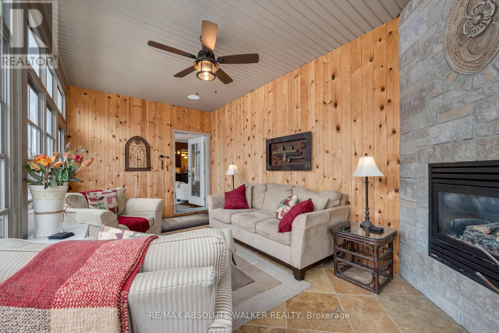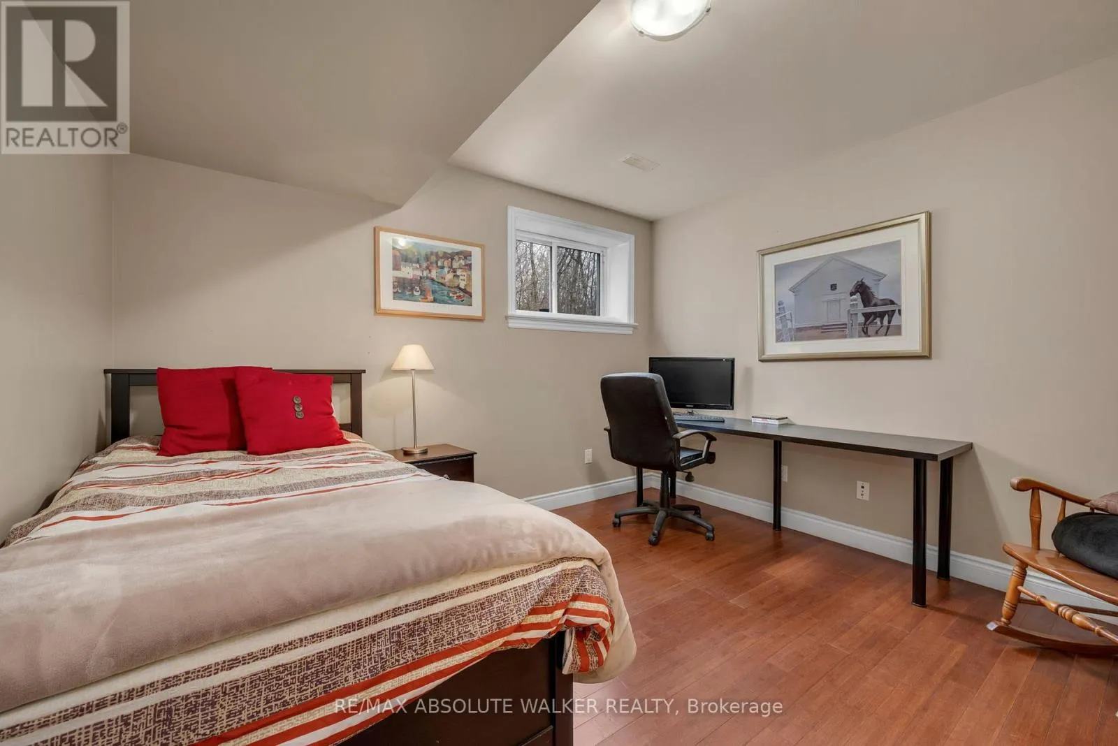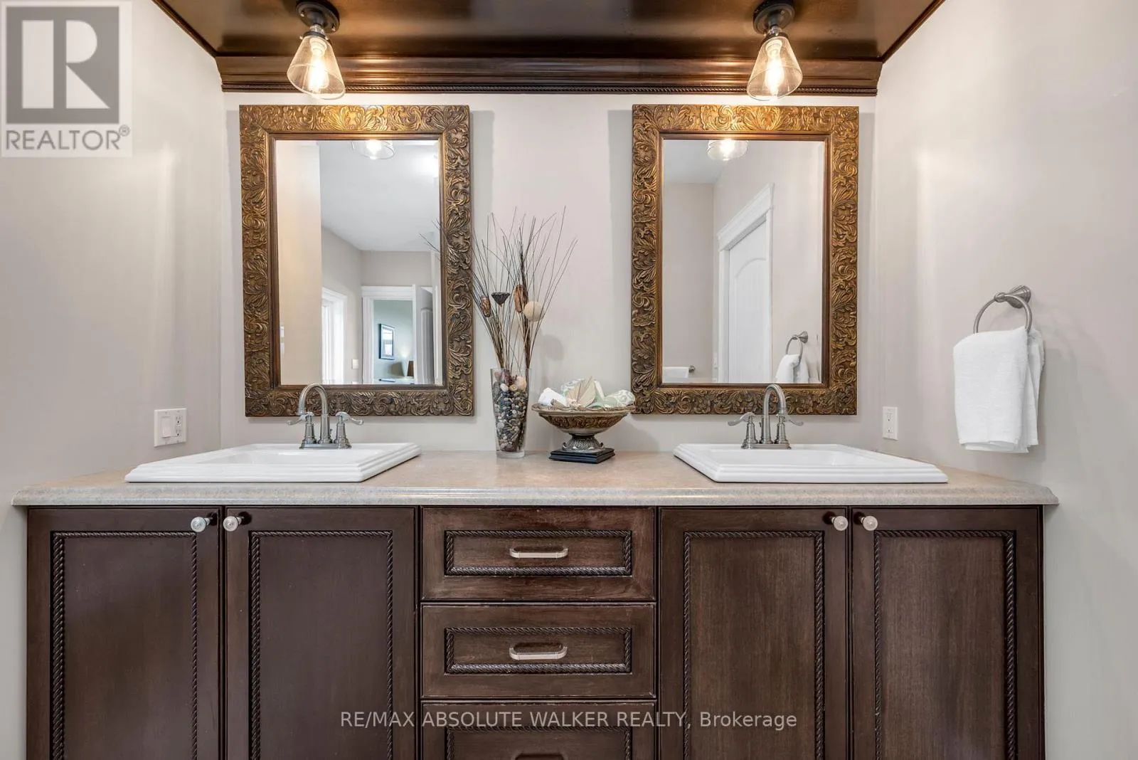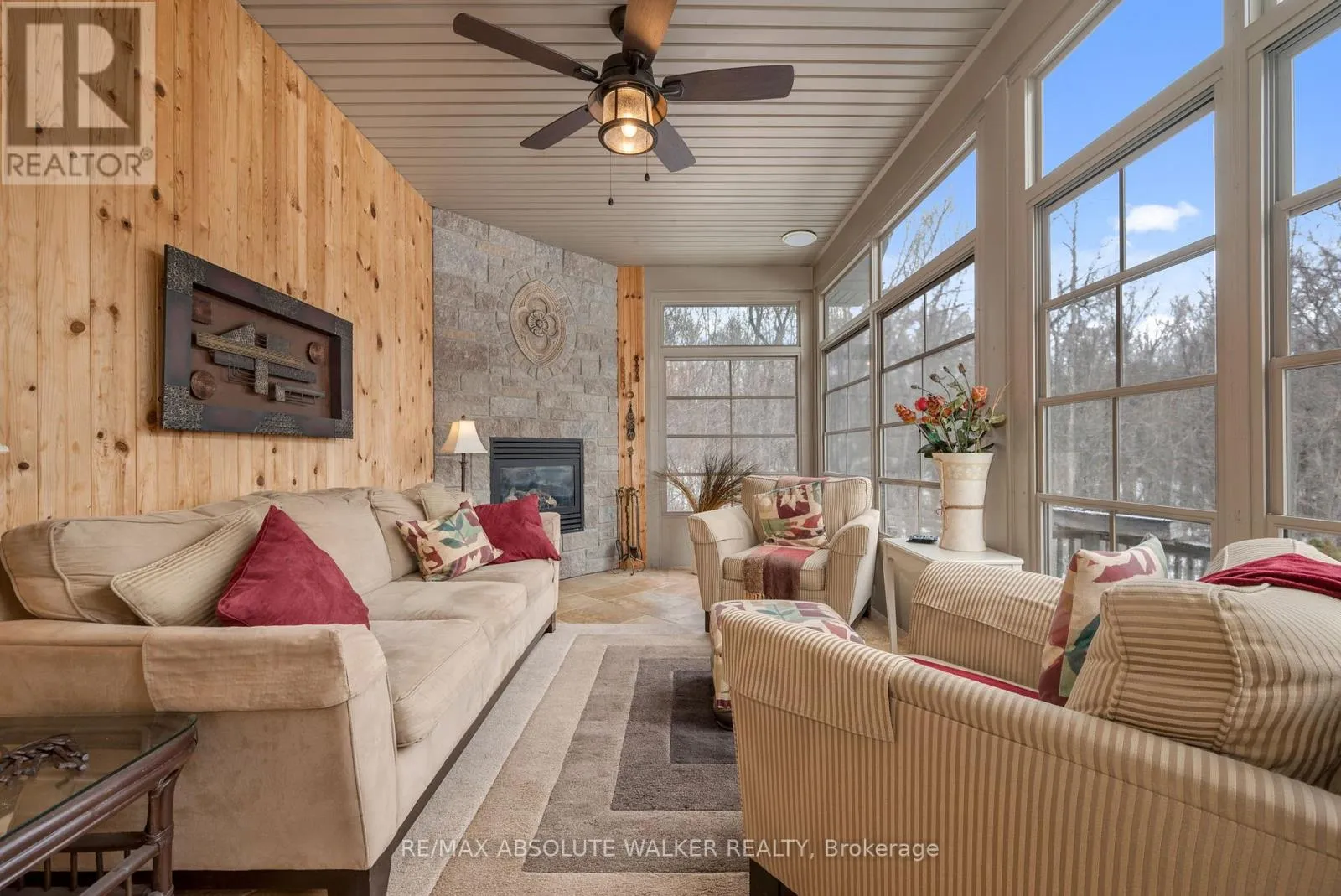 Cross Streets: Mitch Owens and 8th Line Rd. ** Directions: Mitch Owens to 8th Line Rd. to Adam Baker. Set on a private, wooded 1.97-acre executive lot just 20 minutes from downtown Ottawa, this custom Corvinelli bungalow features over 4,800 sq.ft. of thoughtfully designed finished living space with 3+2 bedrooms and 3 full bathrooms. An extra-wide foyer welcomes you into beautifully appointed principal rooms. The living room impresses with 11ft ceilings, architectural mouldings, a warm fireplace, and expansive windows showcasing forest views. A wet bar with a beverage fridge and wine storage adds the perfect touch for entertaining while the formal dining room, framed by decorative columns, features a custom coved ceiling and provides an elegant setting for gatherings. At the heart of the home is a chef-inspired kitchen with granite countertops, a large centre island with seating, heated floors, JennAir double wall ovens, a gas cooktop, and custom maple cabinetry. A spacious walk-in pantry offers excellent storage. Just beyond, the three-season sunroom with a fireplace overlooks the landscaped gardens and deck, creating a warm and inviting retreat. The private primary suite offers rich hardwood flooring, large windows, a walk-in closet, and a spa-like ensuite with heated floors, a double vanity, and an oversized walk-in shower with dual shower heads. An additional main floor bedroom, a full bathroom, and a well-designed laundry room with custom cabinetry complete this level. A bonus room above the garage offers the perfect space for teenage retreat, guest room, or studio. The walk-out lower level is ideal for guests or multigenerational living with a bright family room, accessory kitchen, two bedrooms, a full bathroom with heated floors, plus flexible spaces including a home theatre/gym, office, and workshop. Additional highlights include a three-car garage with 9ft doors and EV charger connection, a 17kW Generac generator, and upgraded insulated siding (2024). An exceptional property offering luxury, space, craftsmanship and privacy. (id:27476)